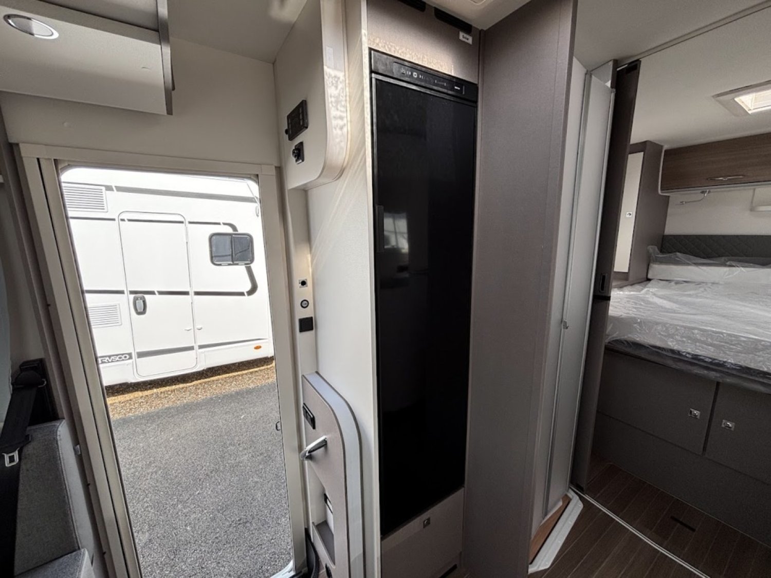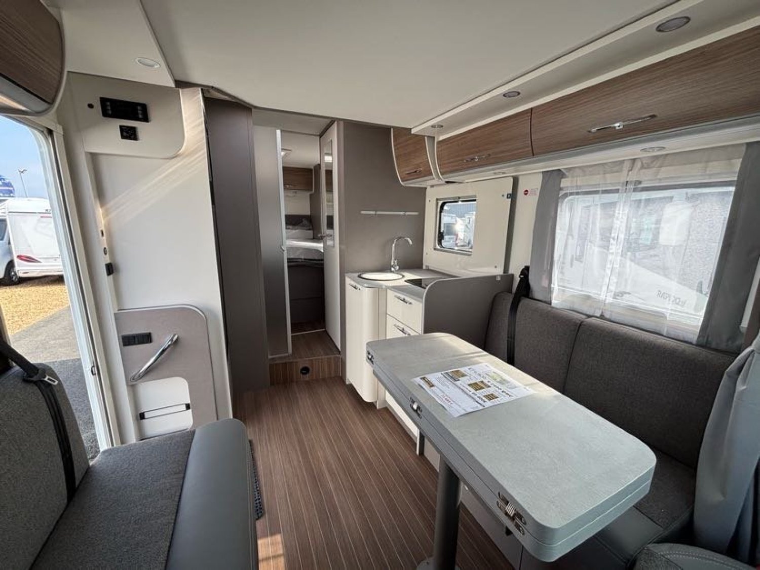 Cuisine en L, Douche indépendante, Lit central, lit pavillon, Salon avant banquettes face à face, Salon avant sièges pivotants, Soute.