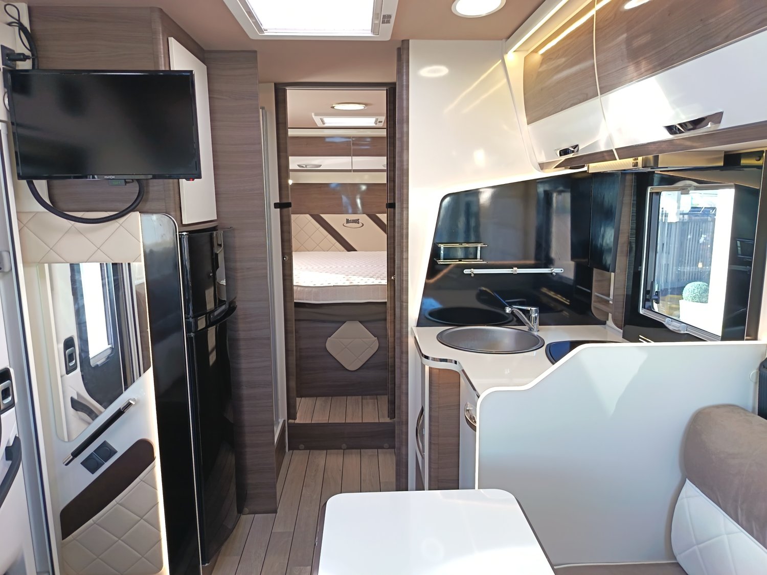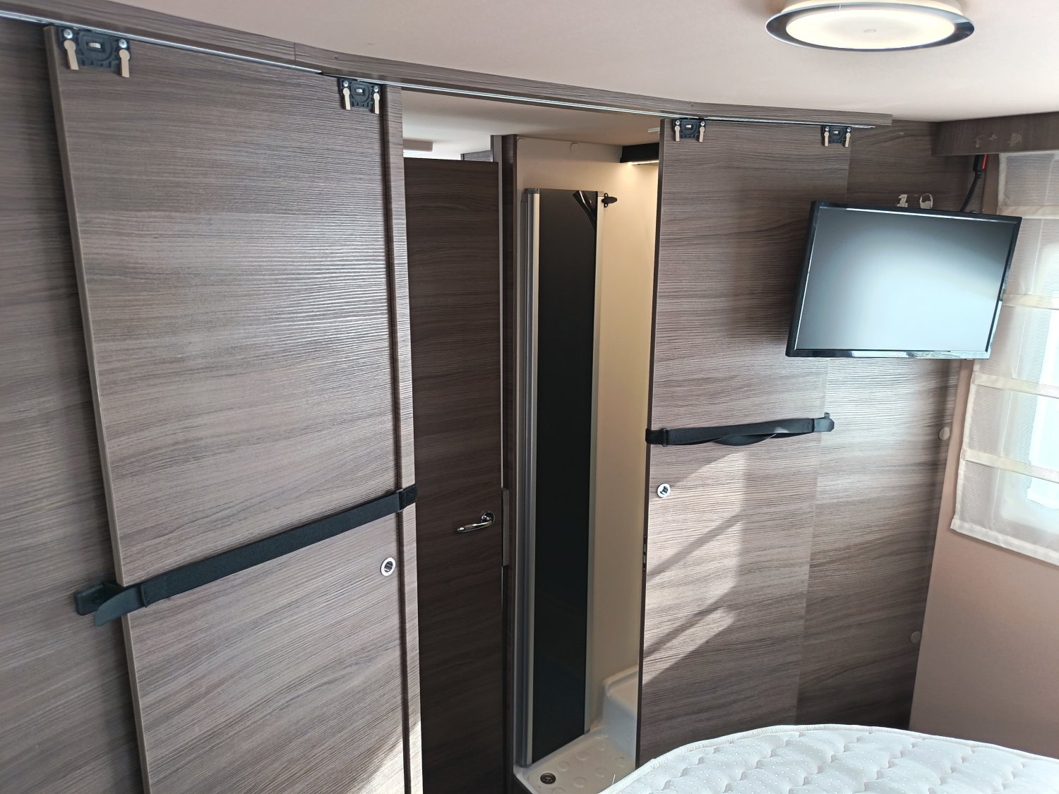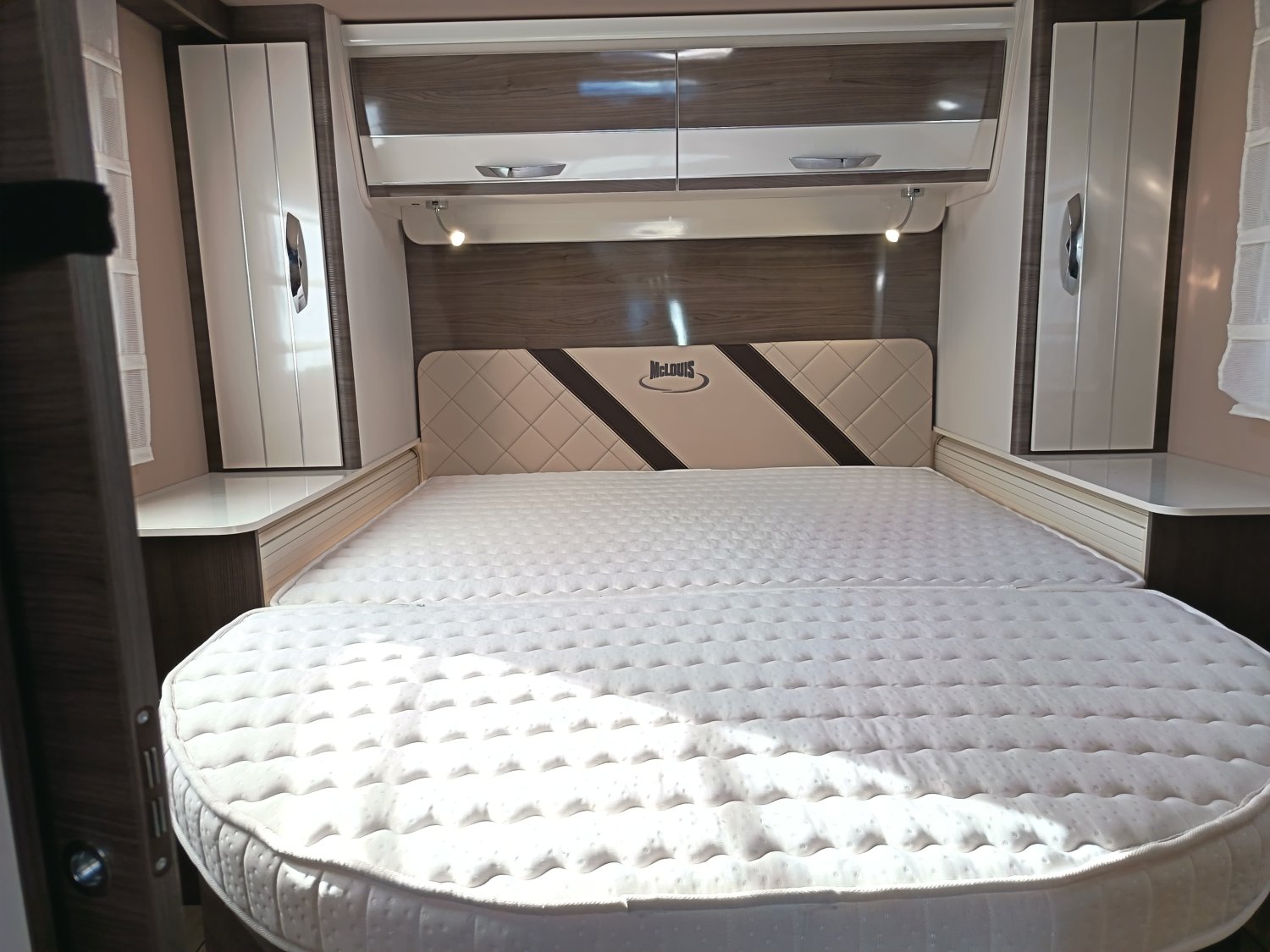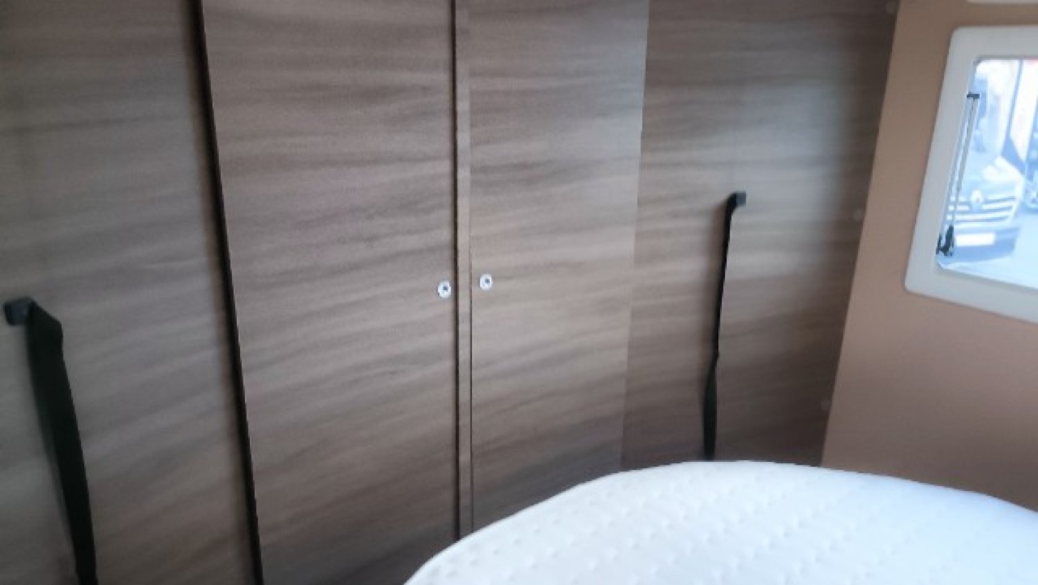 Très bel intégral d'occasion avec un très grand lit central sur soute garage. Possibilité de monté ou descendre le lit électriquement. Le salon en face à face offre un séjour de grande dimension. La douche est séparée du toilette, l'espace salle de bain dispose du double cloisonnement et la cuisine est équipée du frigo avec congélateur.