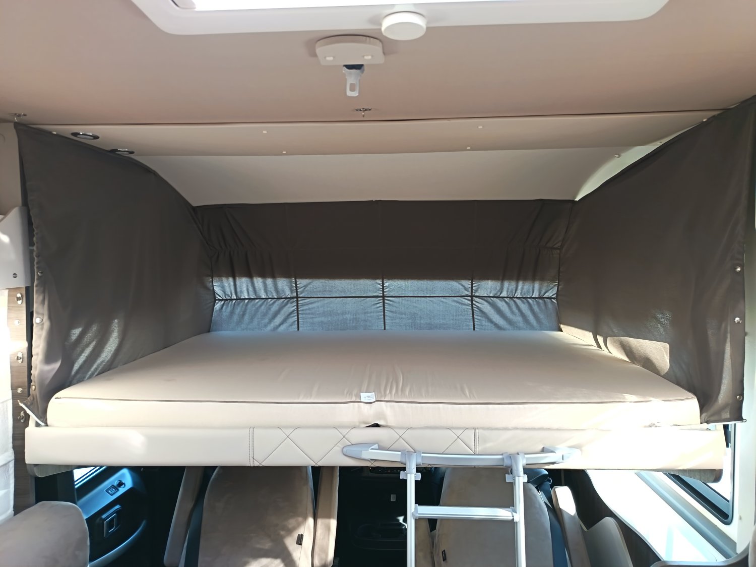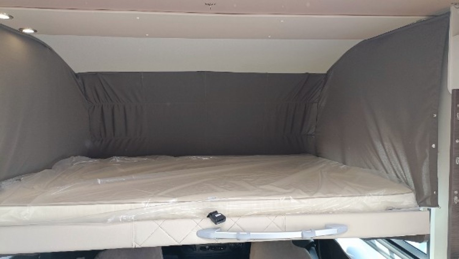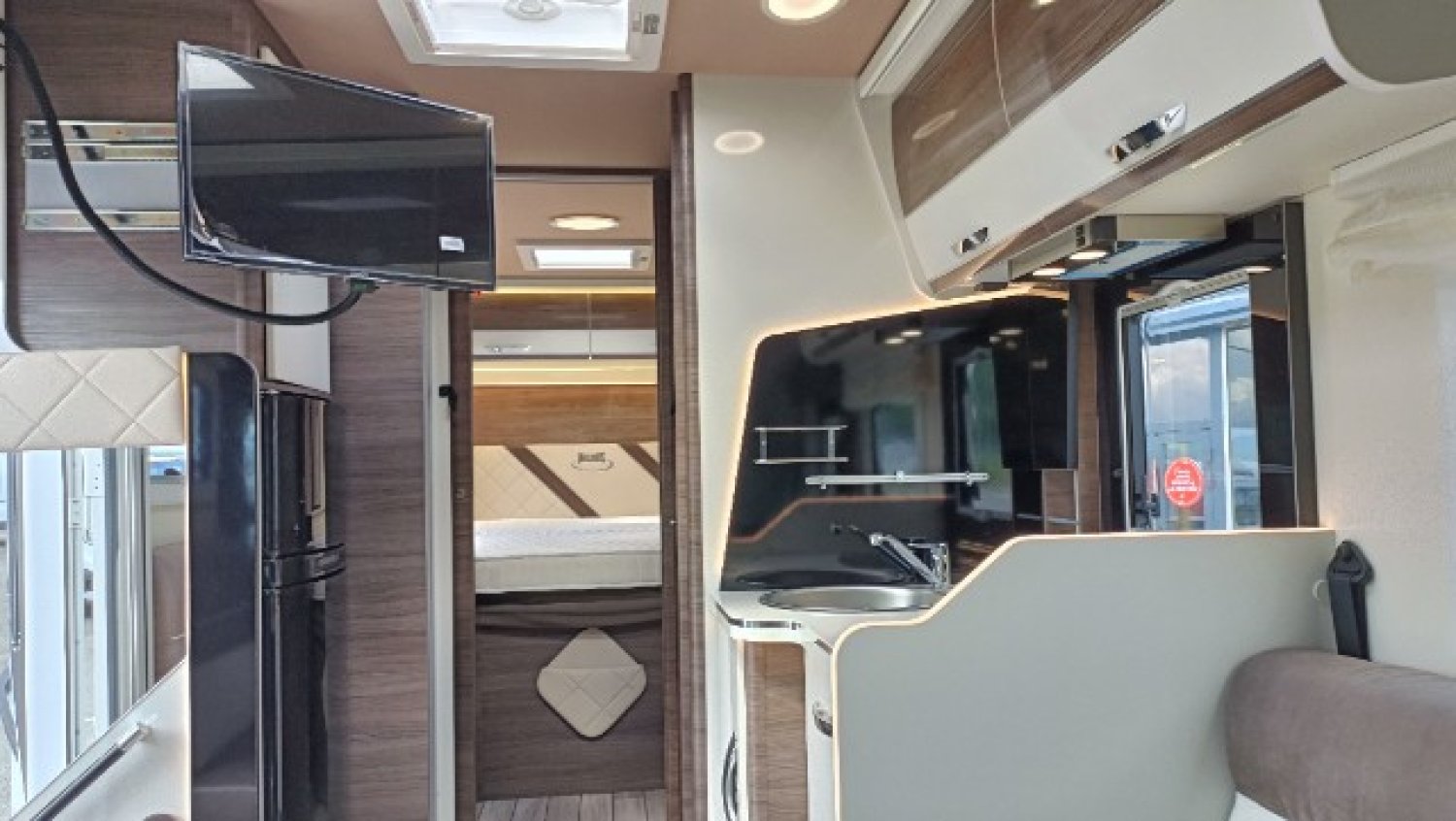 Très bel intégral d'occasion avec un très grand lit central sur soute garage. Possibilité de monté ou descendre le lit électriquement. Le salon en face à face offre un séjour de grande dimension. La douche est séparée du toilette, l'espace salle de bain dispose du double cloisonnement et la cuisine est équipée du frigo avec congélateur.
