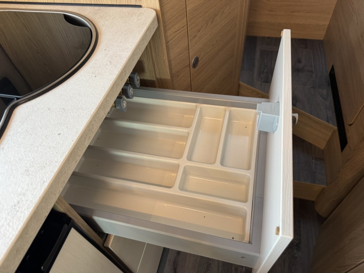 Avec seulement 6,77 m de long, il offre une excellente facilité de conduite tout en conservant une implantation très recherchée avec lits jumeaux, une grande soute garage traversante et un espace de vie lumineux grâce au SkyDome.
