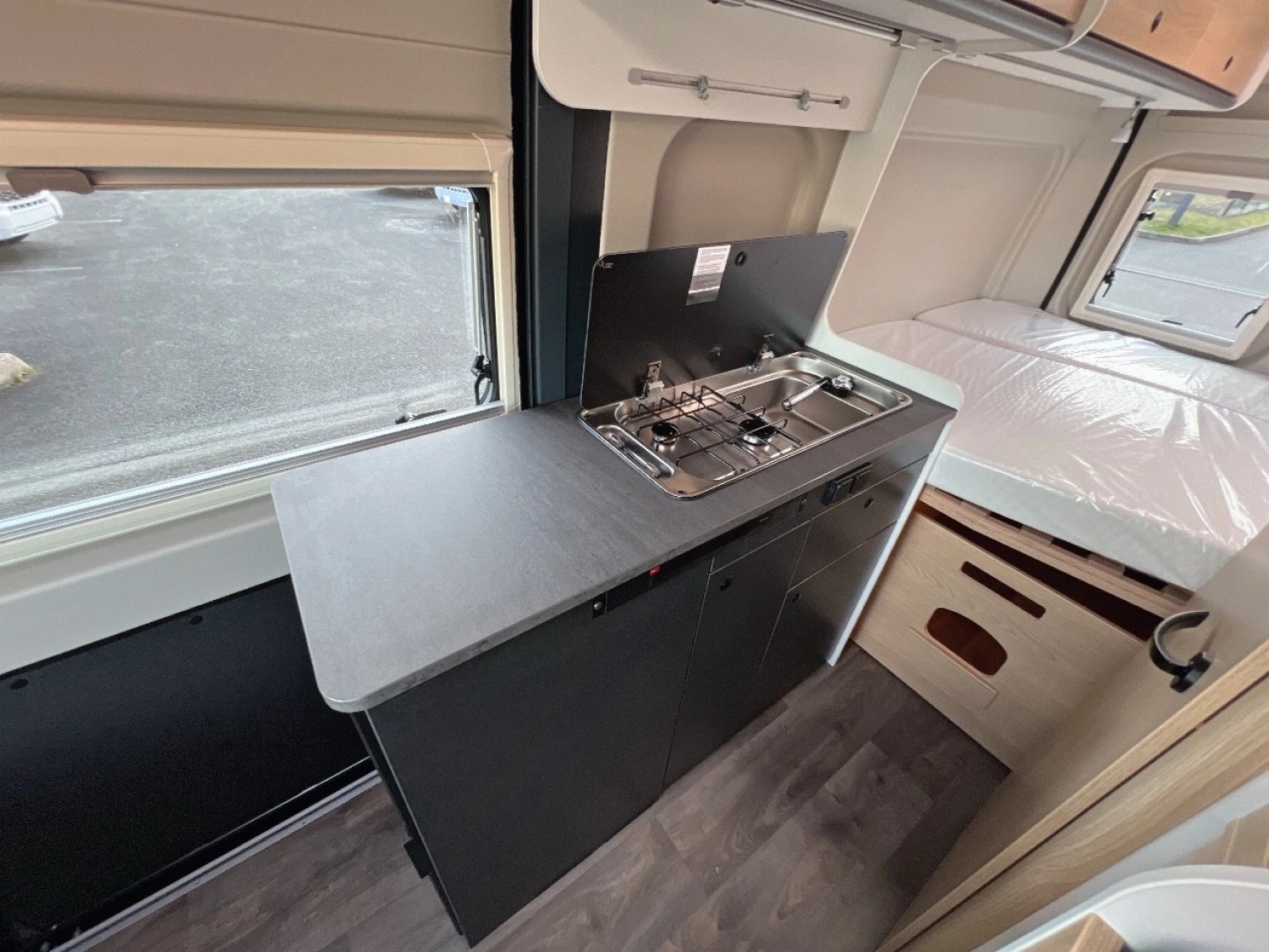 - Pack Soleil (Lanterneau Midi-Heki 700 x 500 au dessus de la dînette, Pack Douche (pommeau de douche extractible, rideau de douche, rail de guidage, support pour pommeau),