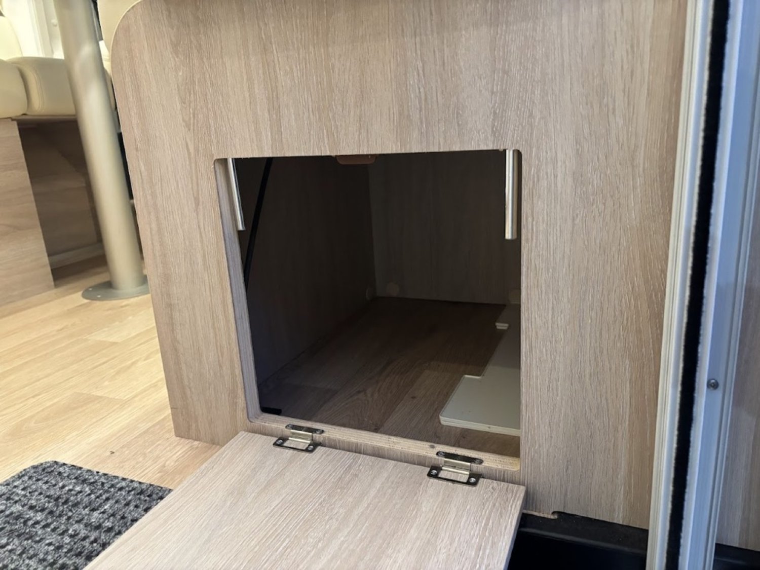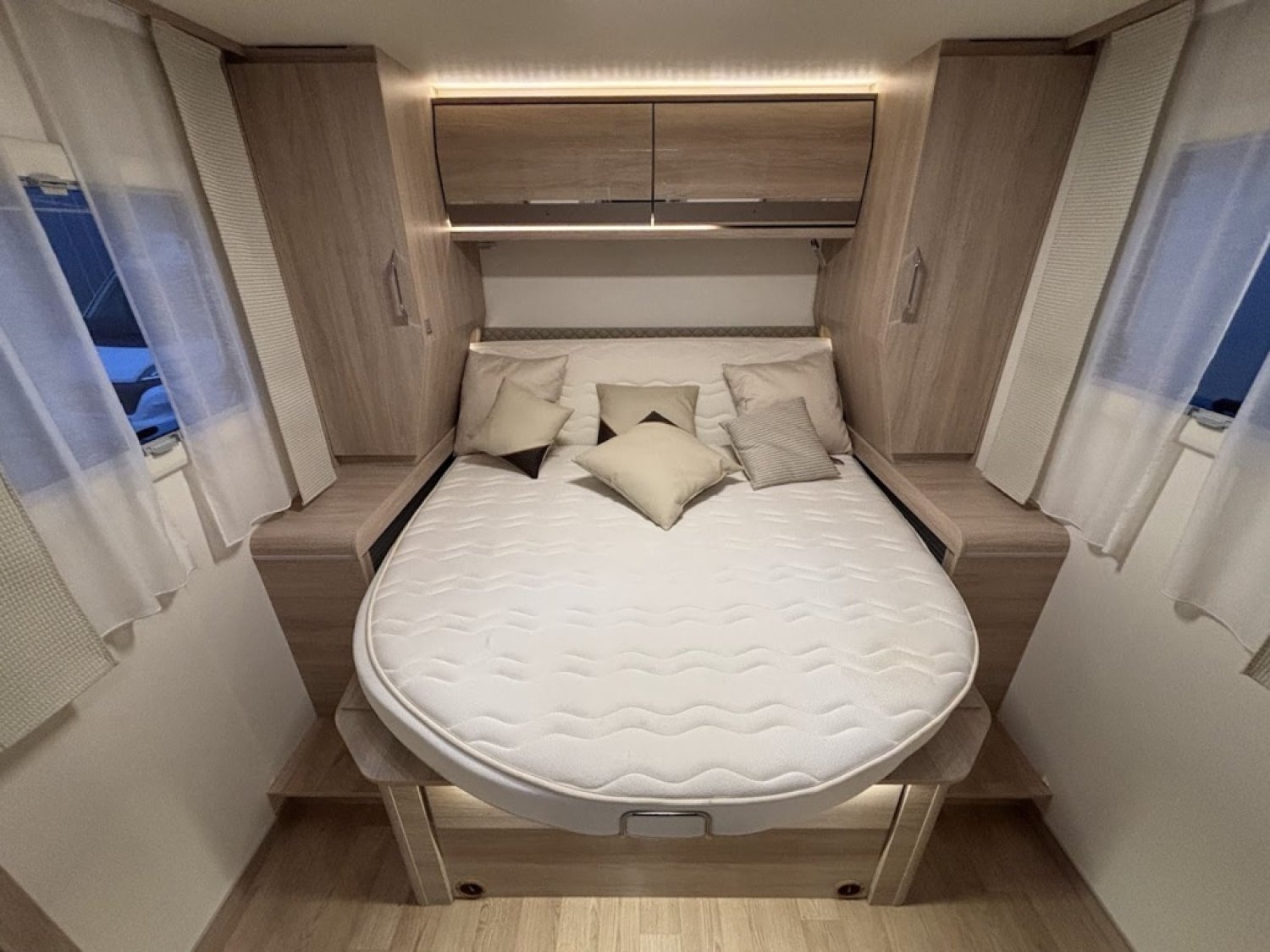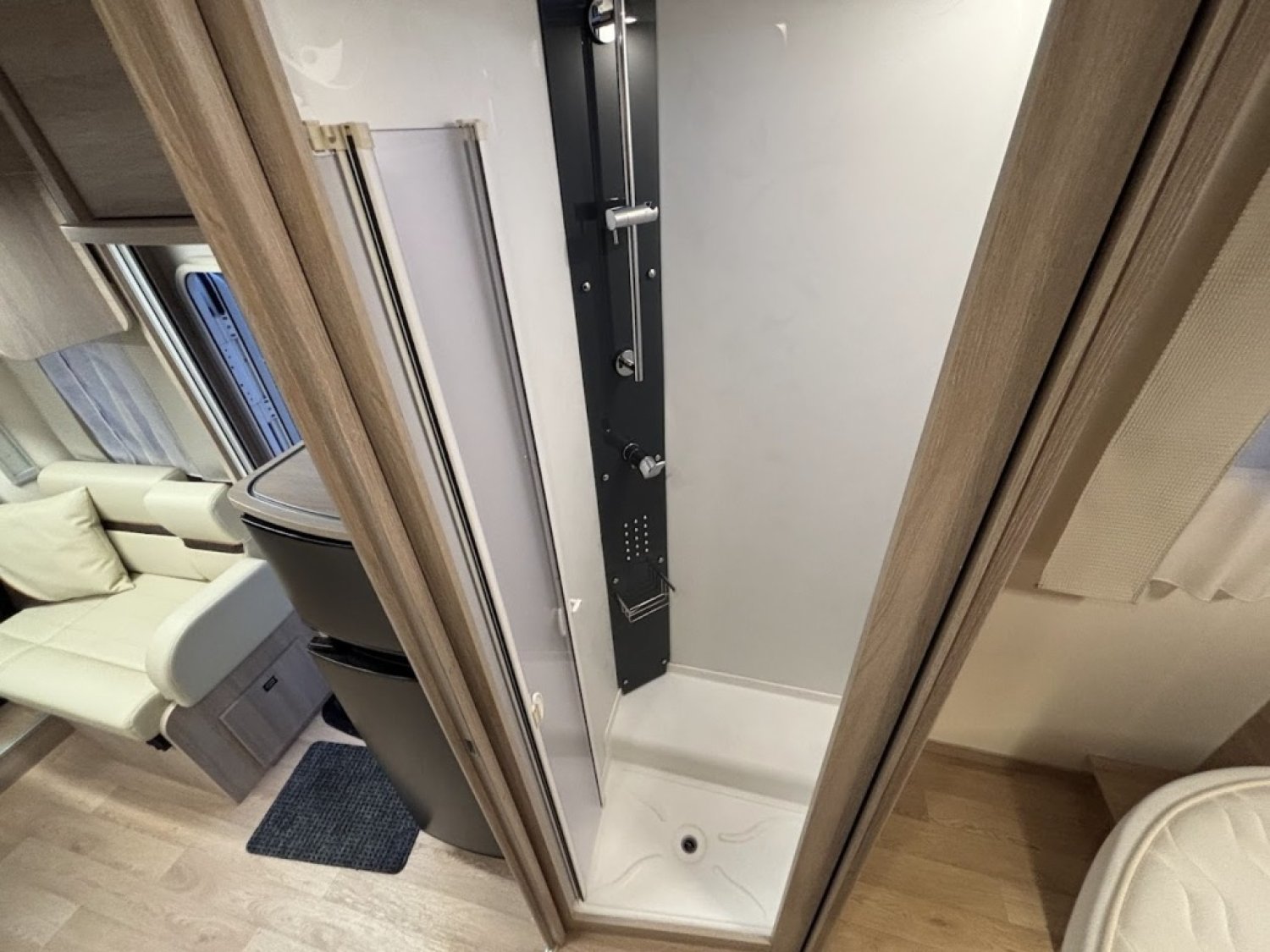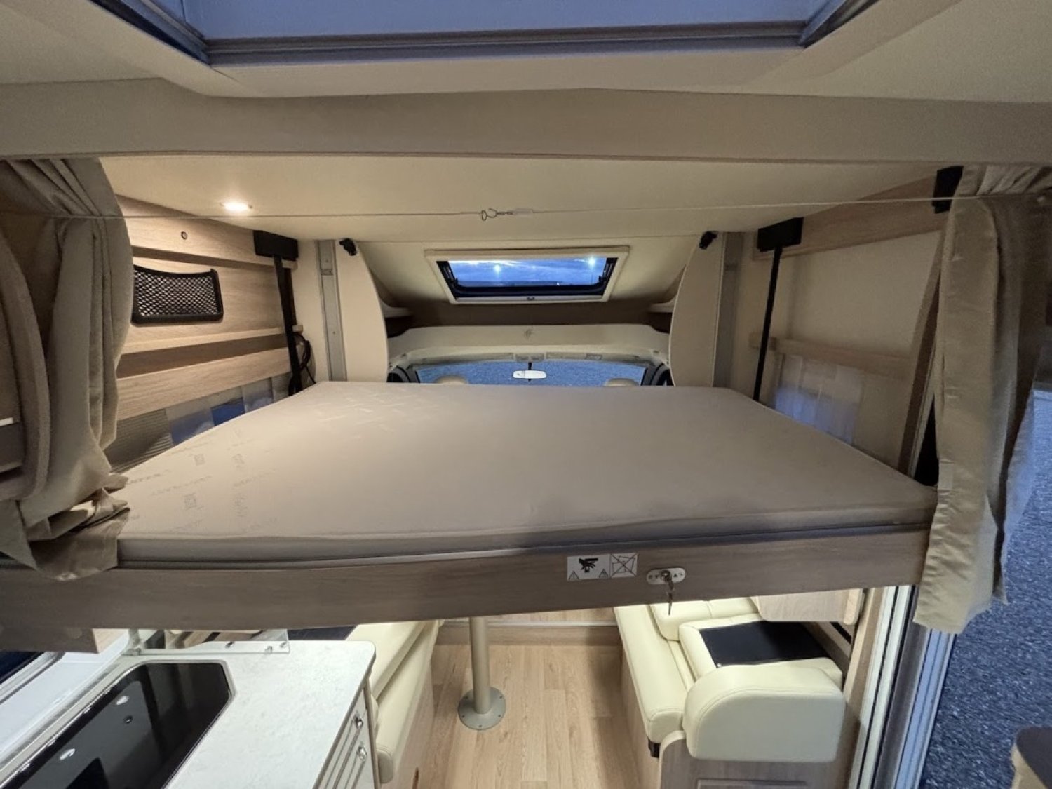 Cuisine en L, Douche indépendante, Lit central, lit pavillon, Salon avant banquettes face à face, Salon avant sièges pivotants, Soute réglable en hauteur, WC Cassette.