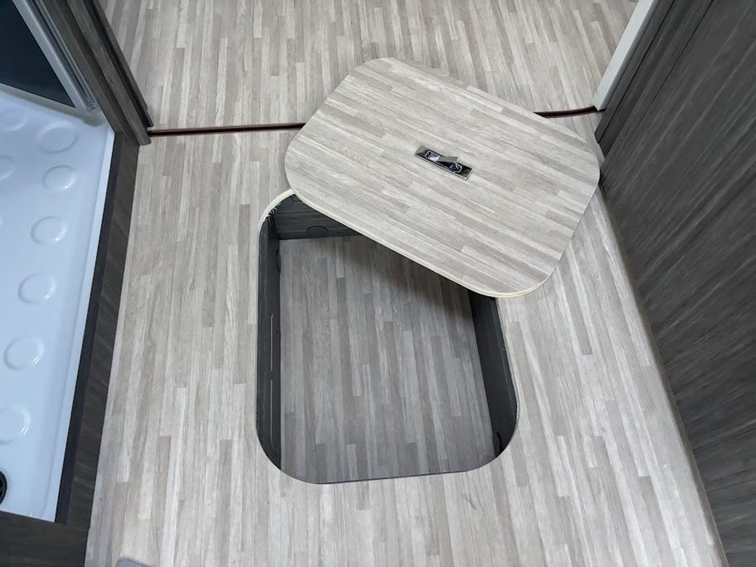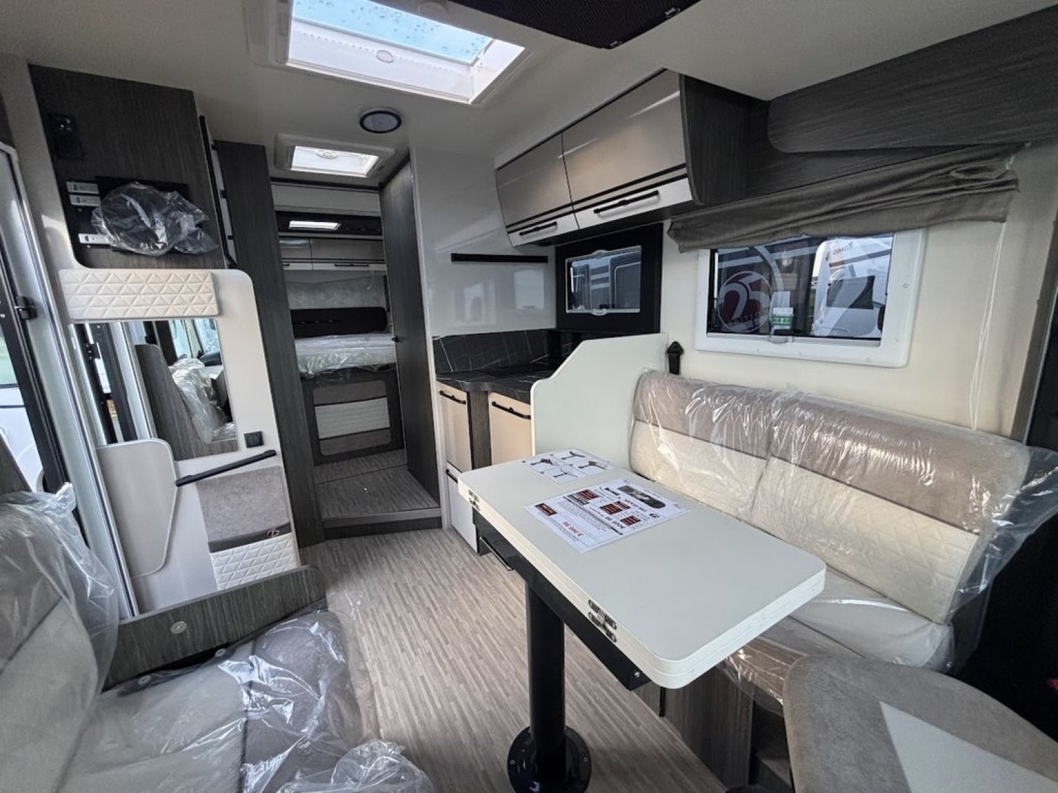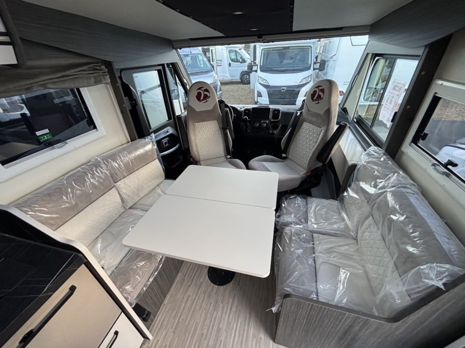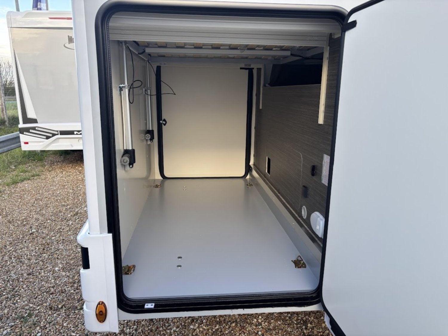Cuisine en L, Douche indépendante, Grande soute, Lit central, lit pavillon, Salon avant banquettes face à face, Salon avant sièges pivotants, Soute réglable en hauteur, WC Cassette.
