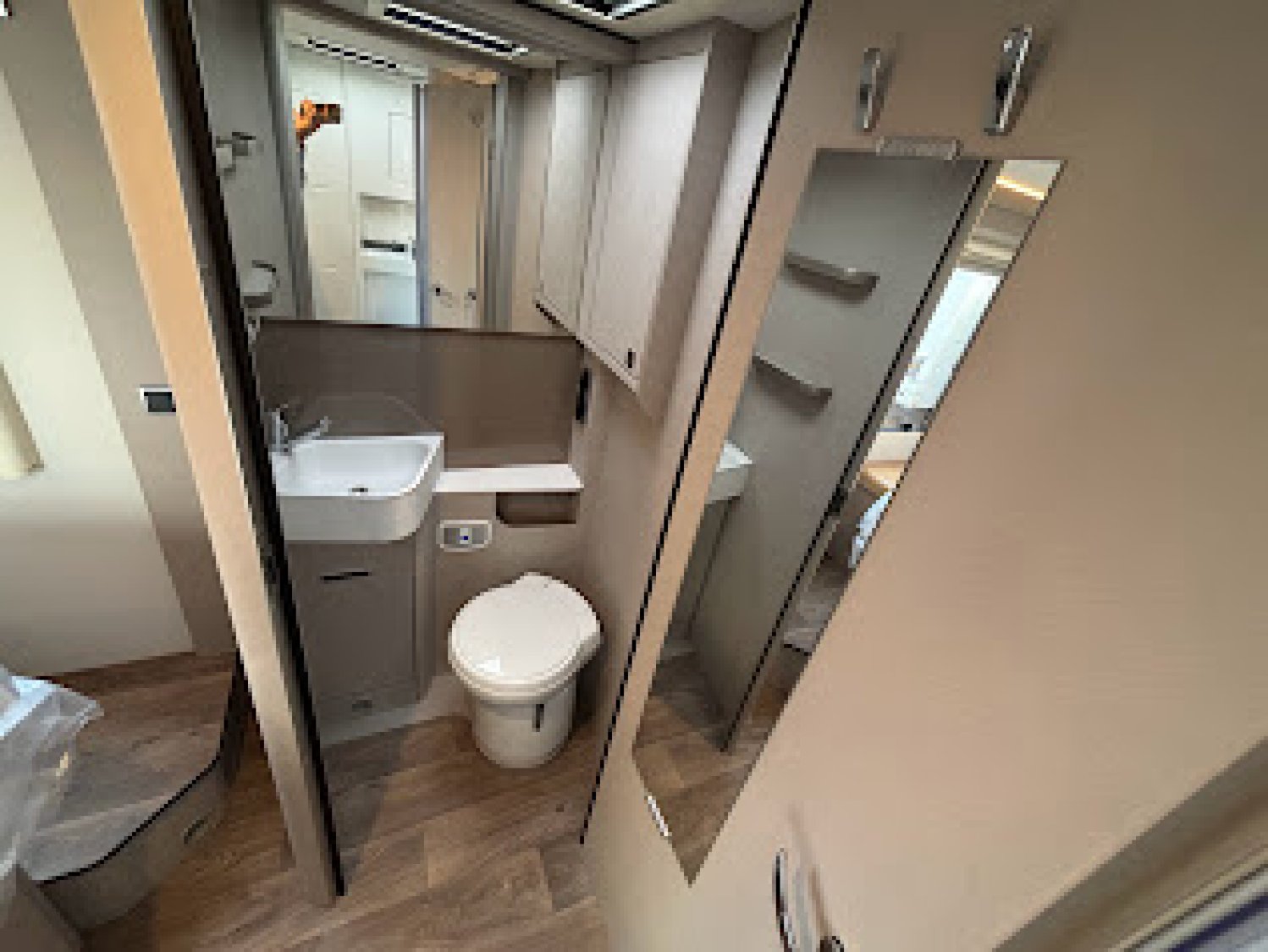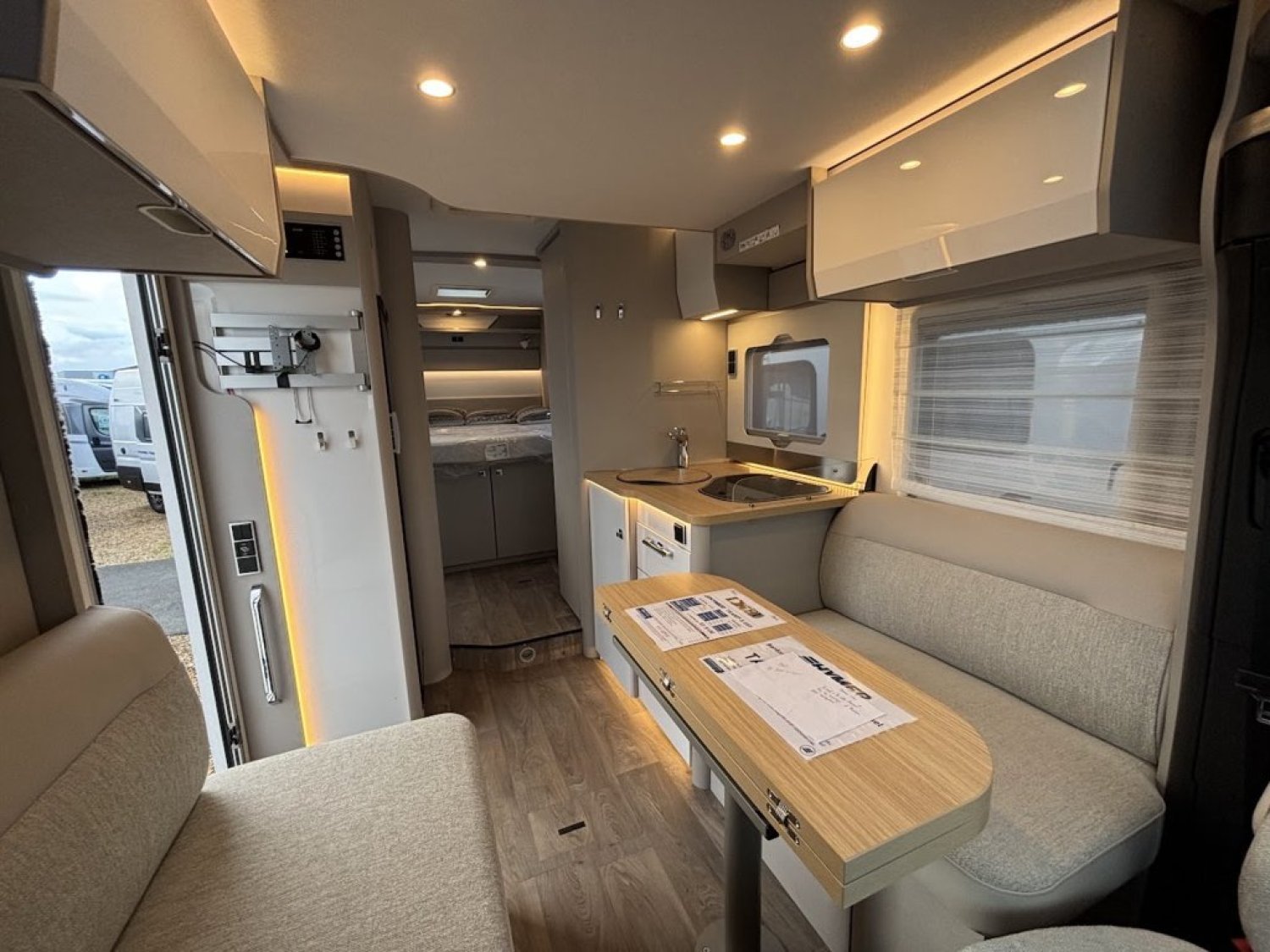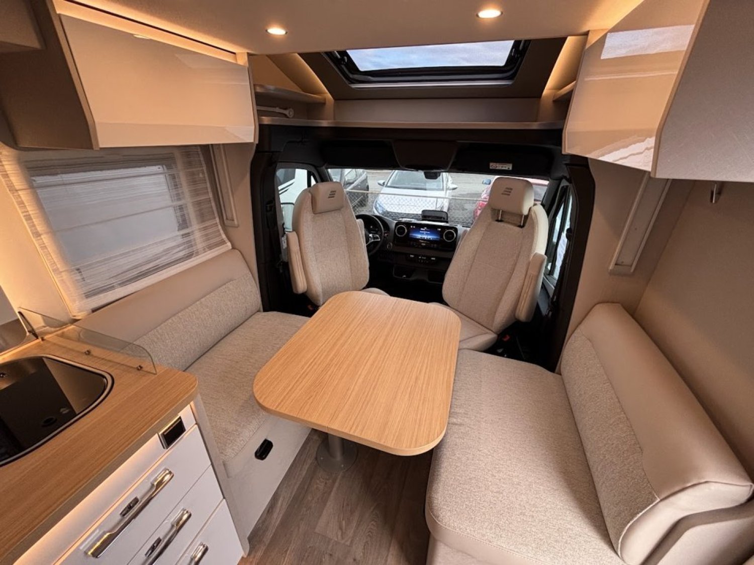 Cuisine en L, Douche indépendante, Lit central, lit pavillon, Salon avant banquettes face à face, Salon avant sièges pivotants, Soute, WC Cassette.