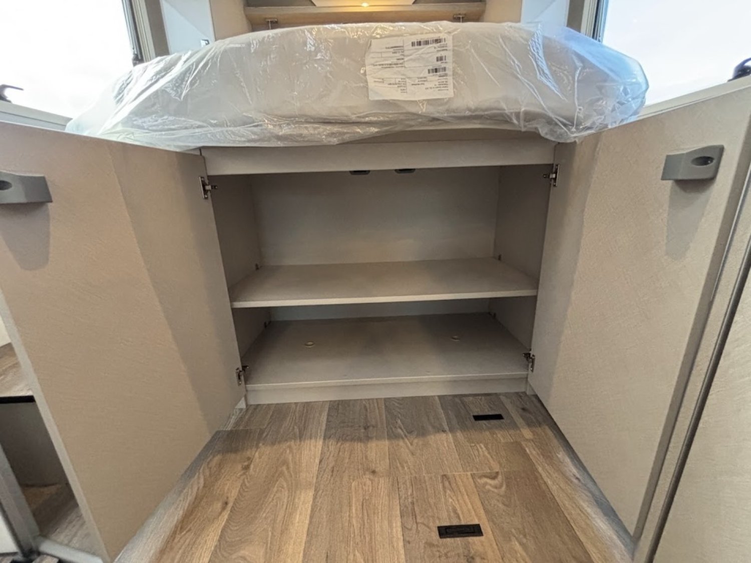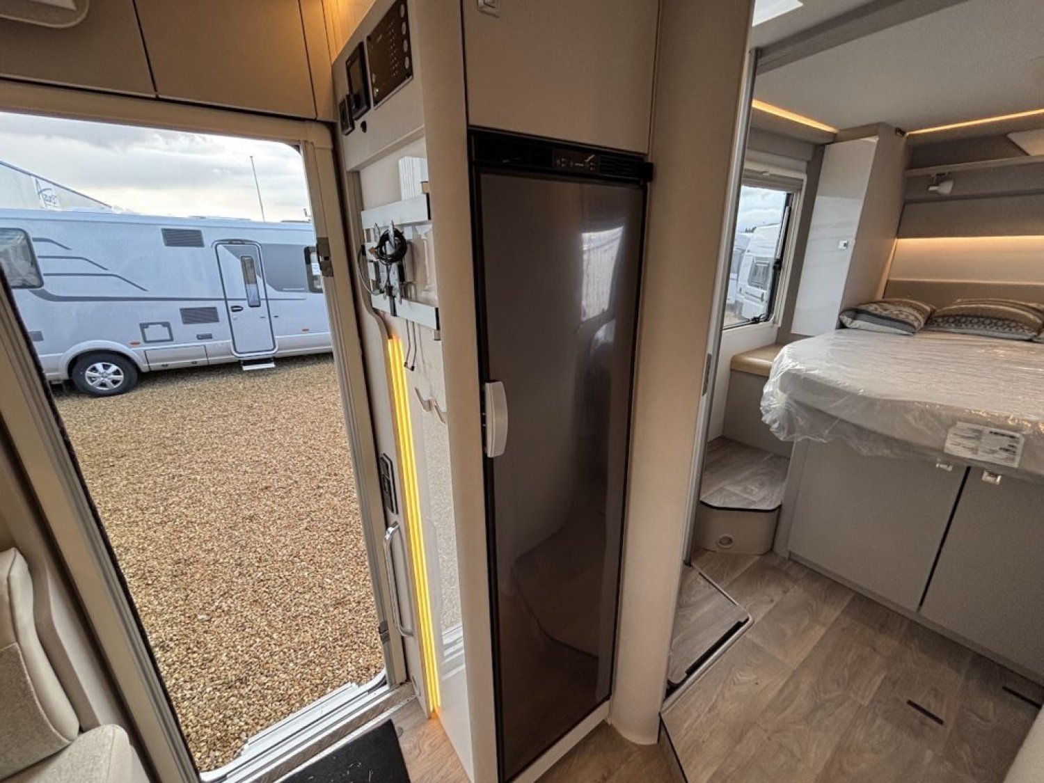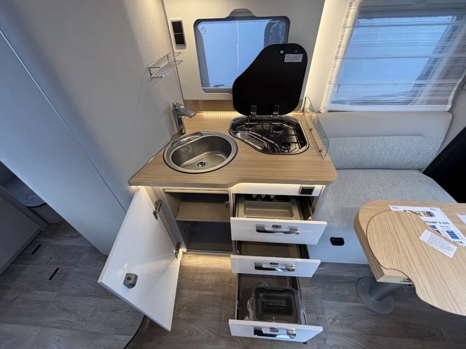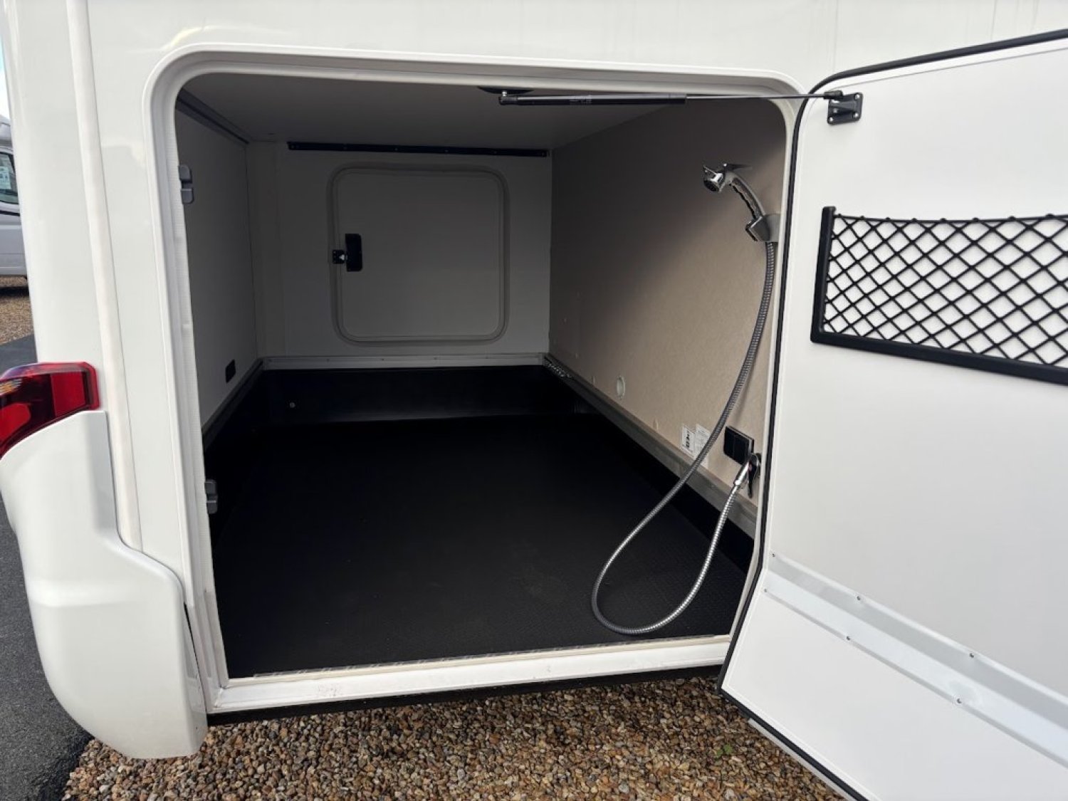 Cuisine en L, Douche indépendante, Lit central, lit pavillon, Salon avant banquettes face à face, Salon avant sièges pivotants, Soute, WC Cassette.