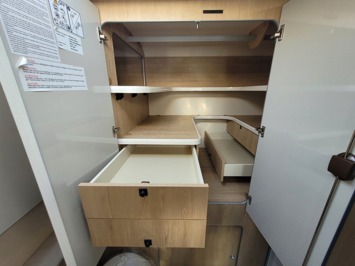 Cuisine en long, Douche indépendante, Lit dînette avant, lit pavillon, Salon avant banquettes face à face, Salon avant sièges pivotants, WC Cassette.