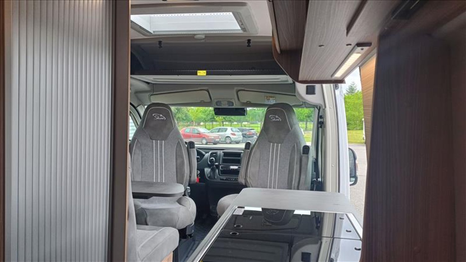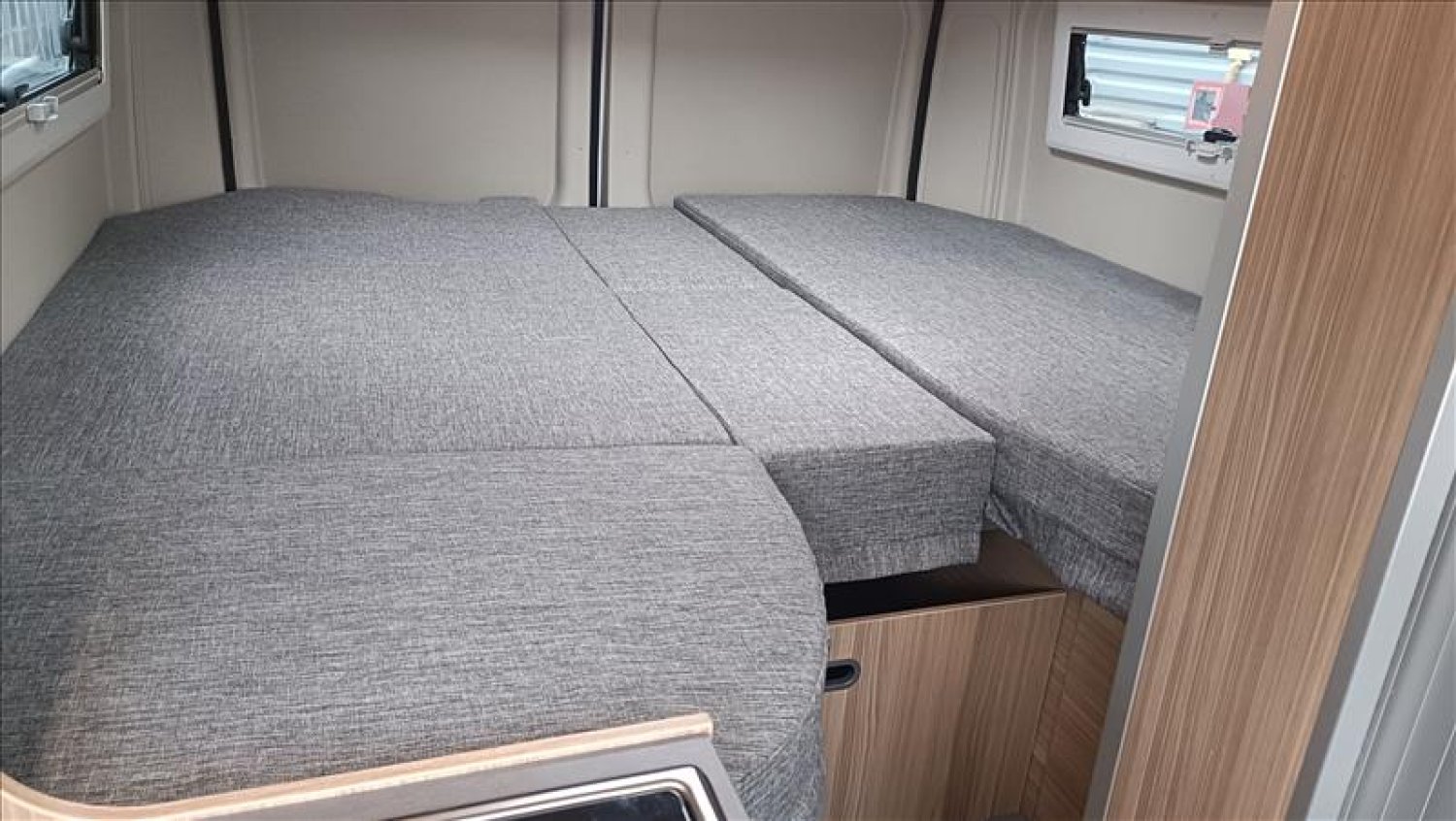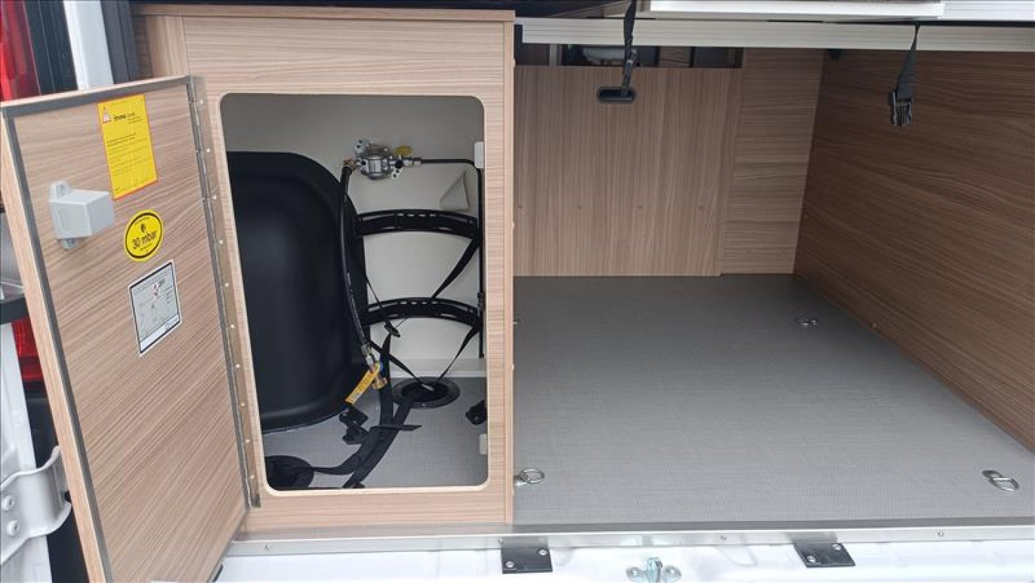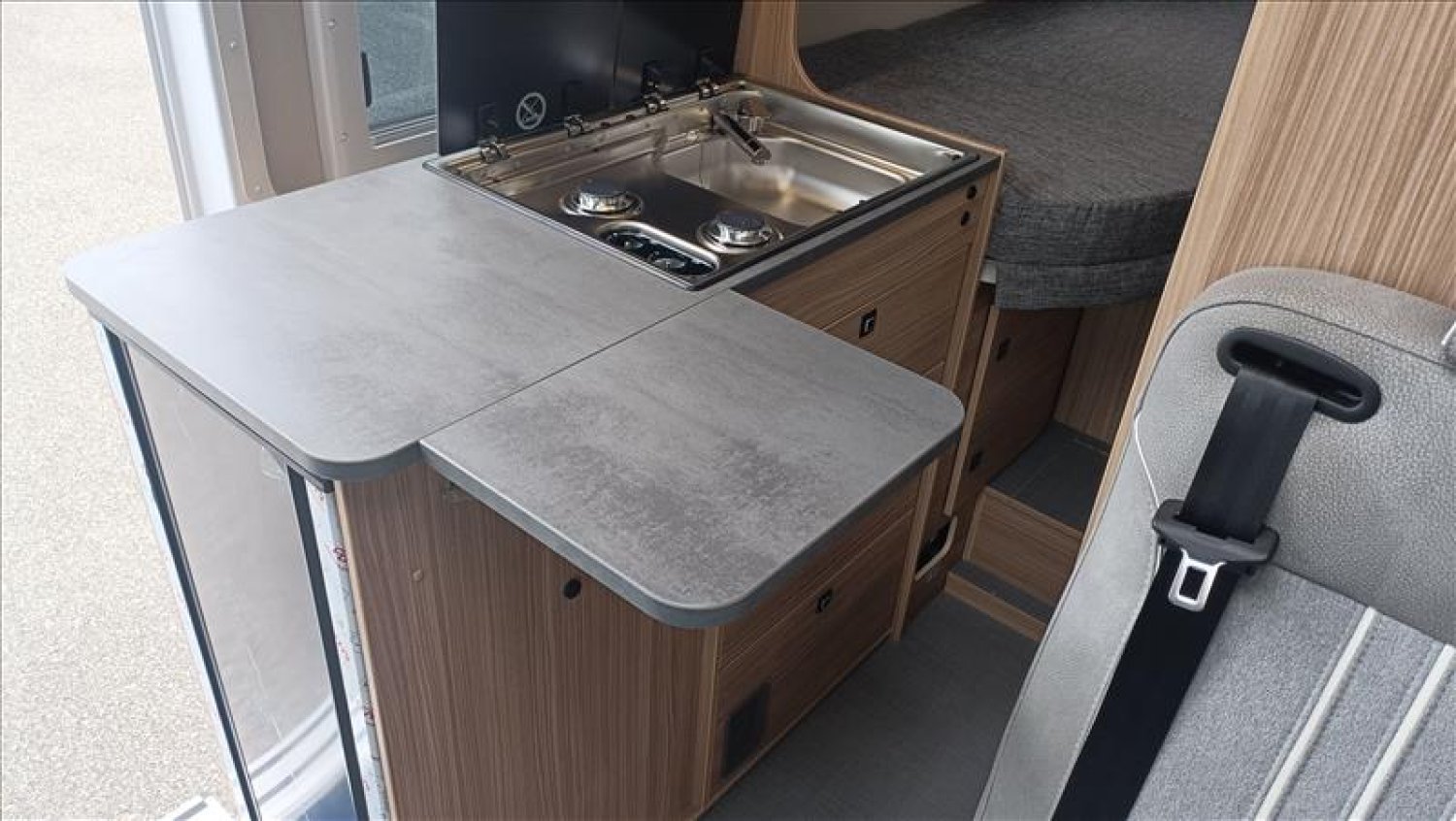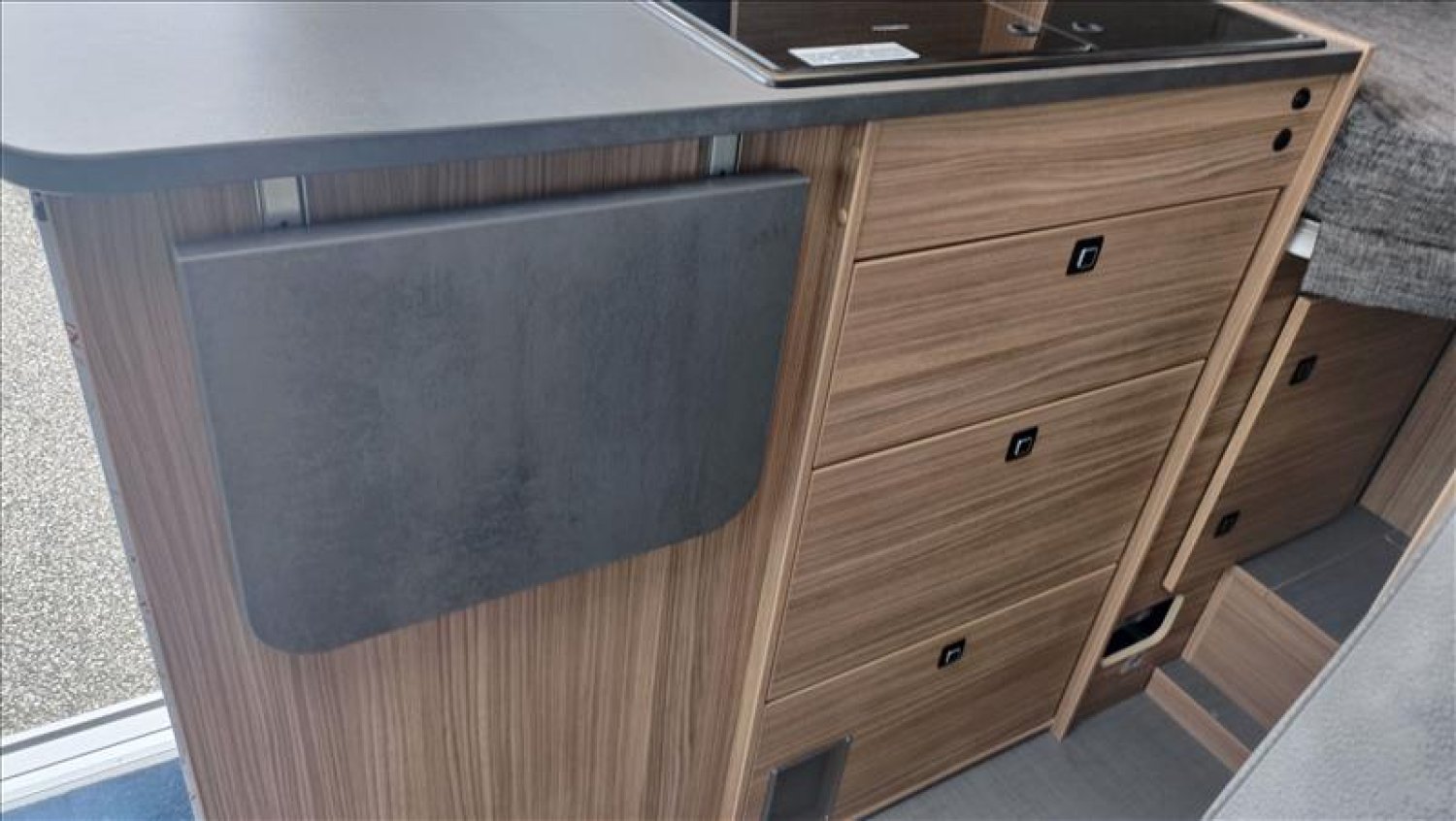 Fourgon aménagé du spécialiste allemand. Ce modèle en 5m99 dispose de lits jumeaux arrières. On y retrouve des rangements astucieux, une dinette innovante et une salle de bain avec paroi pivotante, une belle cuisine latérale et un grand espace de chargement sous les lits.