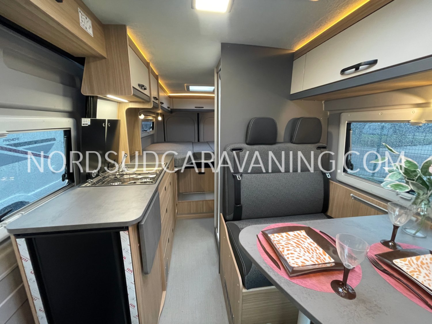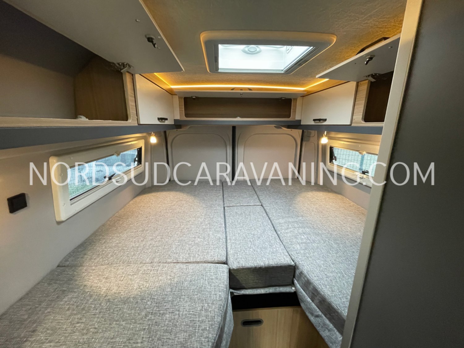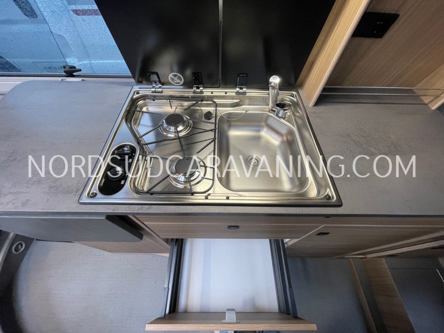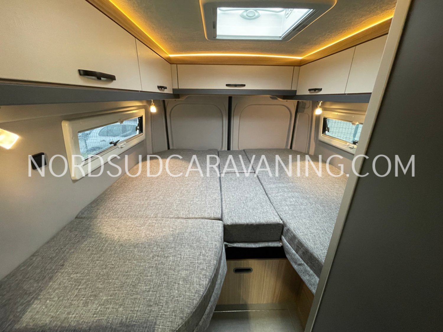 Sa dinette agréable et lumineuse pour une ambiance conviviale. Sa cuisine latérale pratique et fonctionnelle est équipée d’un réchaud 2 feux, évier, plan de travail rabattable et un réfrigérateur 98L. En face, une salle de bain avec WC, lavabo, et une douche vario. A l’arrière, ce sont des lits jumeaux, pour des nuits confortables et agréables, et plus d’espace. Sans oublier ses nombreux rangements astucieux !