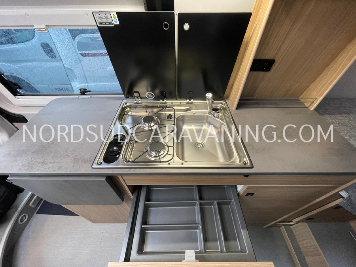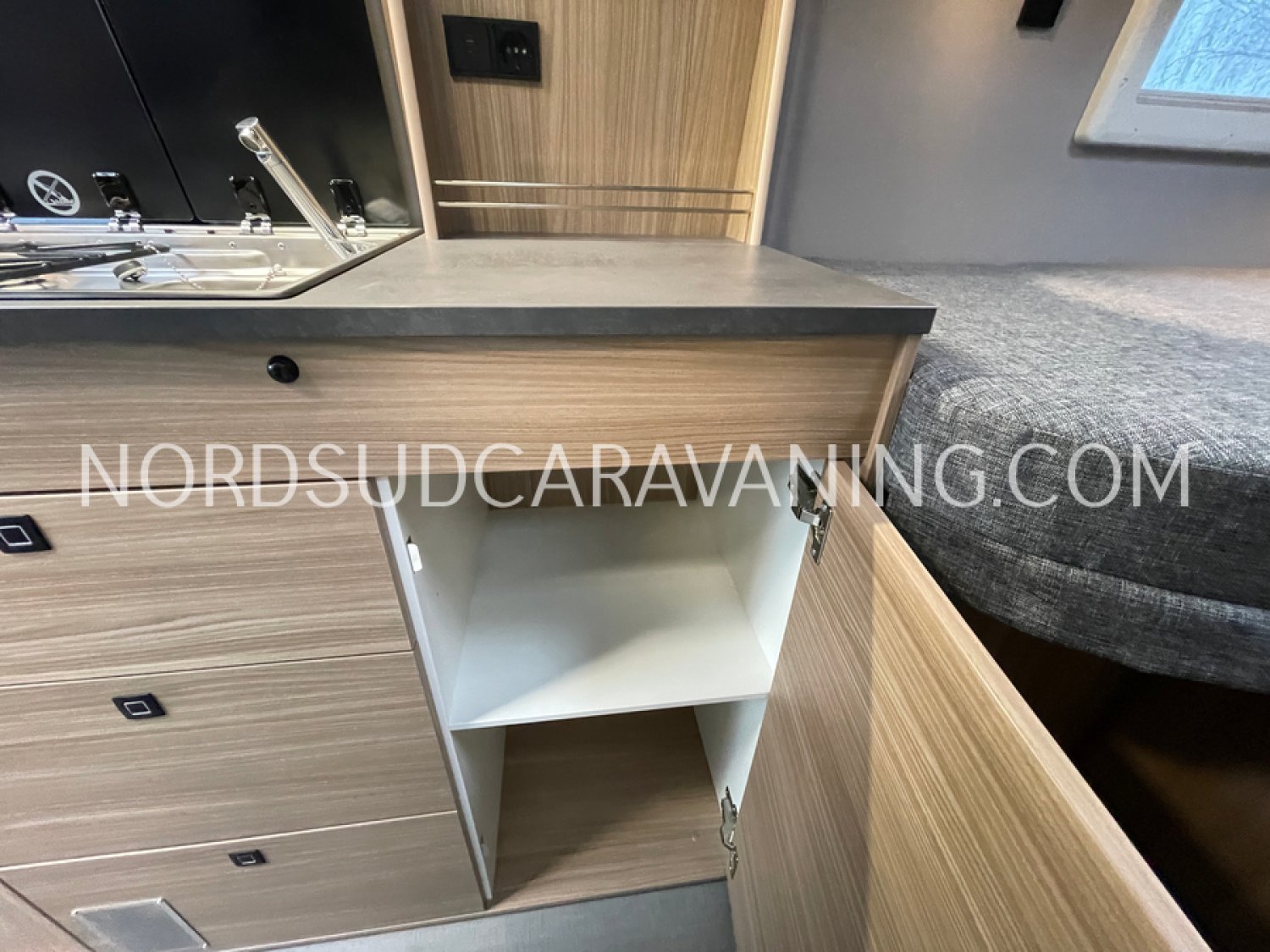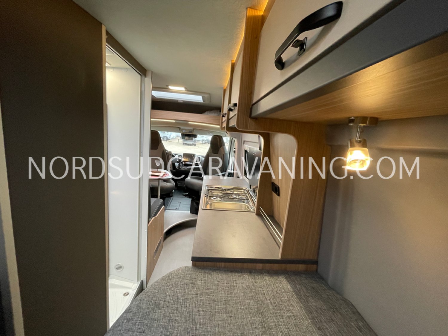 Sa dinette agréable et lumineuse pour une ambiance conviviale. Sa cuisine latérale pratique et fonctionnelle est équipée d’un réchaud 2 feux, évier, plan de travail rabattable et un réfrigérateur 98L. En face, une salle de bain avec WC, lavabo, et une douche vario. A l’arrière, ce sont des lits jumeaux, pour des nuits confortables et agréables, et plus d’espace. Sans oublier ses nombreux rangements astucieux !
