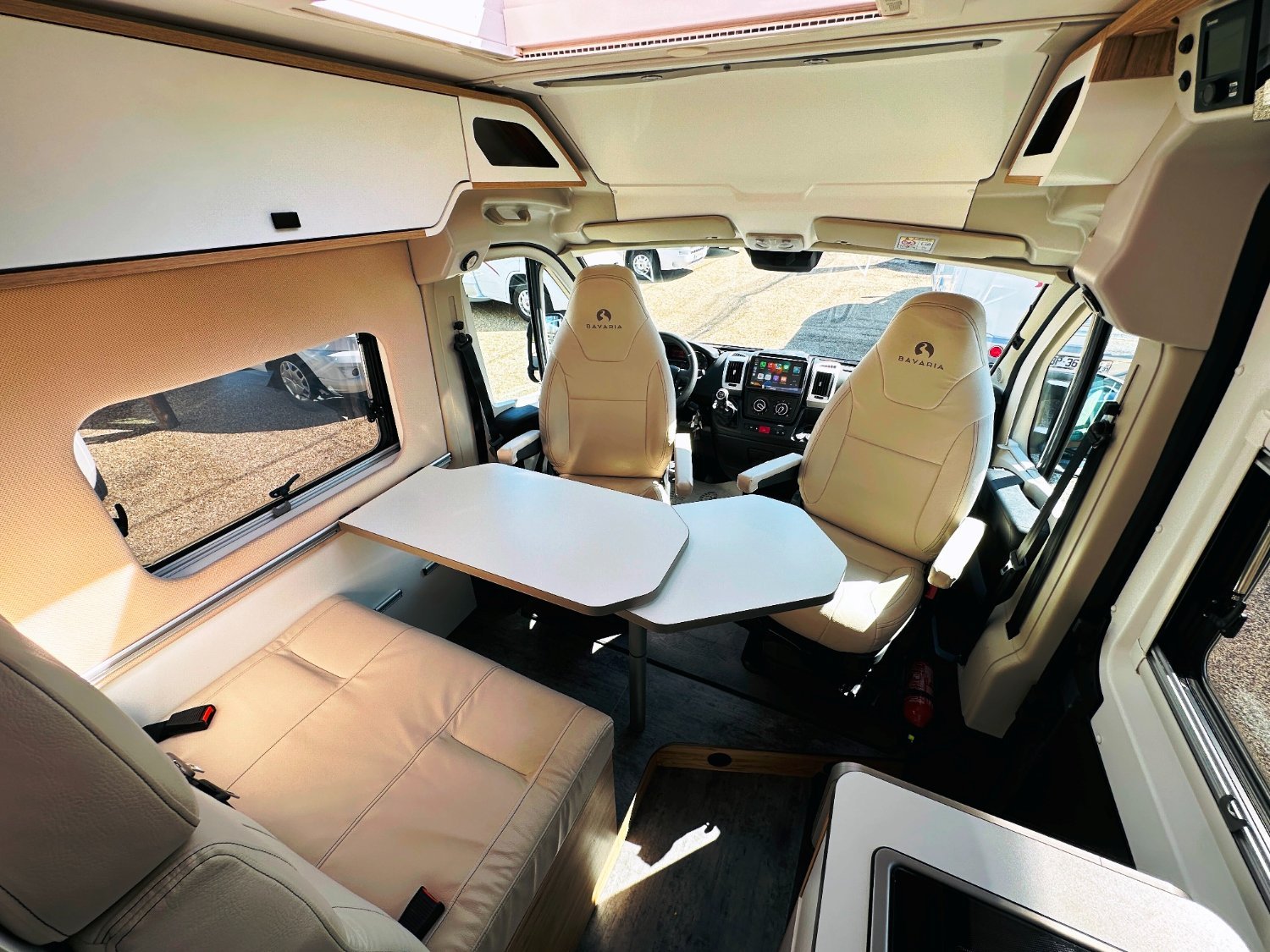 Fourgon Bavaria (6.36 M), lits jumeaux (possibilité de dégager le couloir), salle de bain modulable convertible en vaste douche, salon avant avec sièges pivotant, table centrale, cuisine droite équipée de nombreux rangements, d’un plan de travail amovible et d’un grand frigo par compression.
