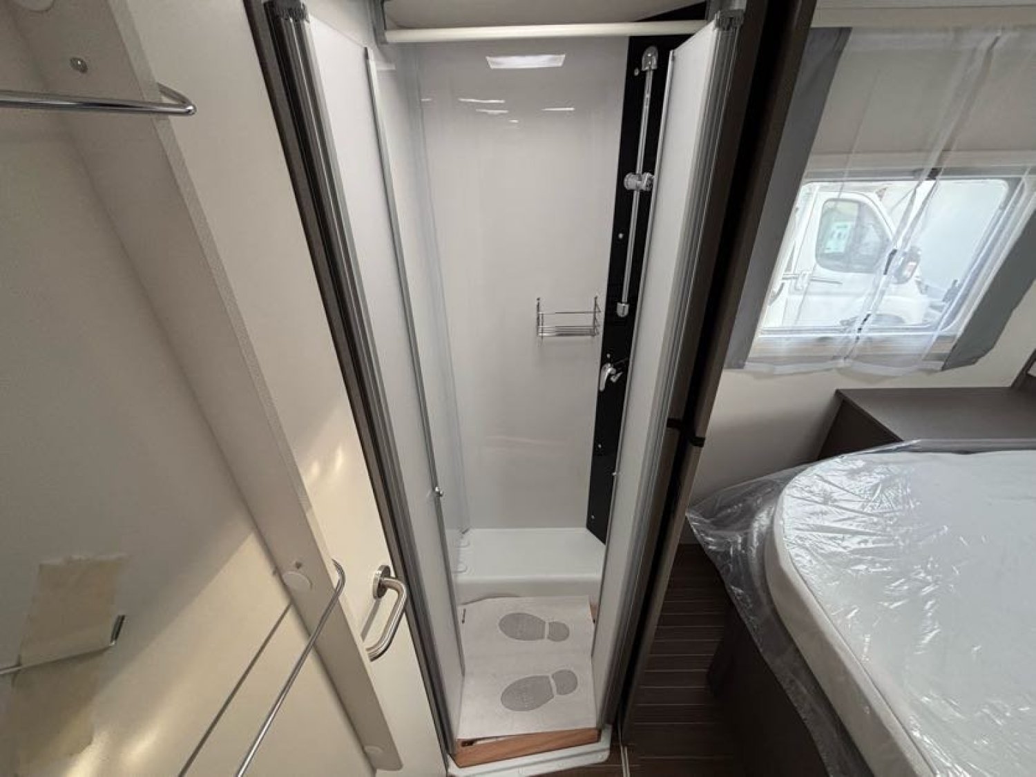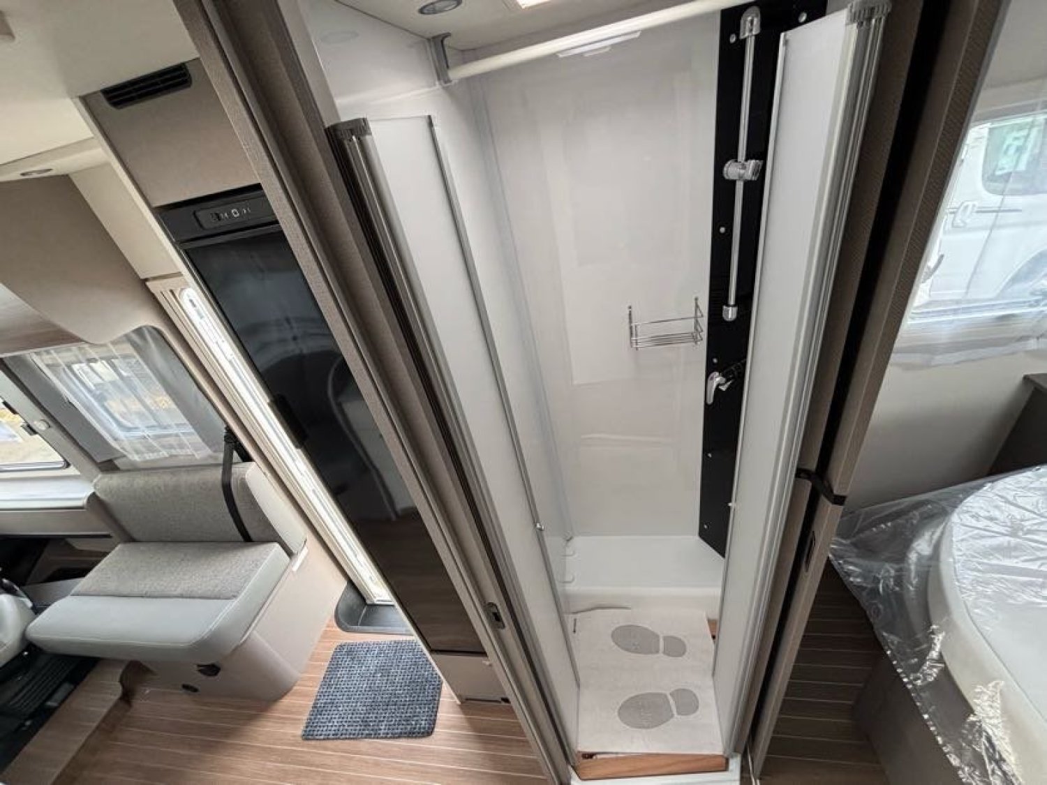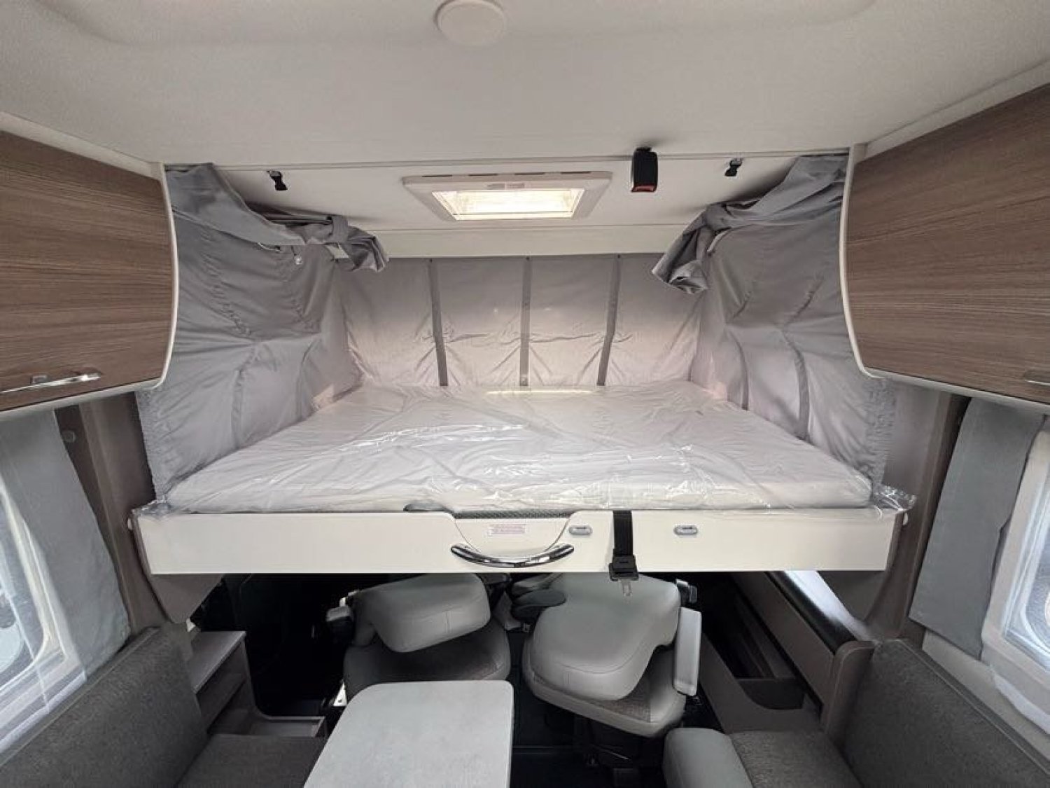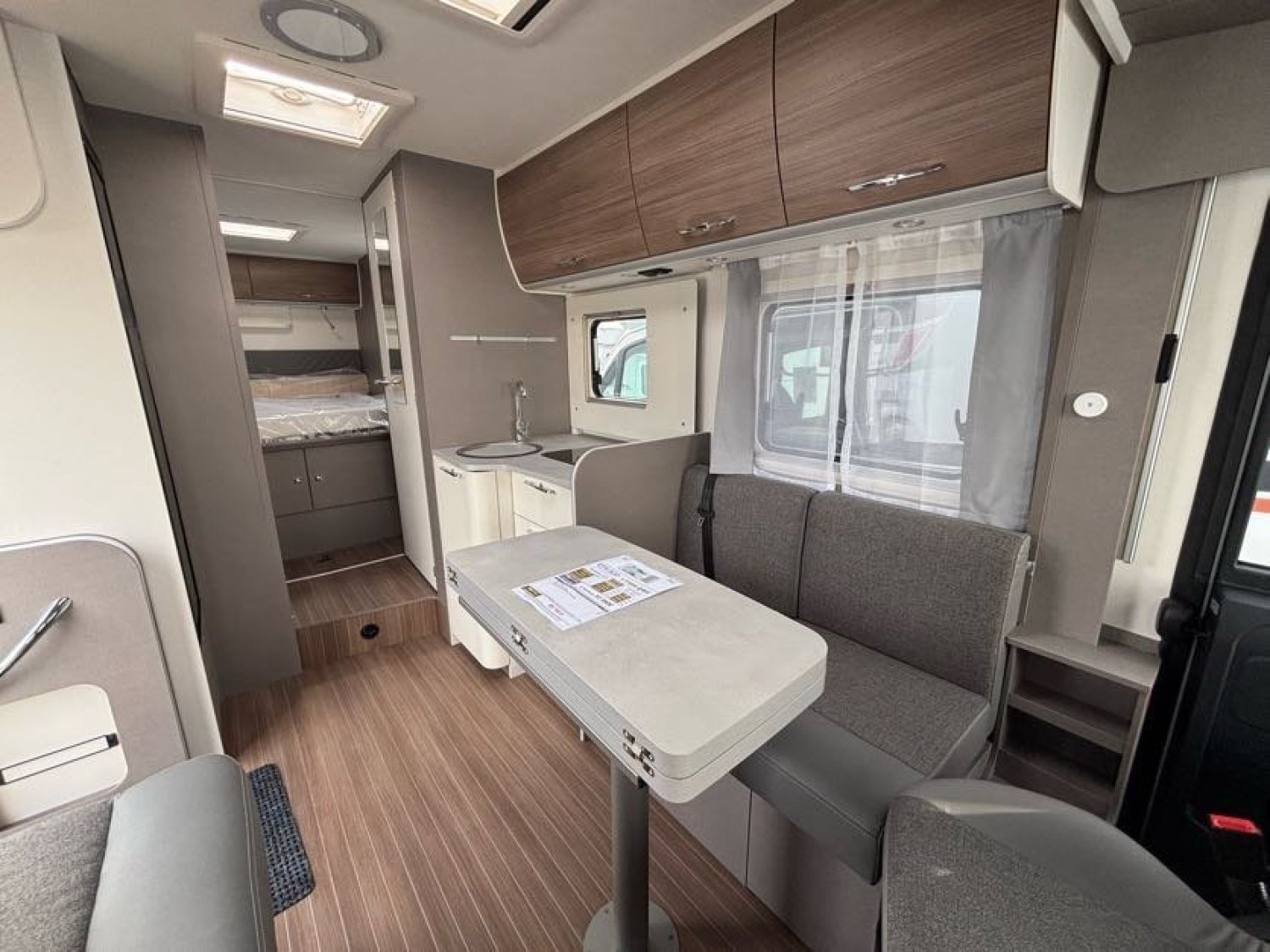 Cuisine en L, Douche indépendante, Grande soute, Lit central, lit pavillon cabine, Salon avant banquettes face à face, Salon avant sièges pivotants, WC Cassette.