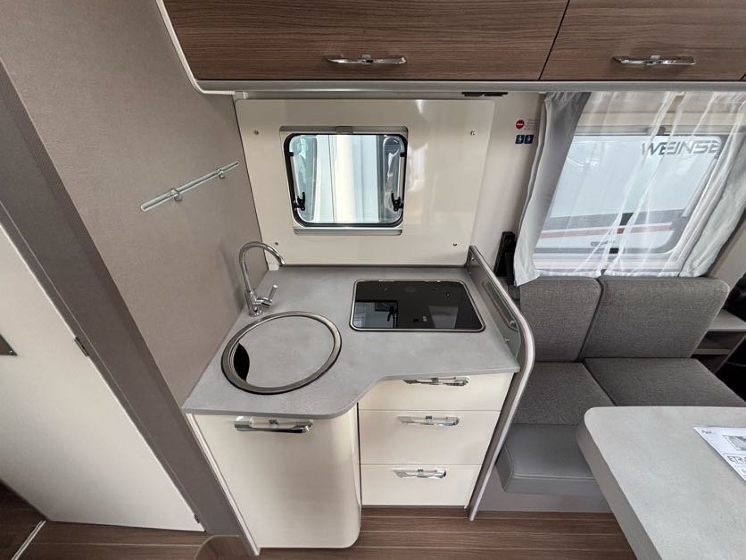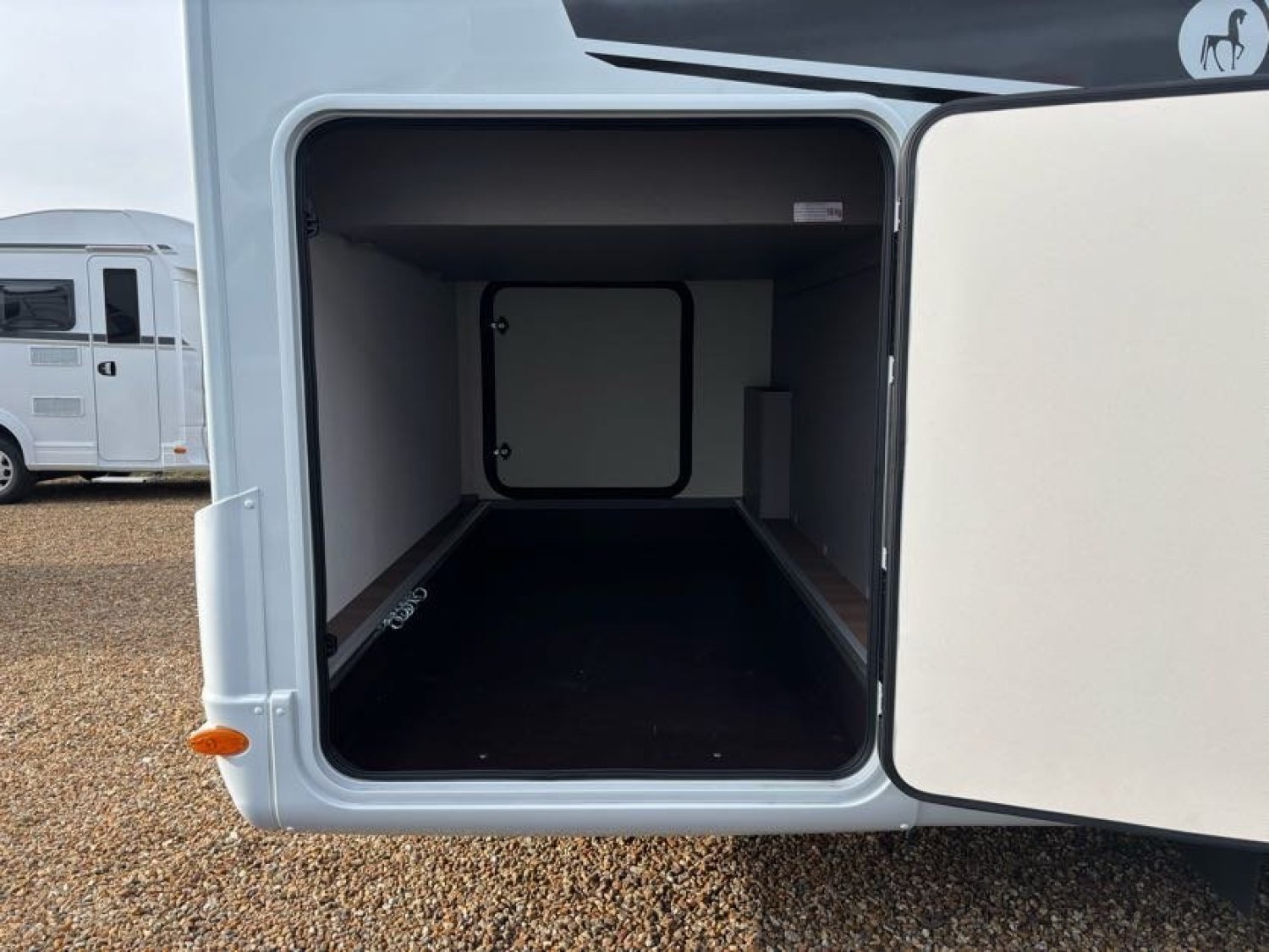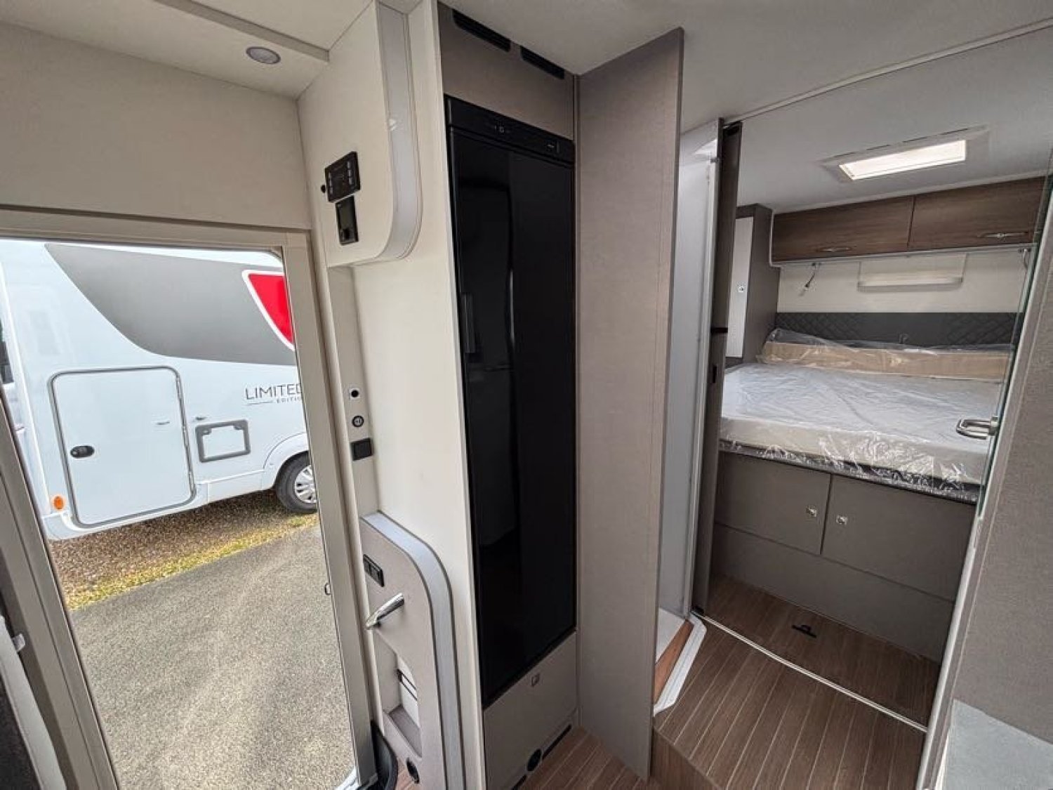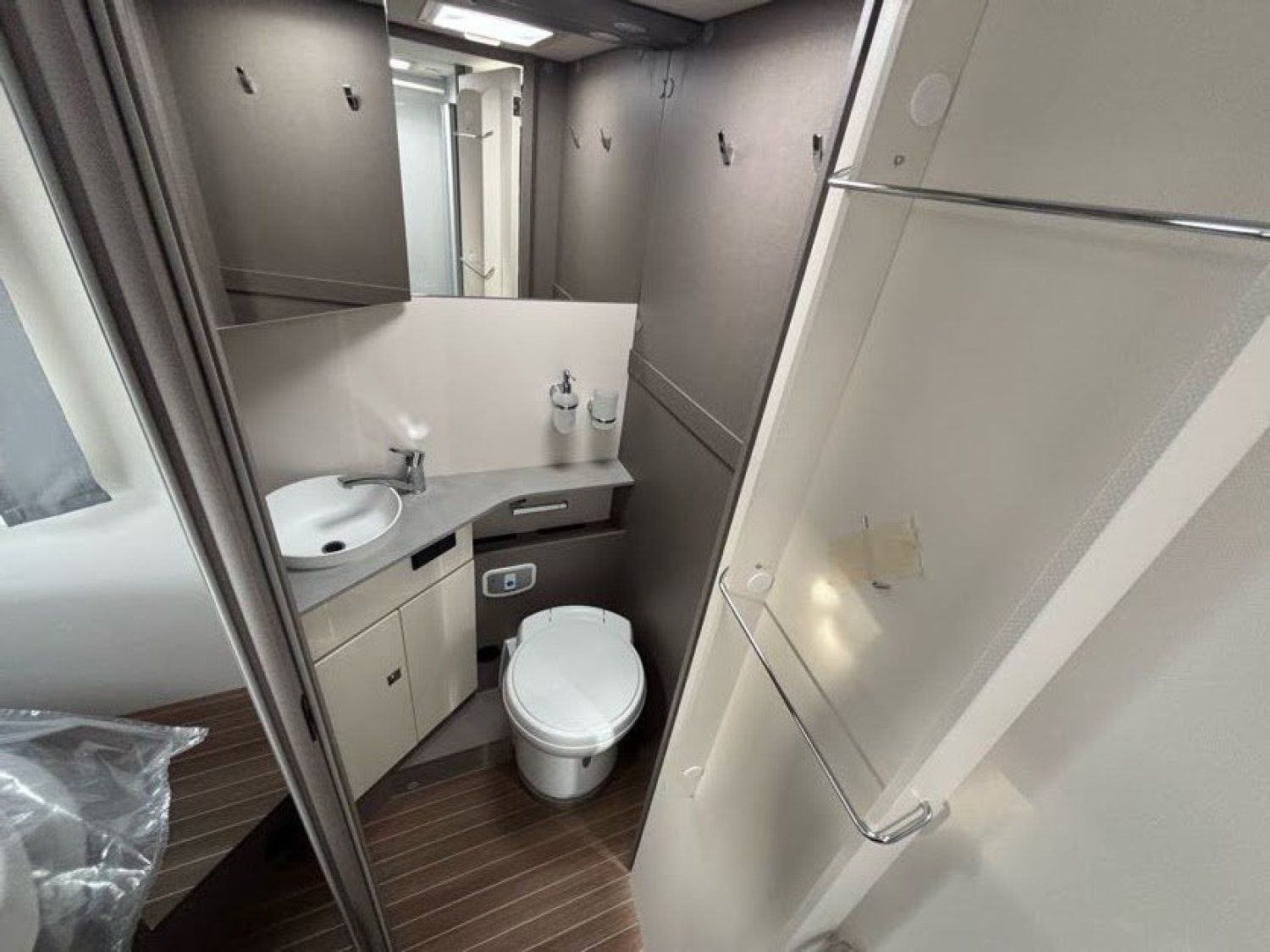 Cuisine en L, Douche indépendante, Grande soute, Lit central, lit pavillon cabine, Salon avant banquettes face à face, Salon avant sièges pivotants, WC Cassette.