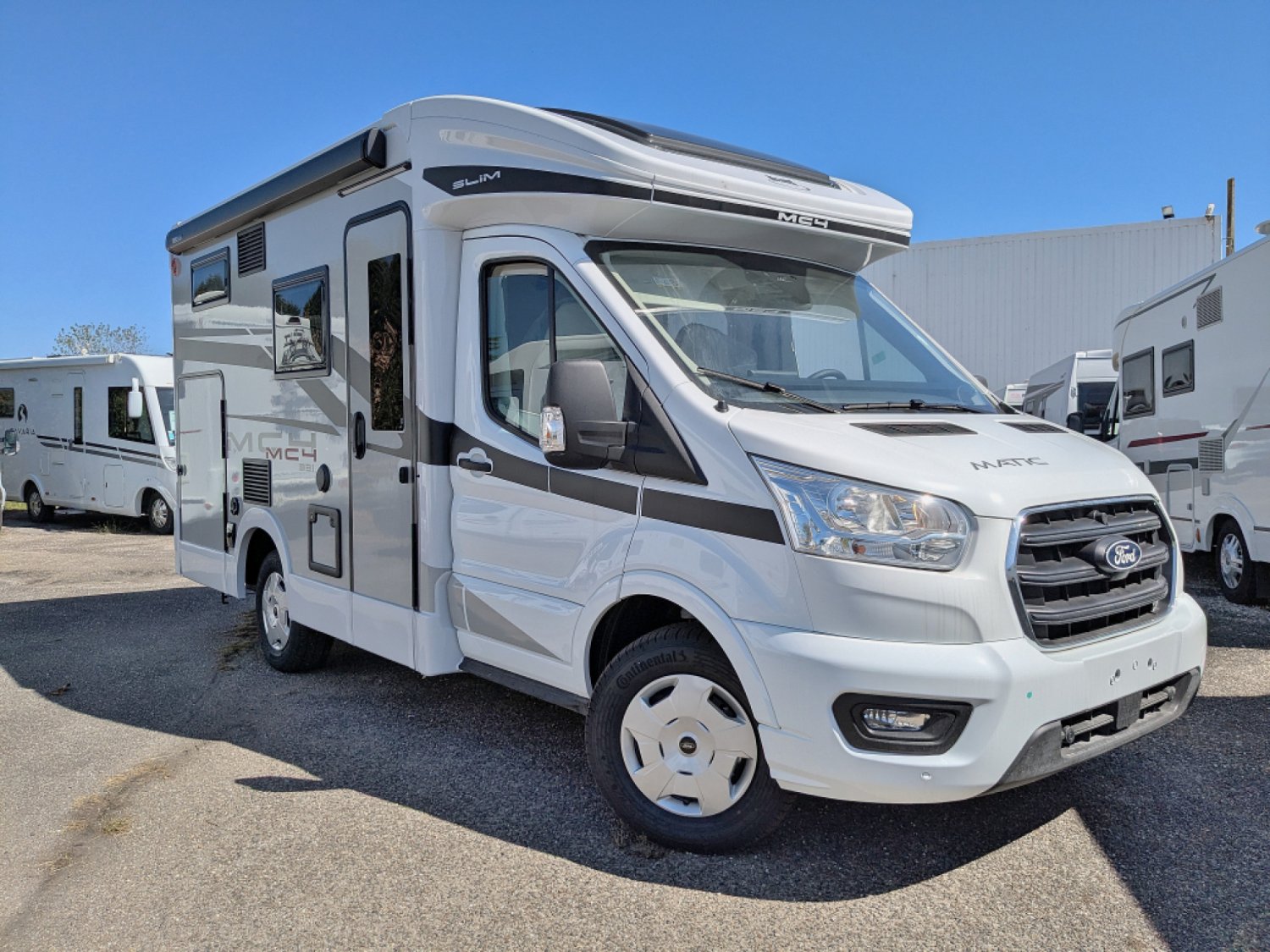 Le Mc Louis MC4-331 Slim 2026, un profilé compact de 2,14 de large sur le nouveau Ford 165 cv avec lit transversal sur soute, salle d'eau vario avec douche séparée par une paroi pivotante, cuisine avec frigo trimixte 138 L et maxi salon avec sièges pivotants. Modèle exposé avec lit de pavillon électrique au-dessus du salon et couchage additionnel salon (inclus dans le prix). Le parfait compromis entre le fourgon et le profilé !