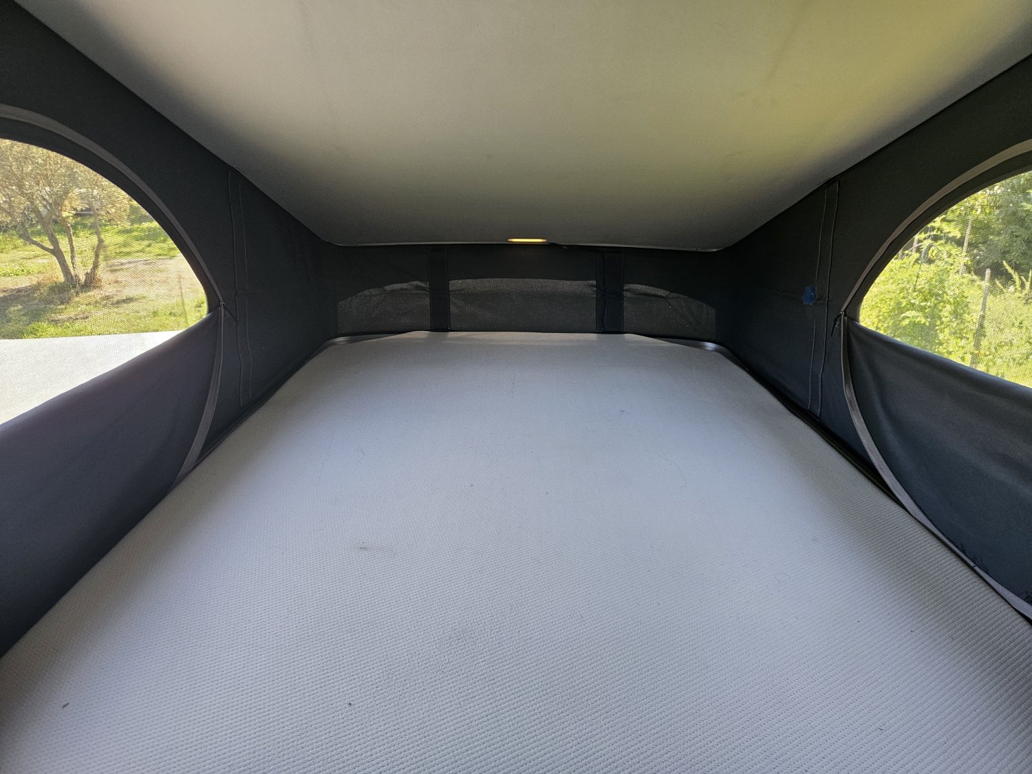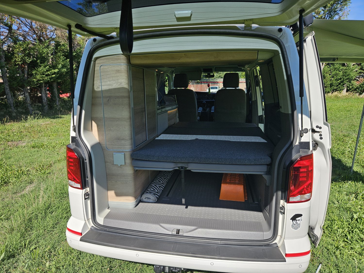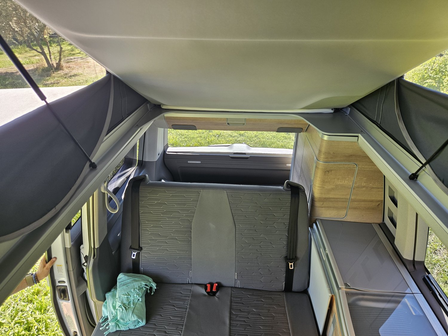 Le toit relevable électrique abrite un lit pavillon spacieux et la banquette arrière se transforme facilement en couchage.
