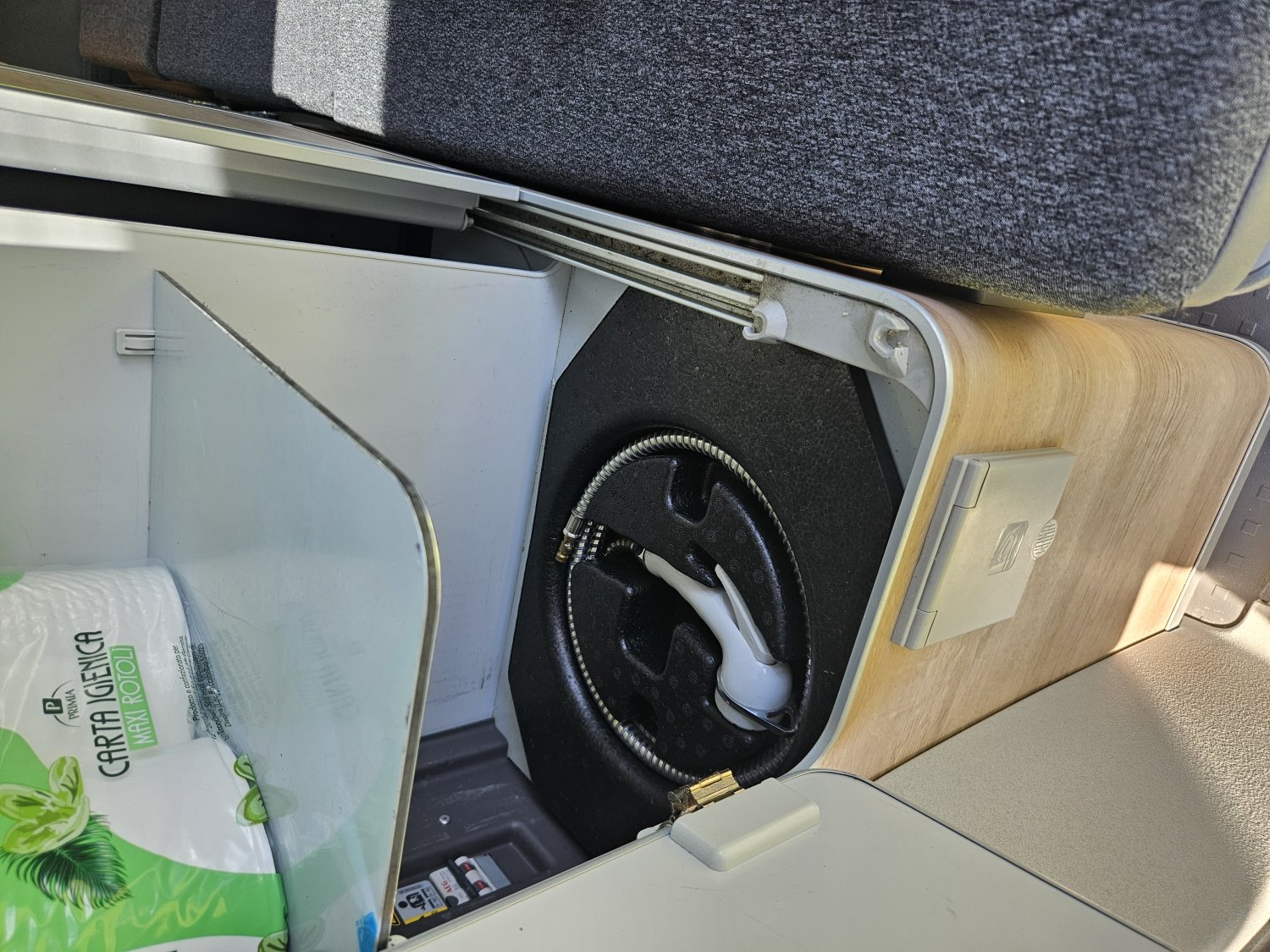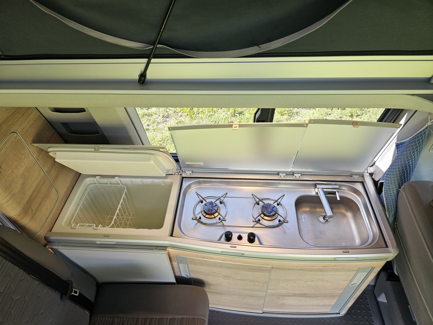 L'espace de vie comprend un chauffage carburant, une douchette extérieure, un éclairage LED, une gazinière 2 feux, un réfrigérateur à compression 12v à compression et un salon face-à-face convivial.