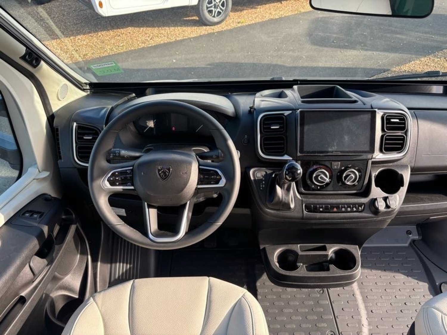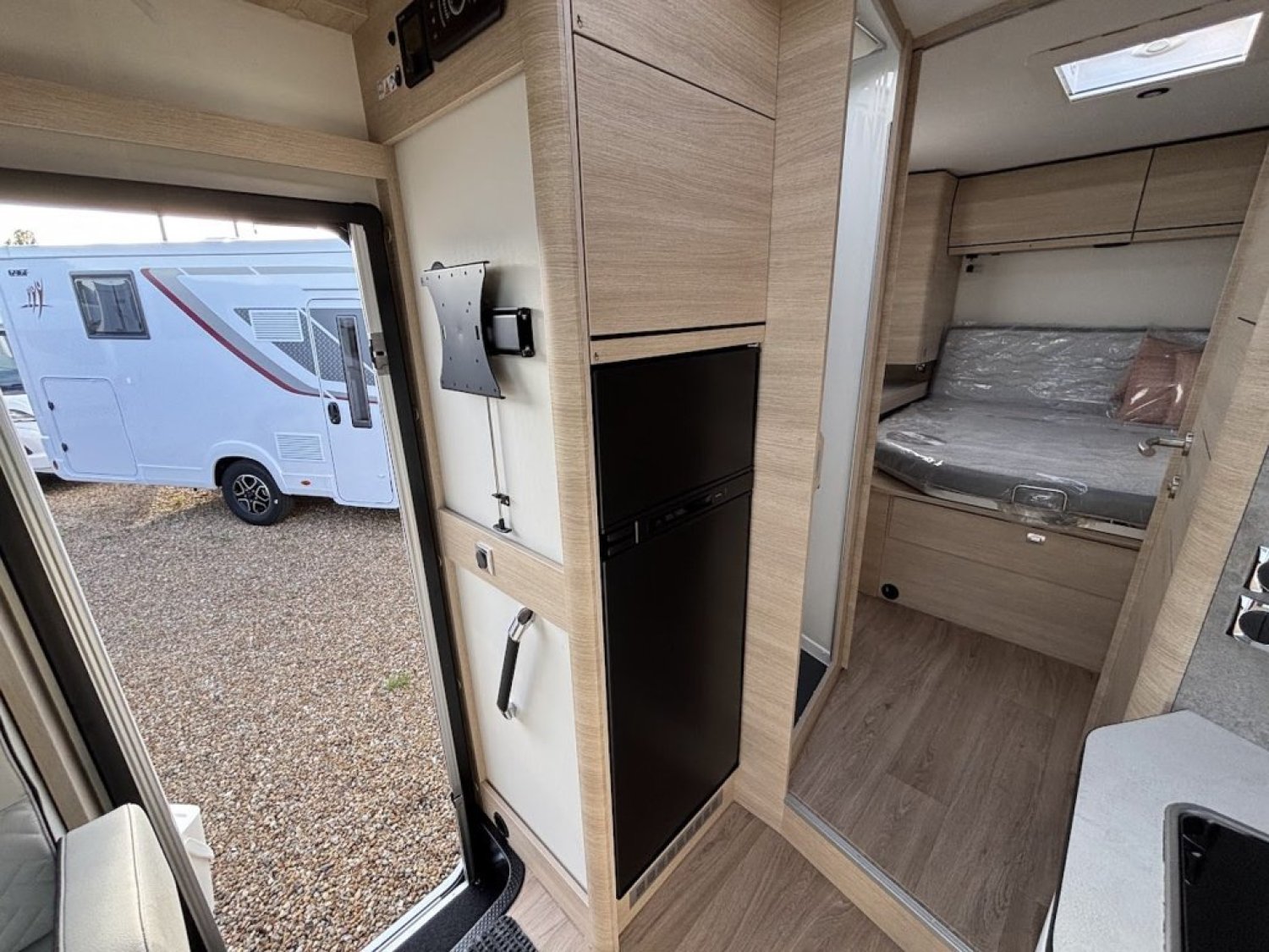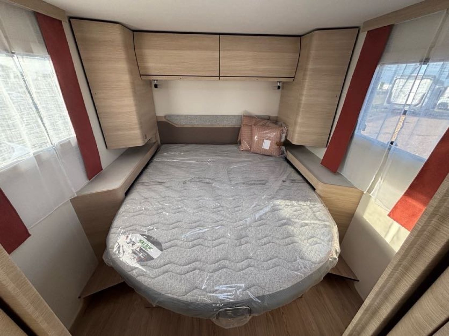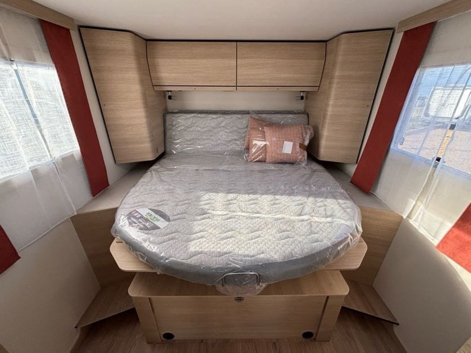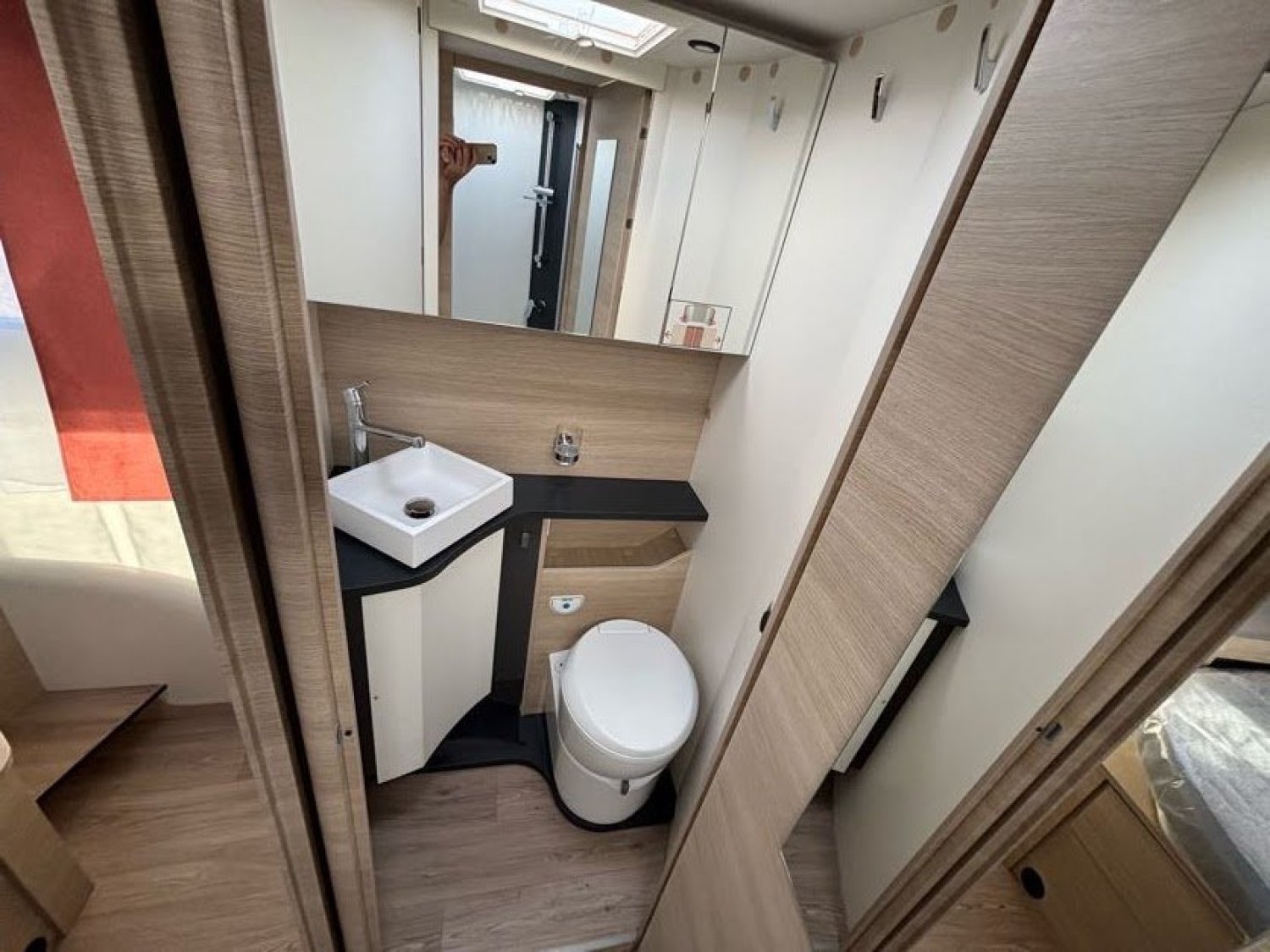 Cuisine en L, Douche indépendante, Lit central, lit pavillon, Salon avant banquettes face à face, Soute réglable en hauteur, WC Cassette.