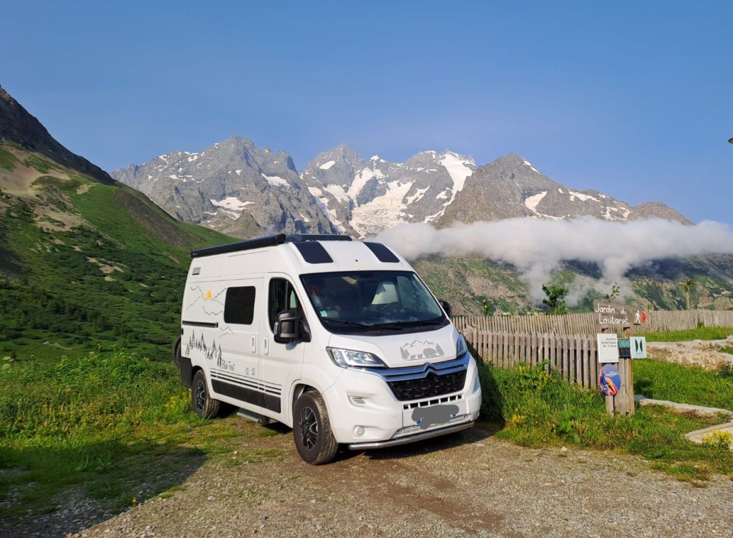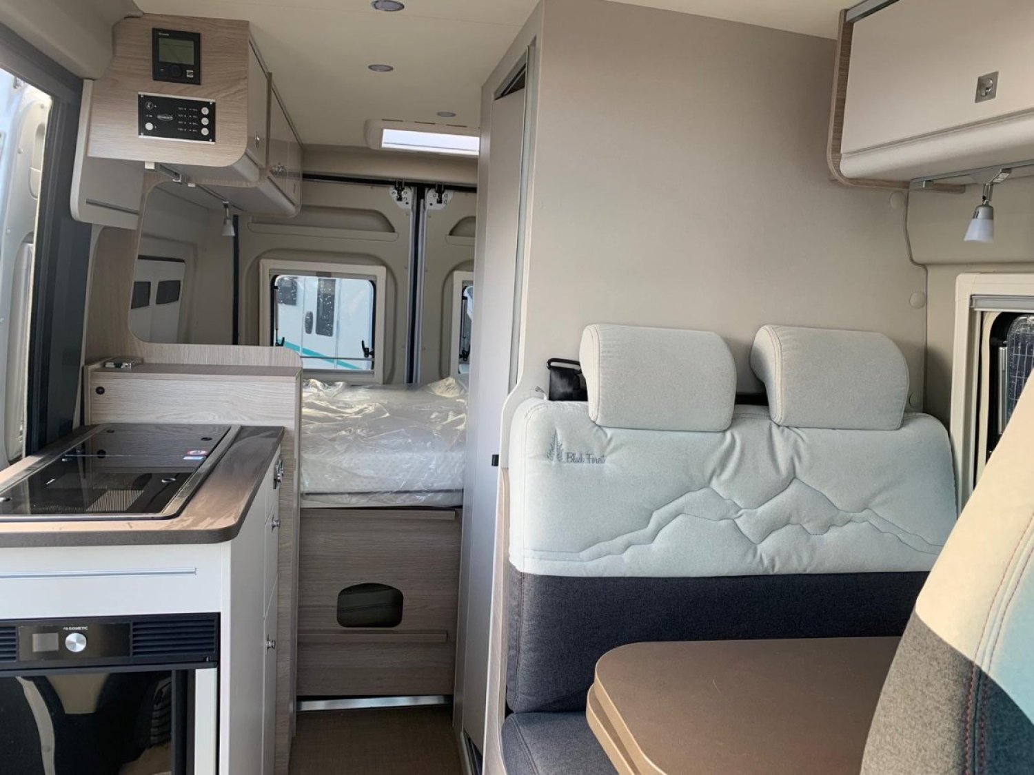 Fourgon très maniable, avec une très bonne garde au sol; équipé porte vélo-attelage Busbiker XM290, panneau solaire, store Thule.
