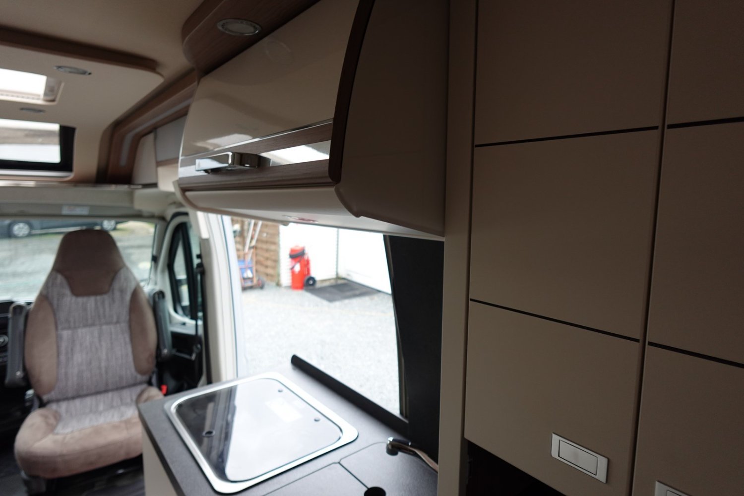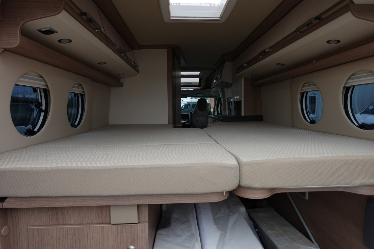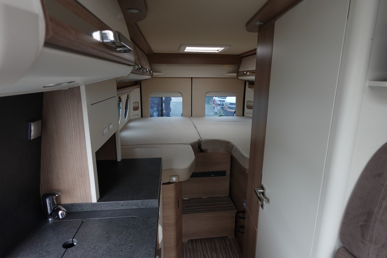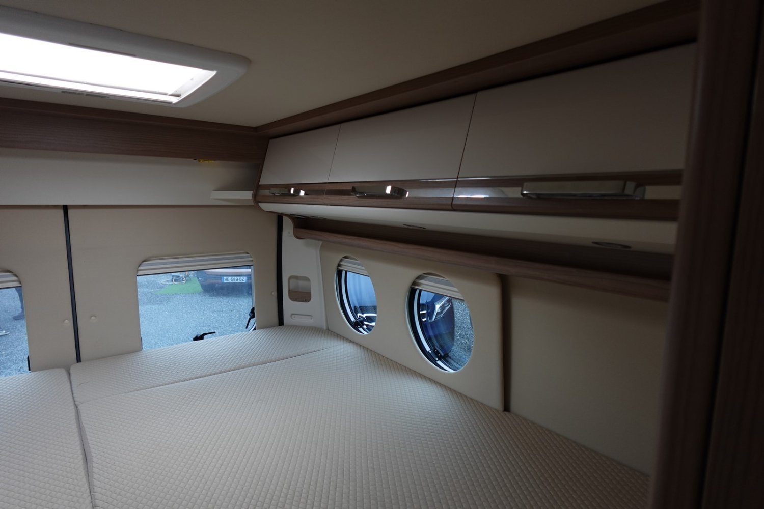 Magnifique fourgon aménagé haut de gamme comprenant un salon avant panoramique, une cuisine avec de nombreux rangements, une salle de bain astucieuse avec beaucoup d’espace et des lits jumeaux.
