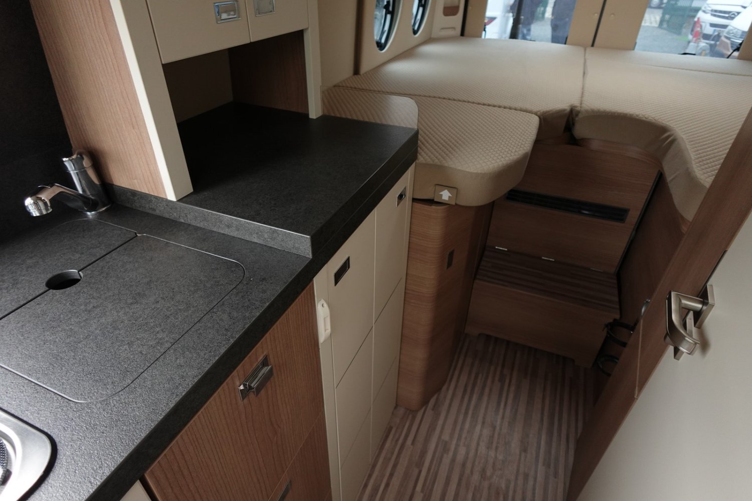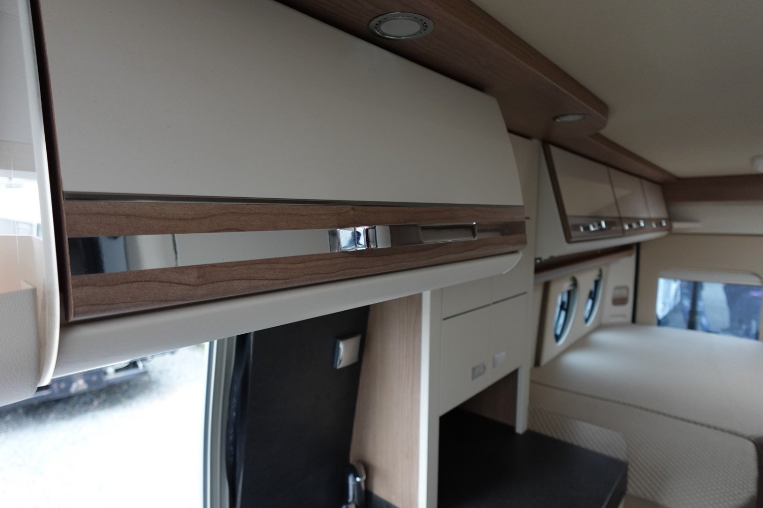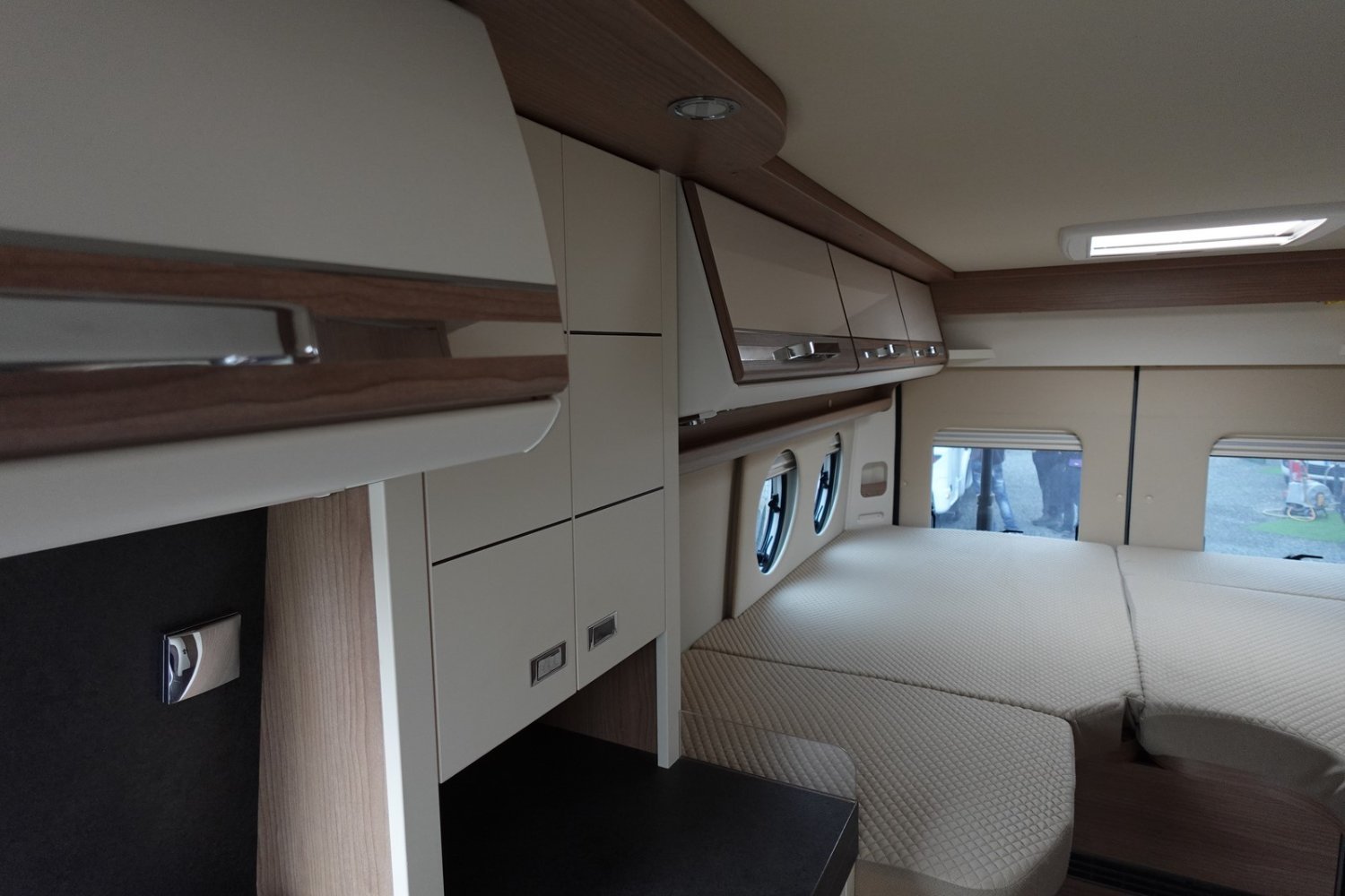 Magnifique fourgon aménagé haut de gamme comprenant un salon avant panoramique, une cuisine avec de nombreux rangements, une salle de bain astucieuse avec beaucoup d’espace et des lits jumeaux.