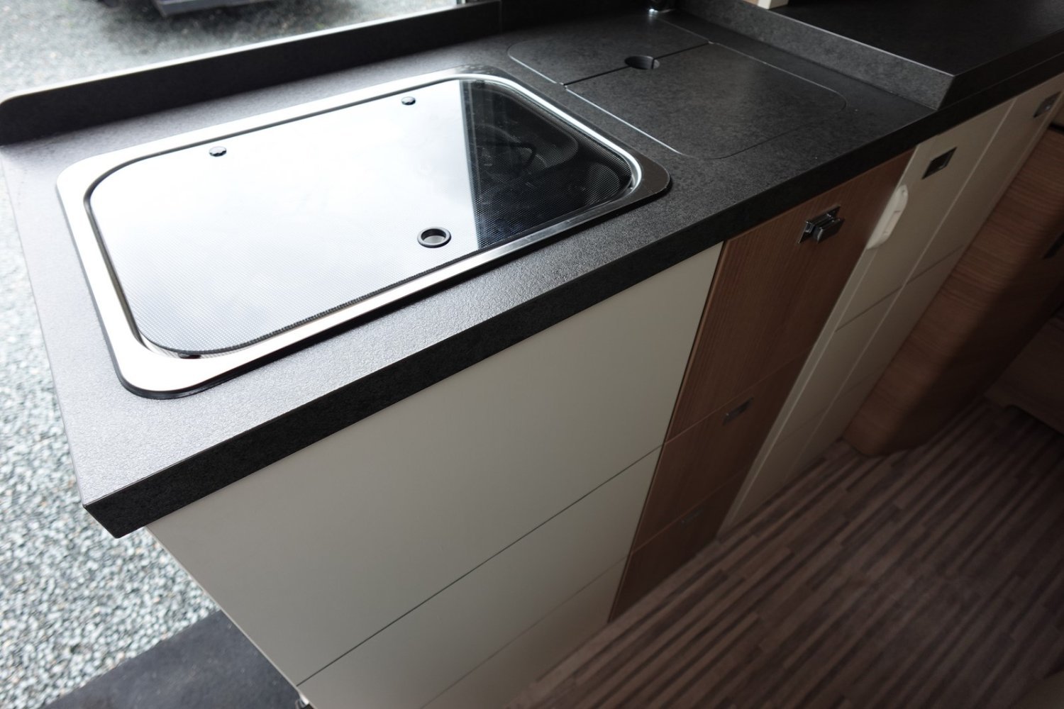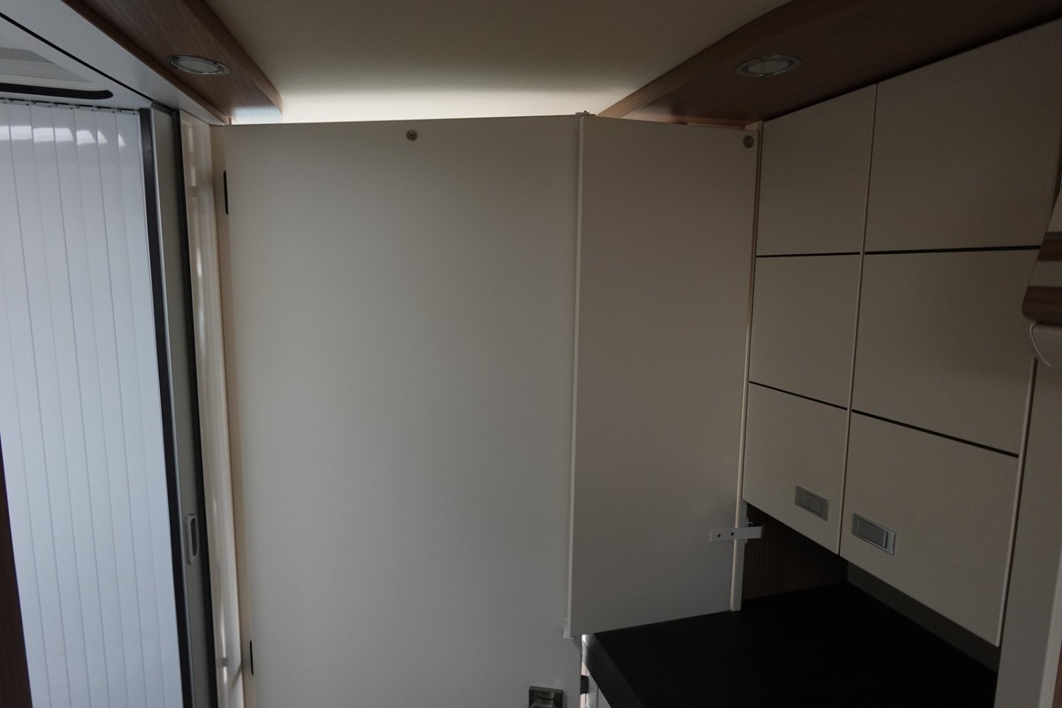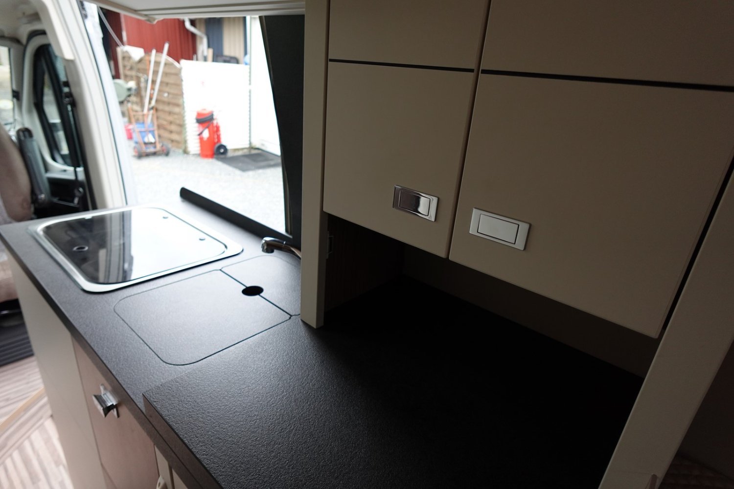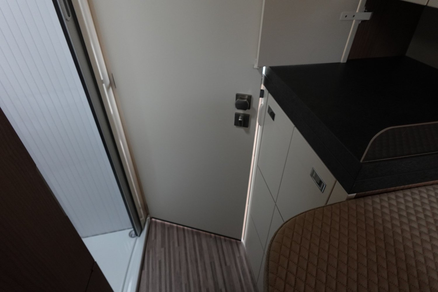 Magnifique fourgon aménagé haut de gamme comprenant un salon avant panoramique, une cuisine avec de nombreux rangements, une salle de bain astucieuse avec beaucoup d’espace et des lits jumeaux.