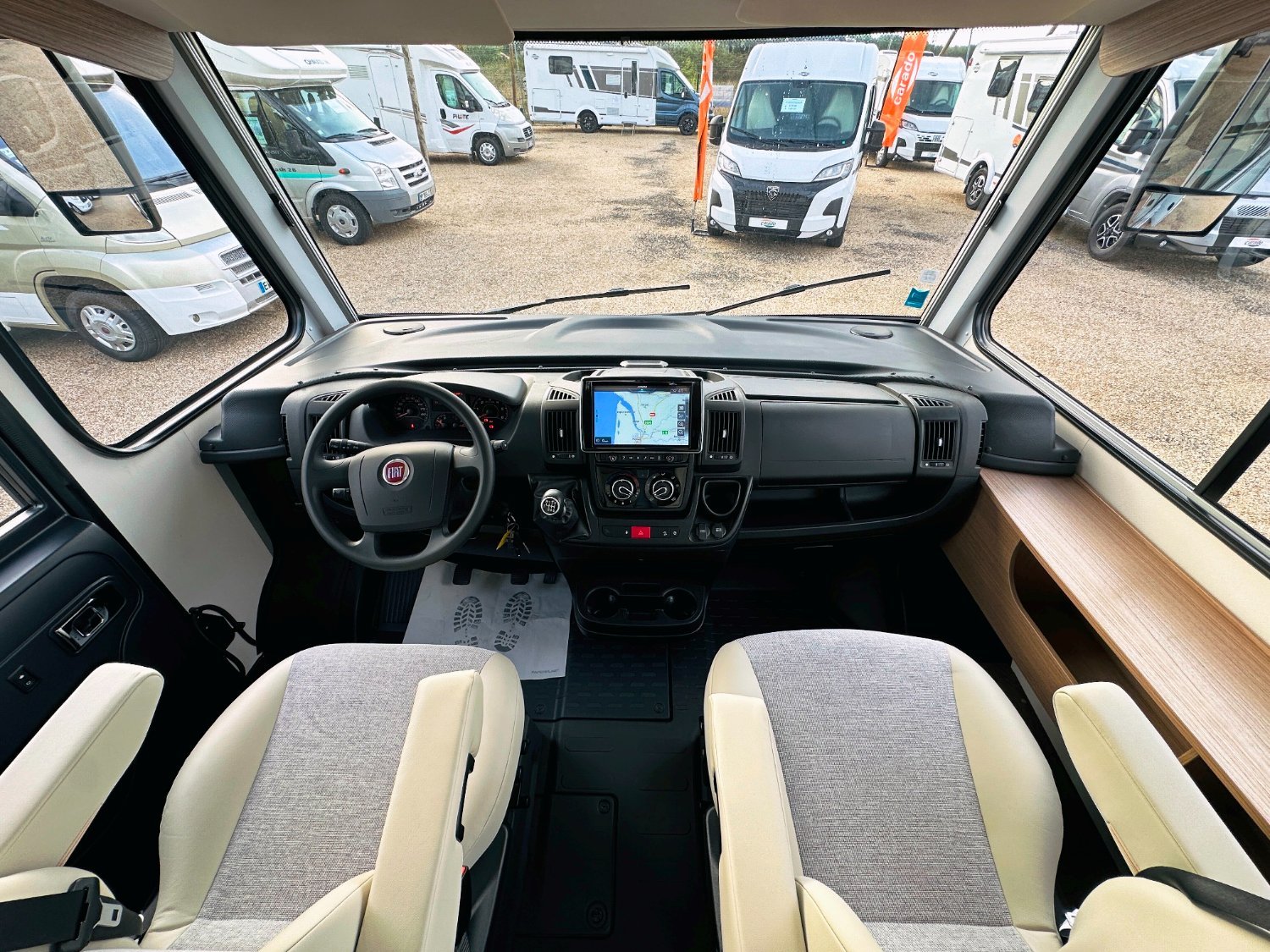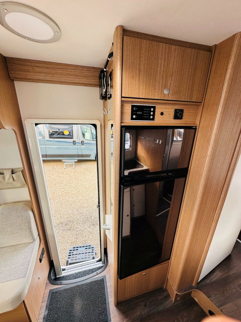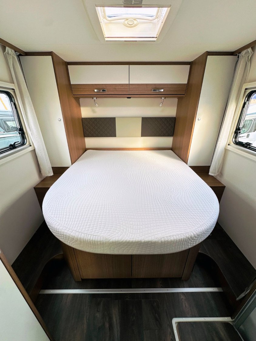 Intégral Carado, lit central (150 Cm), vaste soute garage (plusieurs vélos adultes), 5 couchages, salle de bain avec grande douche entièrement séparée, cuisine spacieuse et toute équipée, vaste salon avant avec sièges pivotant et table centrale convertible en un couchage d’appoint + lit pavillon en cabine pour deux adultes.