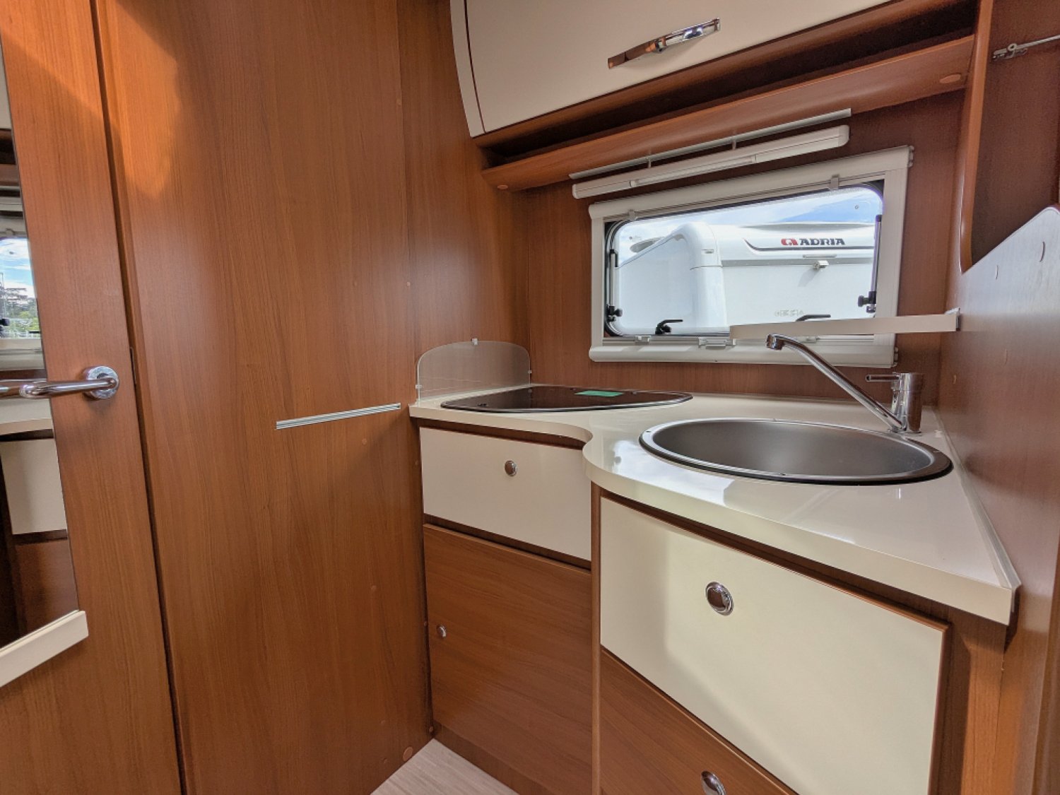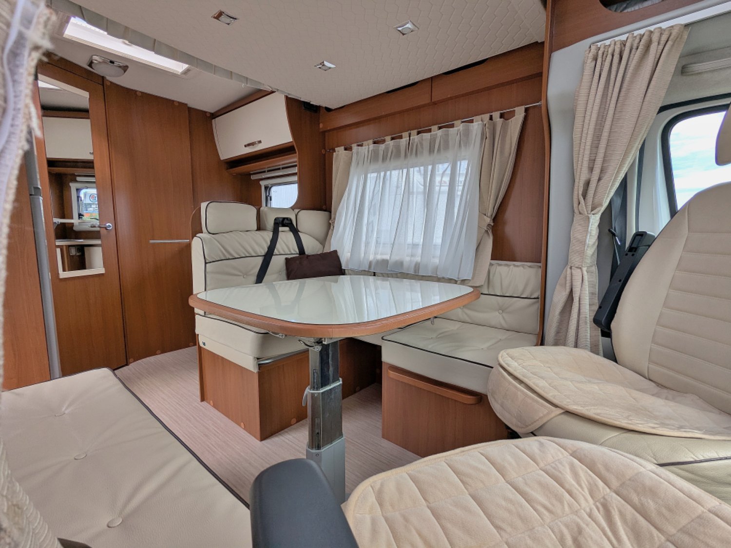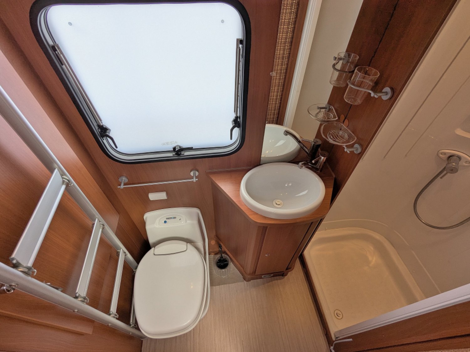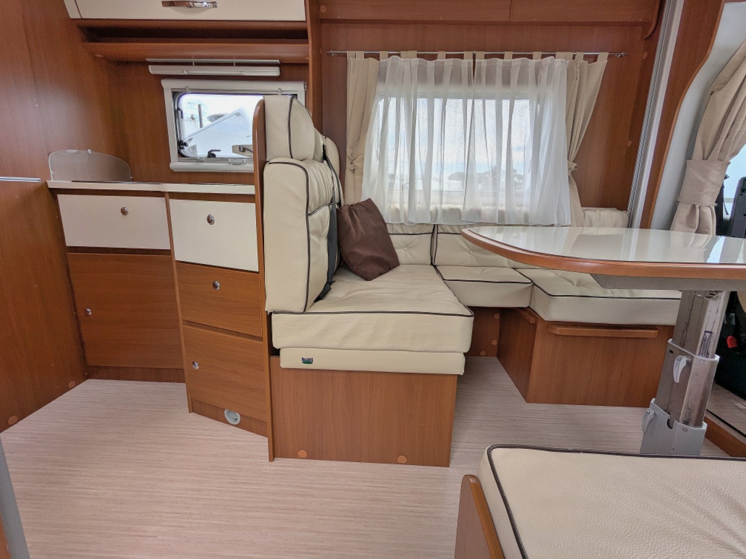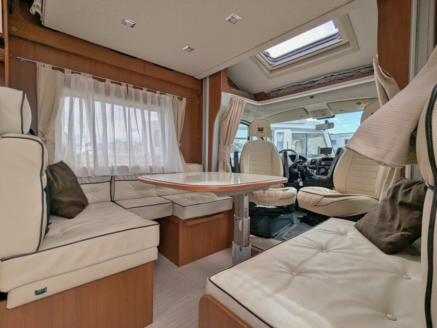 Profilé ultra compact en très bon état sur Fiat 2,3 JTD 130 CV BV6 avec salle d'eau/WC et douche séparée arrière, cuisine latérale en L avec frigo conservateur et plaque de cuisson 2 feux, et salon avant avec banquette face/face convertible en couchage de deux personnes. Lit de pavillon électrique de deux personnes au-dessus du salon.