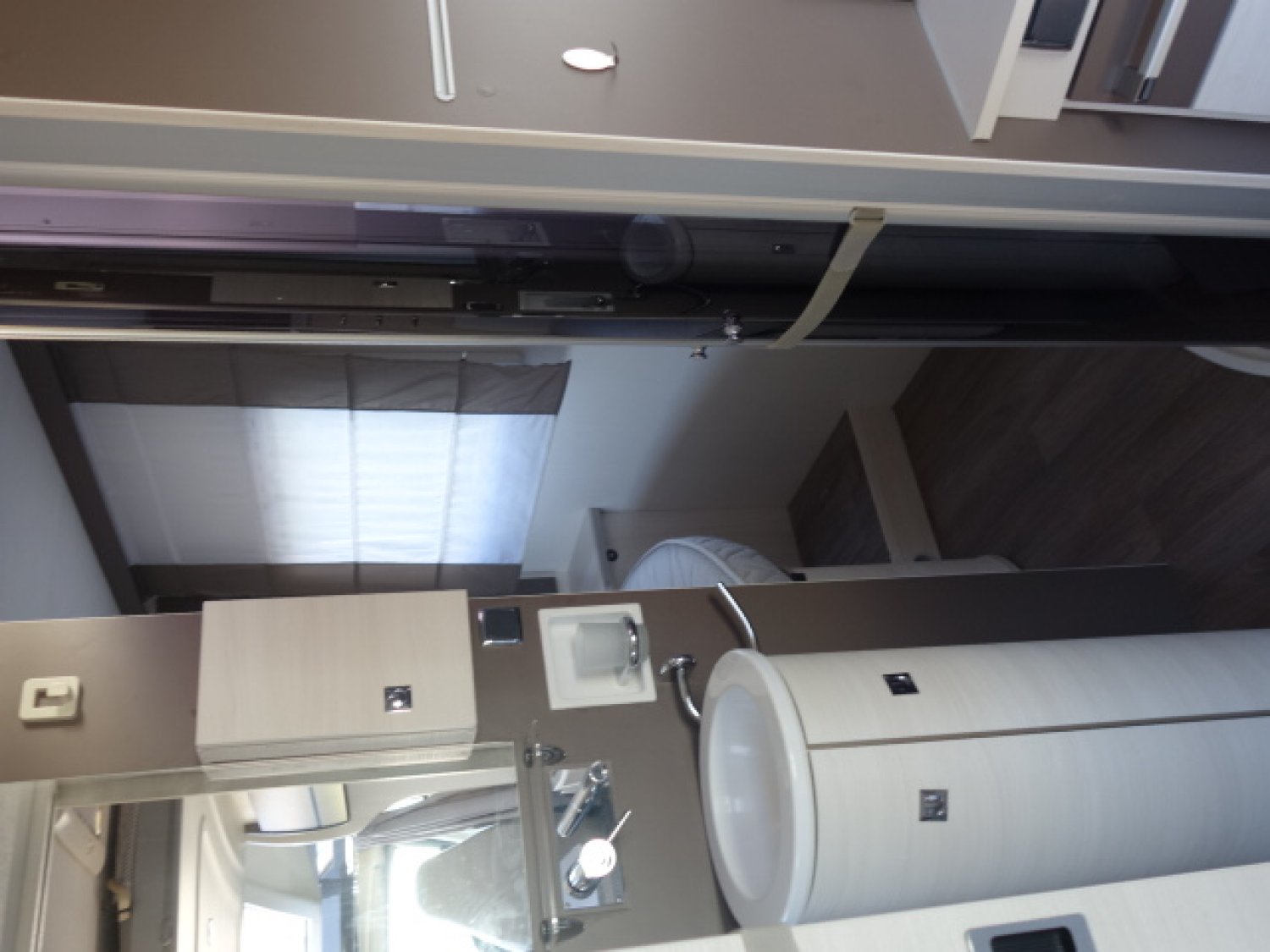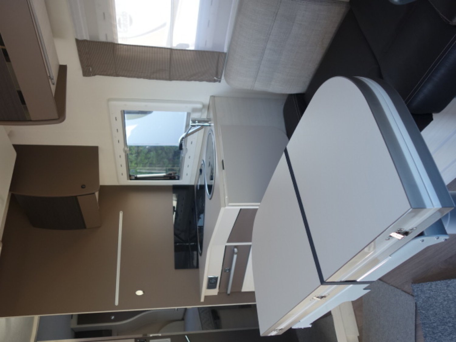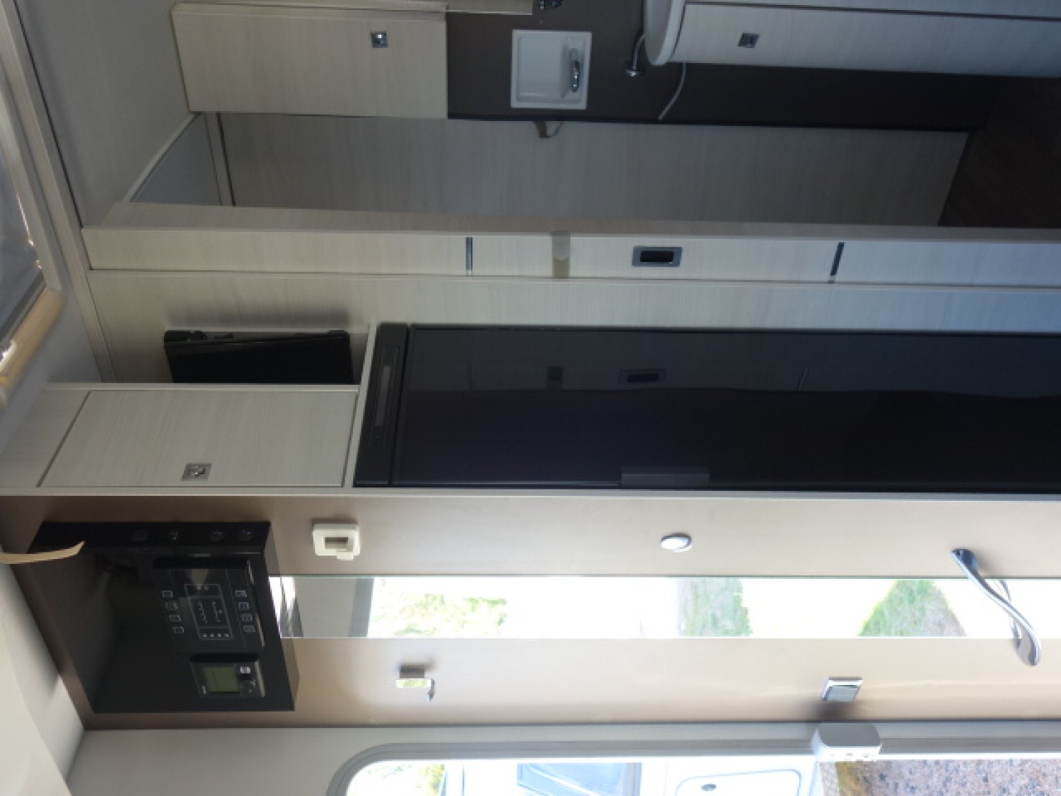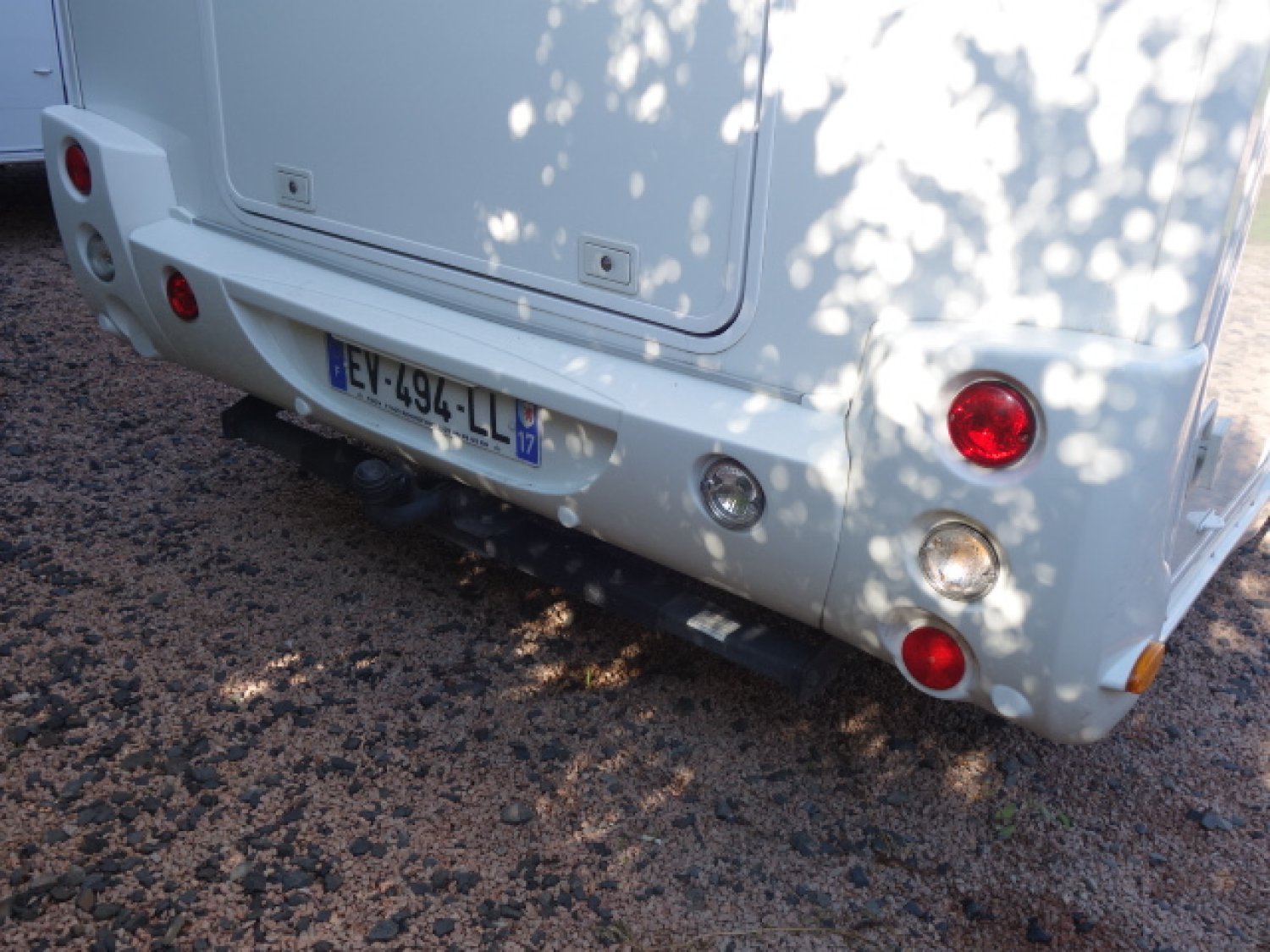 Profilé avec lit central réglable en hauteur sur garage, cabinet de toilette avec lavabo douche et WC séparés, lit de pavillon, équipements: store, panneau solaire, antenne satellite automatique, TV, caméra de recul, auto radio, attelage, porte vélos télescopique, chauffage TRULA gasoil.