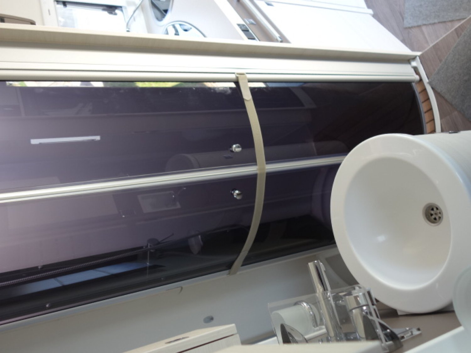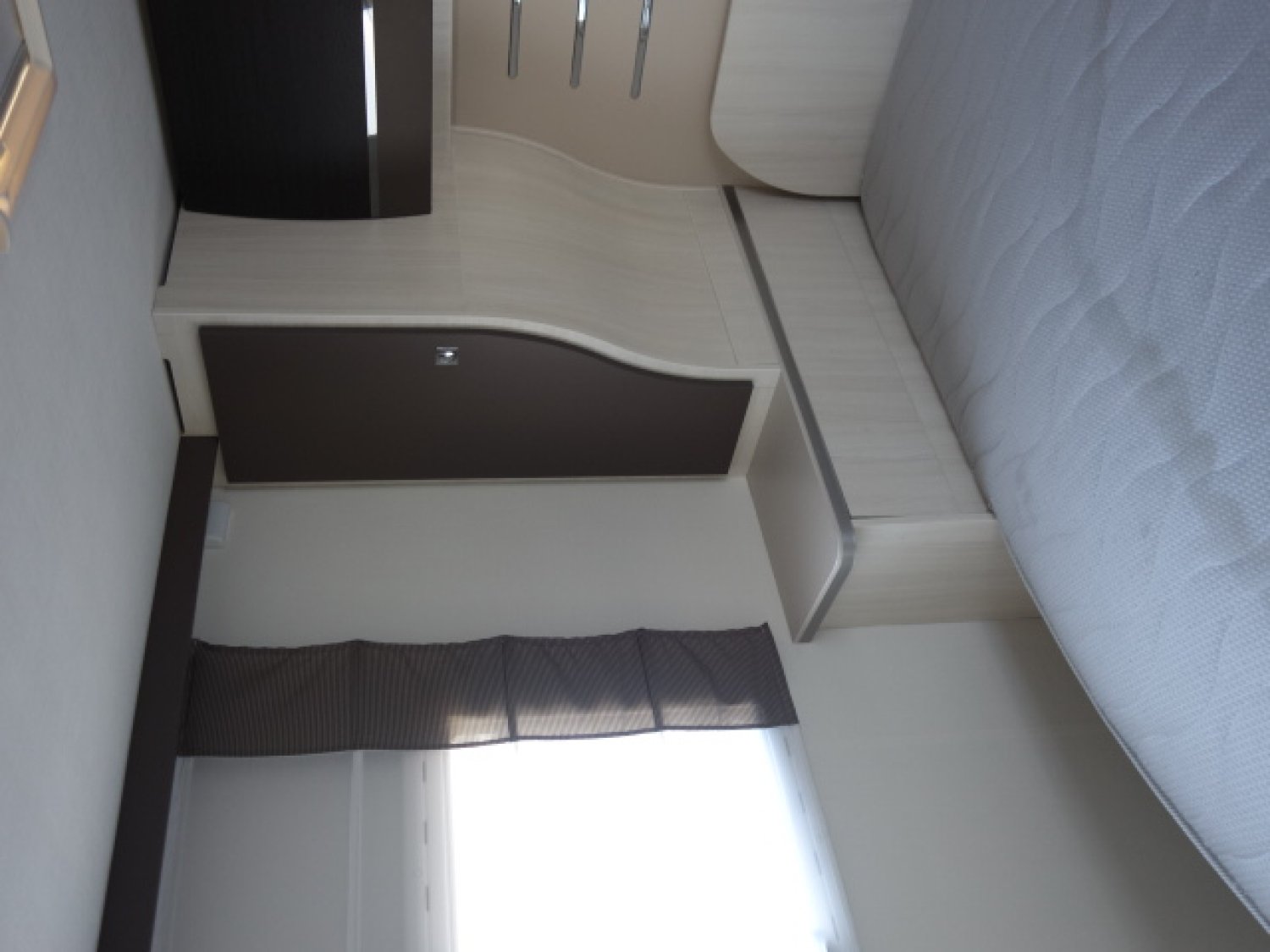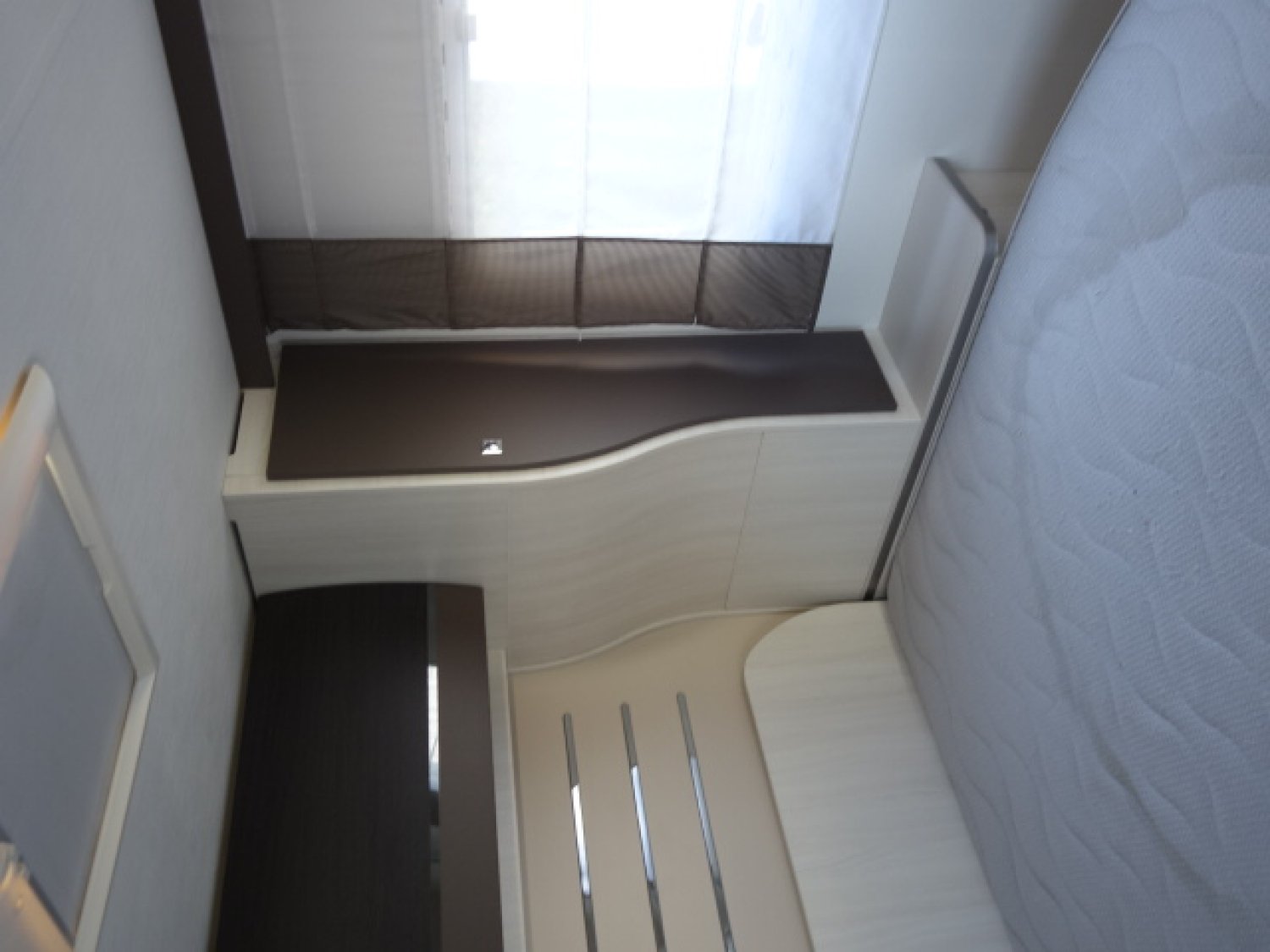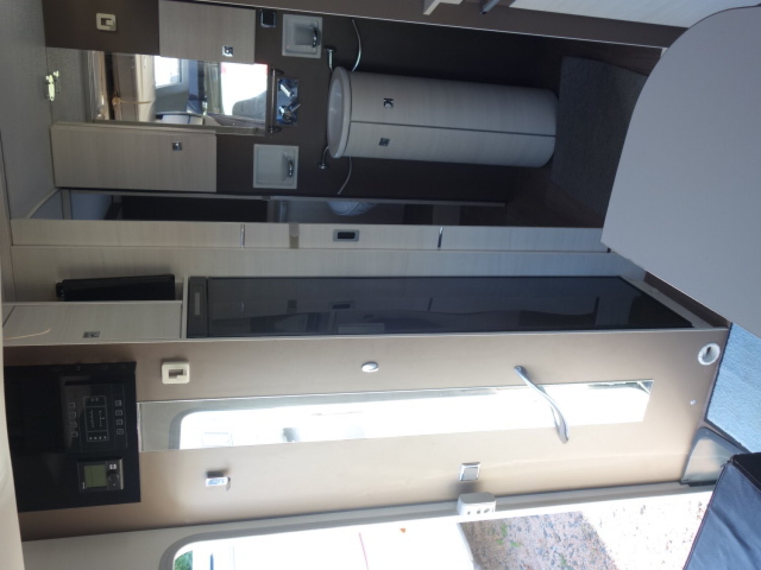 Profilé avec lit central réglable en hauteur sur garage, cabinet de toilette avec lavabo douche et WC séparés, lit de pavillon, équipements: store, panneau solaire, antenne satellite automatique, TV, caméra de recul, auto radio, attelage, porte vélos télescopique, chauffage TRULA gasoil.