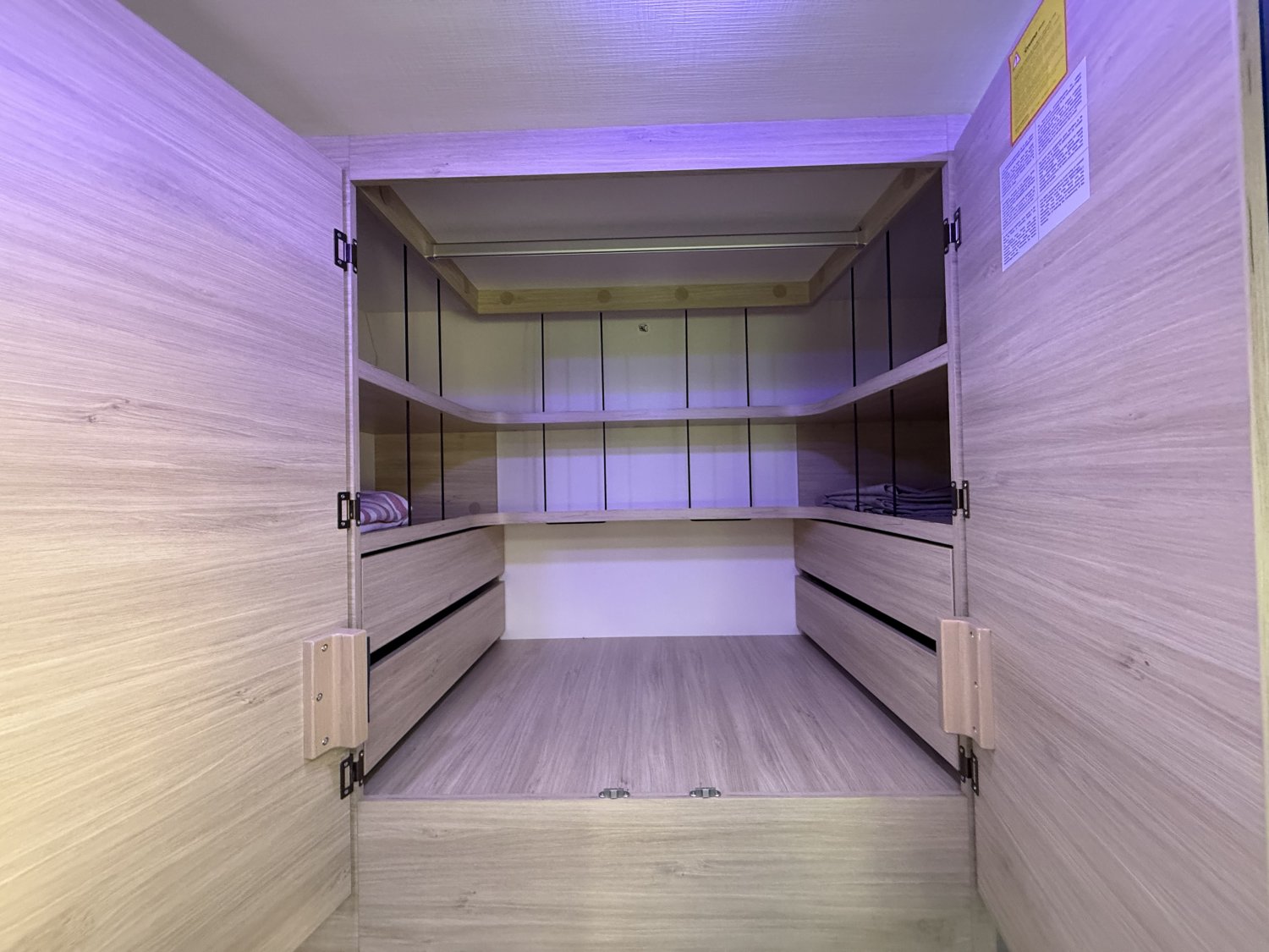 Le lit pavillon électrique double, discret et rapide à déployer, libère un véritable espace de vie aéré et convivial en journée, faisant de ce modèle un studio mobile moderne et ingénieux.