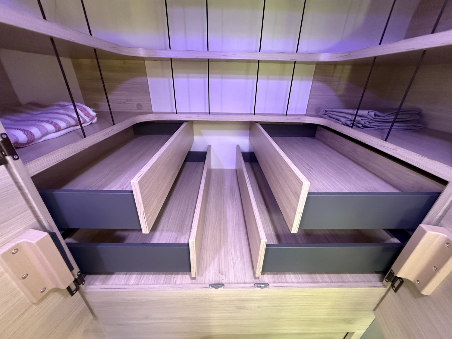 L’aménagement exclusif du Chausson 650 combine un vaste salon face à face lumineux, un grand plan de travail en cuisine avec rangements optimisés, une salle d’eau indépendante avec douche séparée, et une soute généreuse pour le transport de matériel ou de bagages.