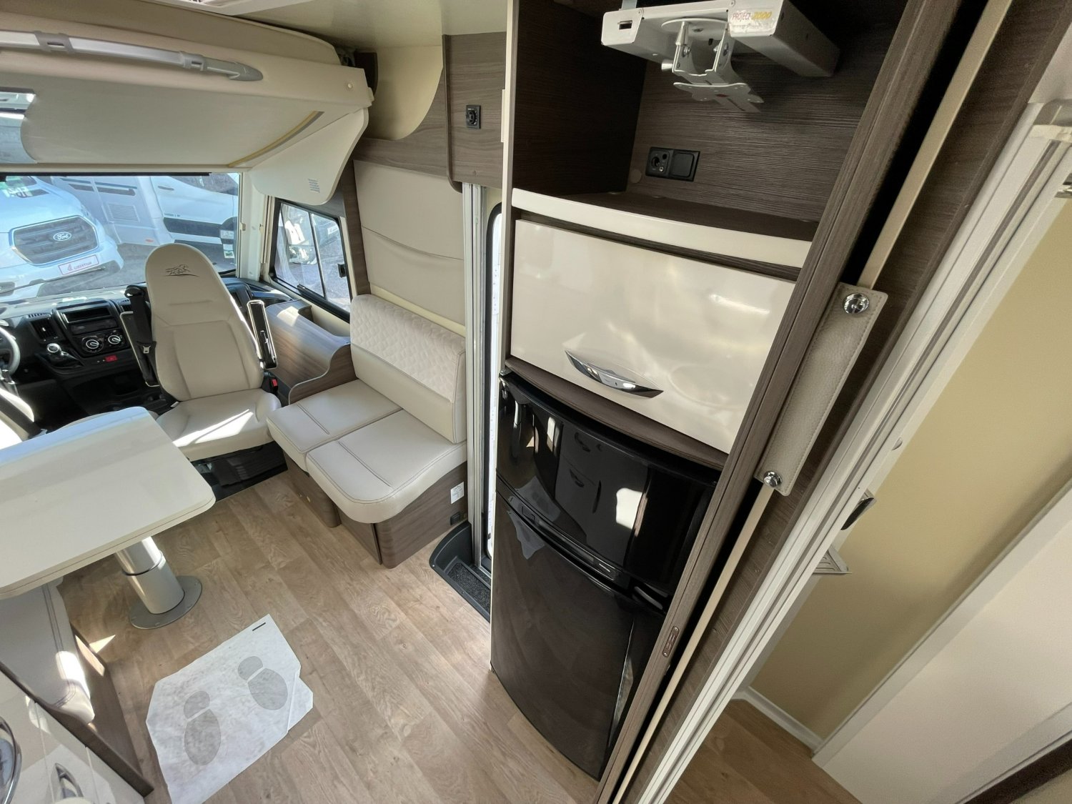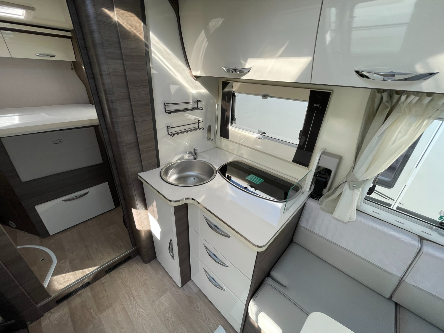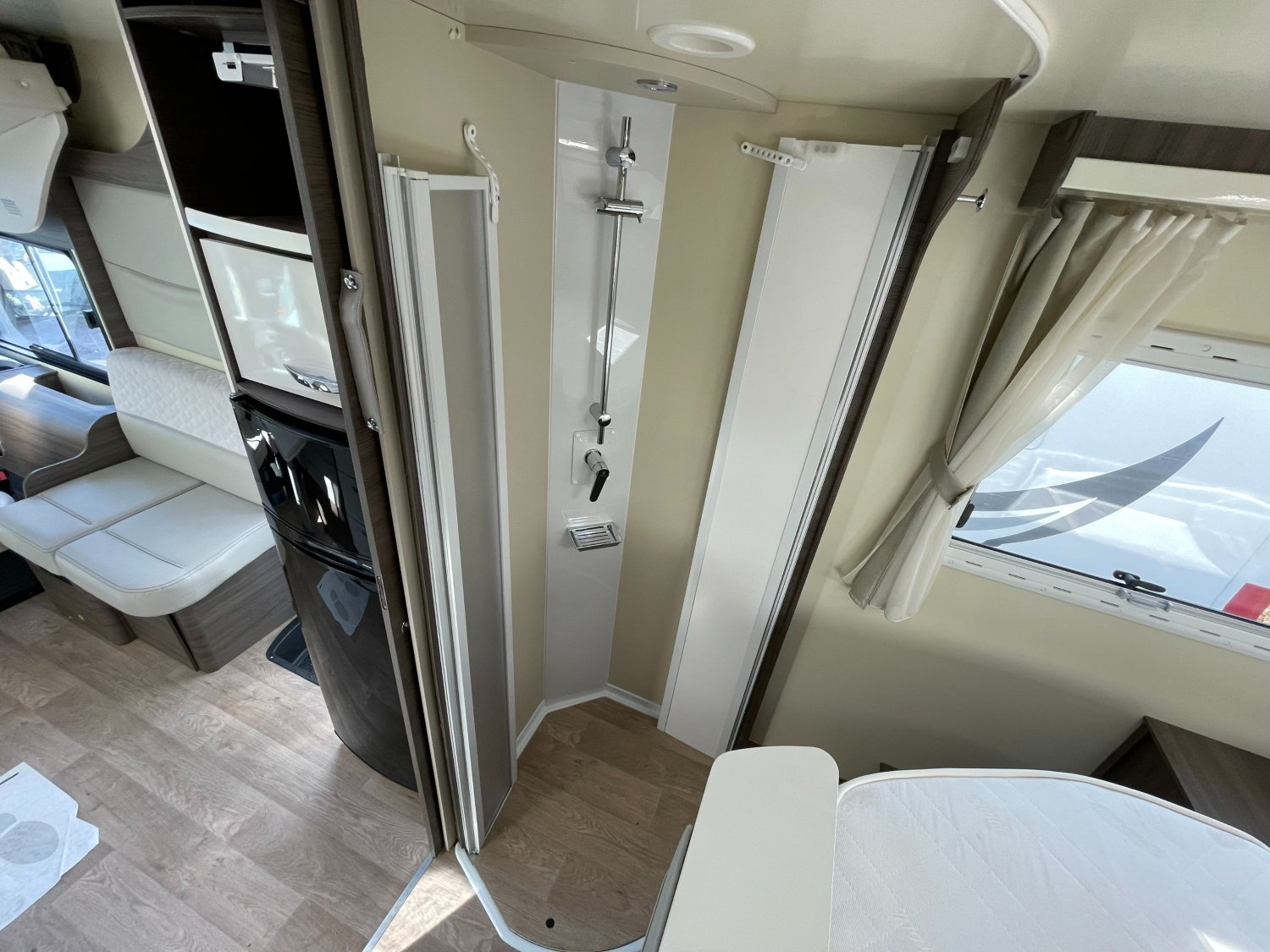 le salon face/face transformable en places route débarque en force. Il est proposé sur un intégral lit central de 7,40m en l’associant à un lit de pavillon . Le Yearling 881 ajoute un étonnant meuble en pied de lit central dans lequel s’escamote la TV et qui a le mérite de renouveler le genre.
