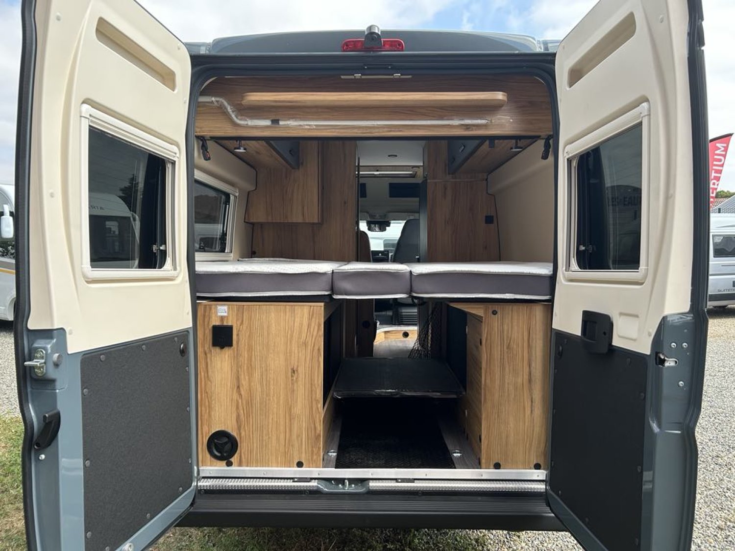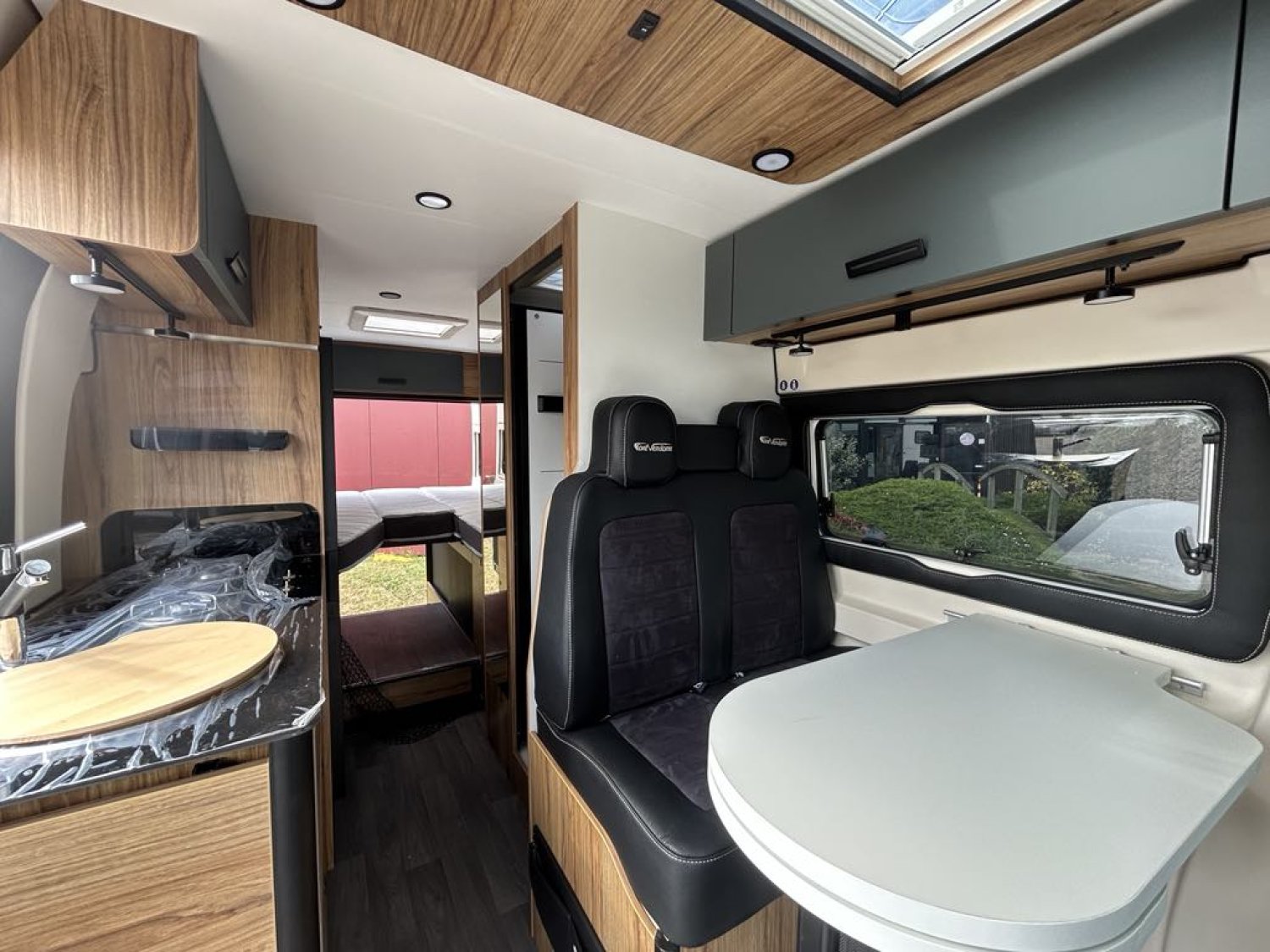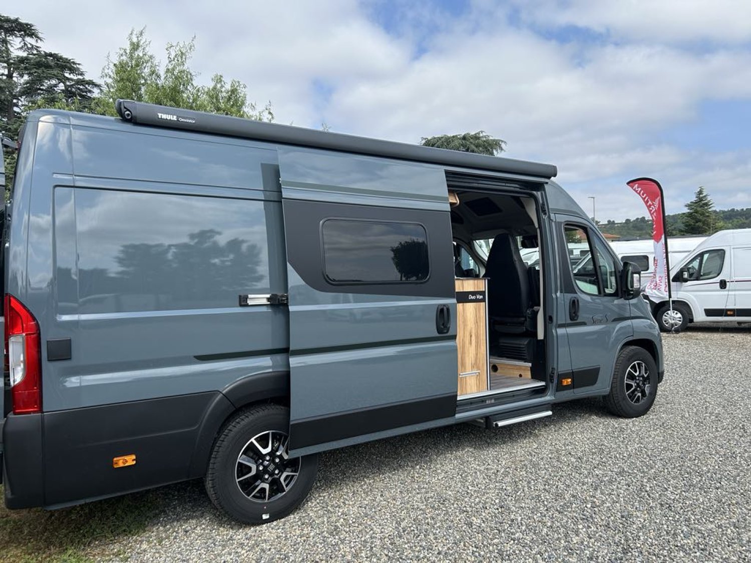Le Duo Van crée en 2014, a été spécialement conçu pour les couples, offrants des espaces de vie généreux. Ses lits arrière jumeaux sur sommiers à lattes peuvent se transformer en un grand lit simple, avec de nombreux rangements intégré. Son coin toilette, avec WC escamotable et paroi de douche, est à la fois pratique et spacieux.
