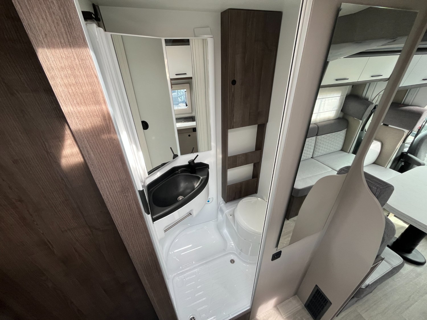Profilé familial de 7,20 m avec BVA Ford Transit 165 ch, conçu pour 5/6 personnes : lit pavillon électrique, lits superposés XL et grand salon panoramique. Idéal confort et modernité pour voyager en famille.