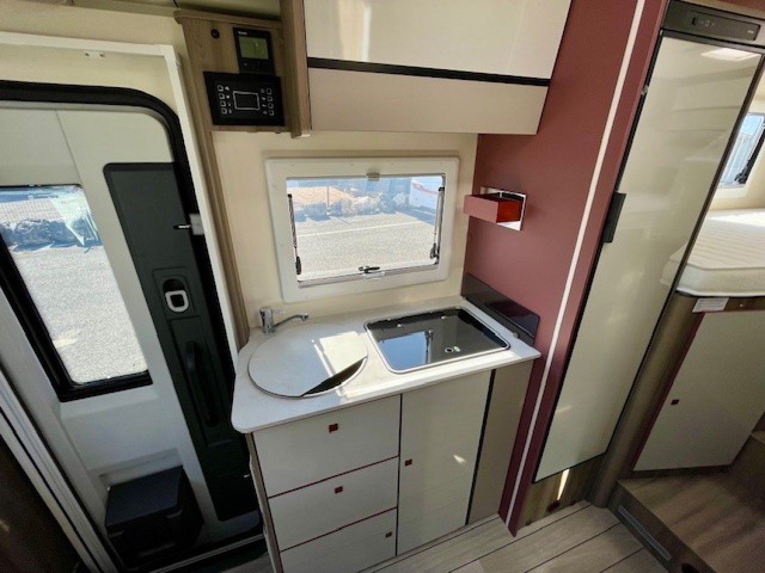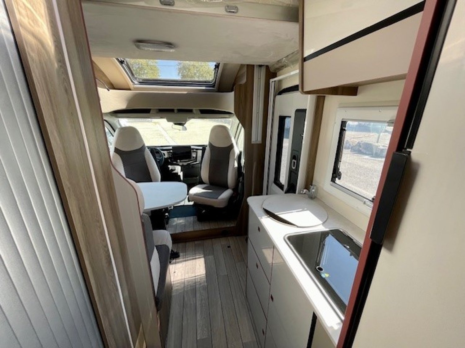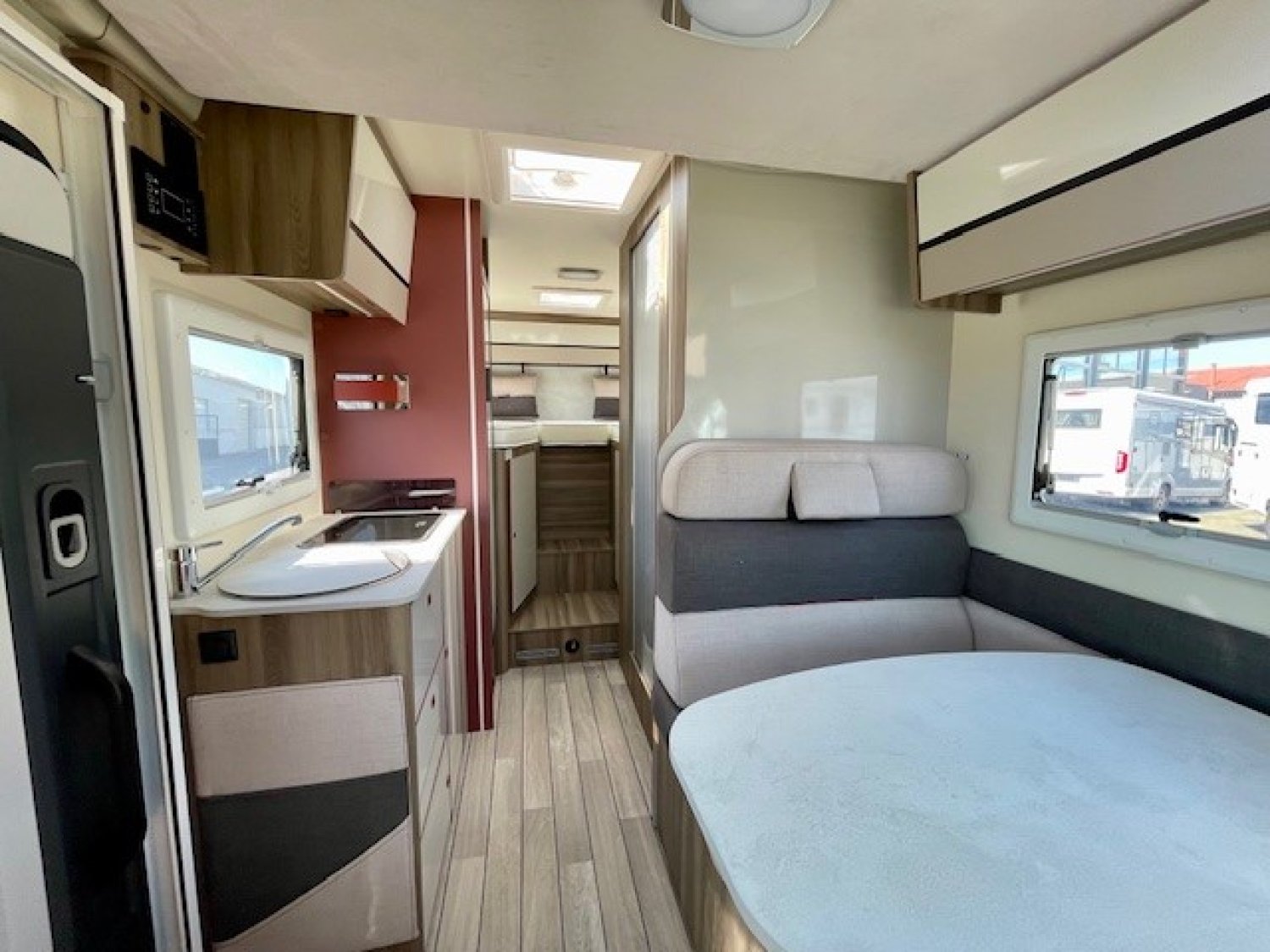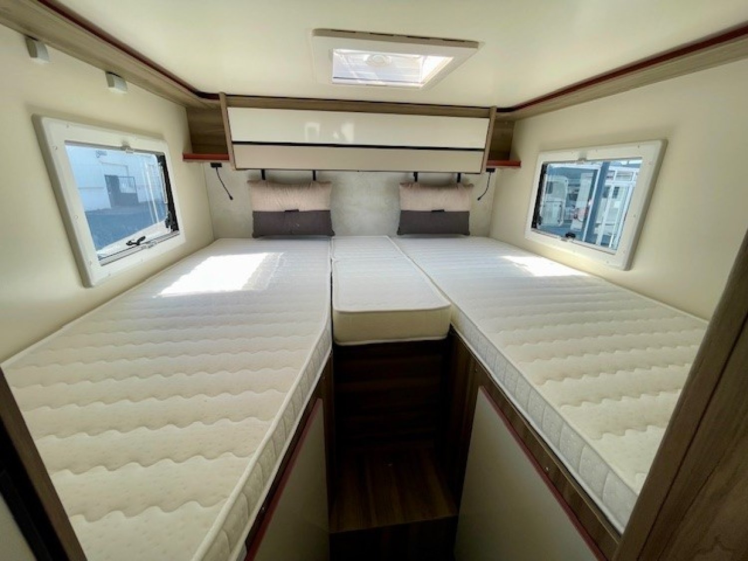 Rollerteam Kronos Fit 281TL, petit profilé compact de 2,15m de large avec lits jumeaux sur soute. Seulement 6,69m de long, un grand salon, salle de bain avec paroi pivotante, lits jumeaux sur grande soute et lit pavillon.