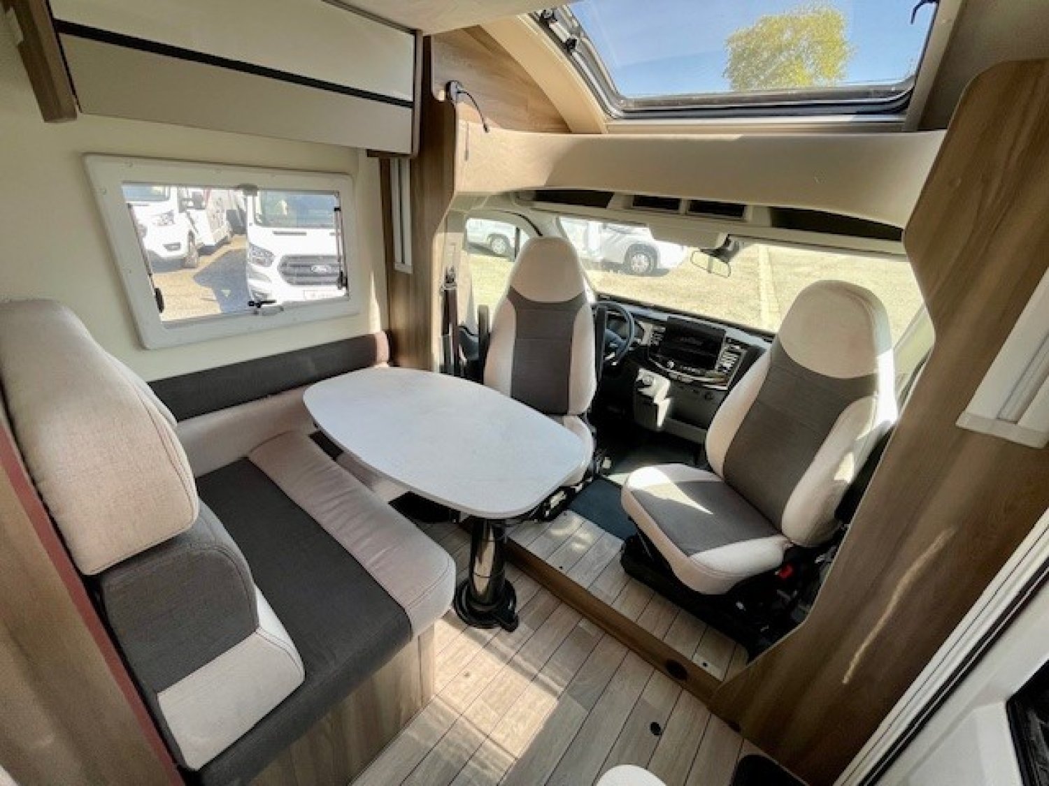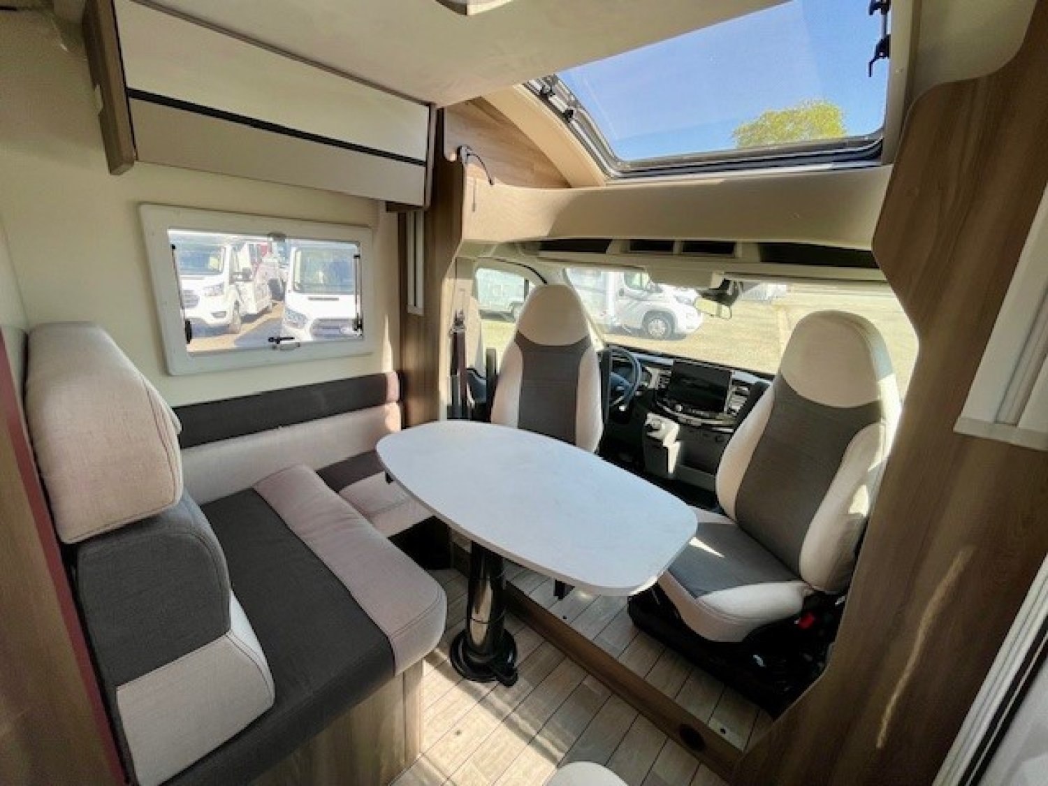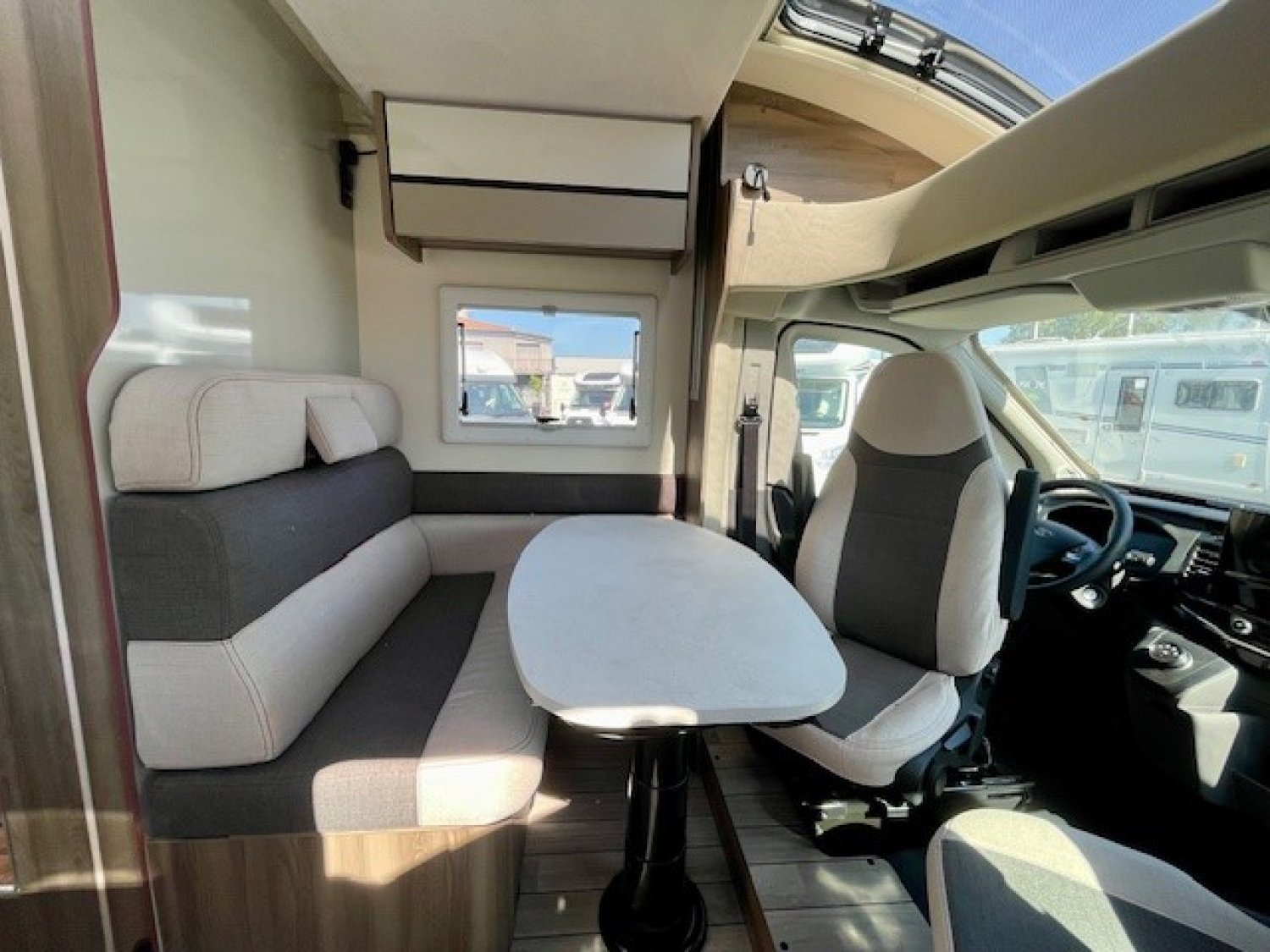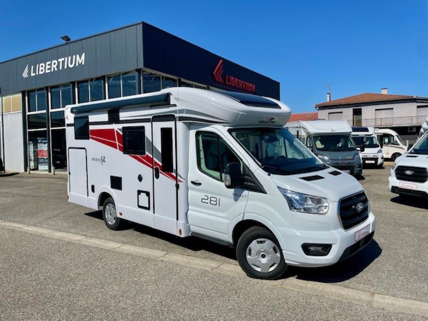 Rollerteam Kronos Fit 281TL, petit profilé compact de 2,15m de large avec lits jumeaux sur soute. Seulement 6,69m de long, un grand salon, salle de bain avec paroi pivotante, lits jumeaux sur grande soute et lit pavillon.