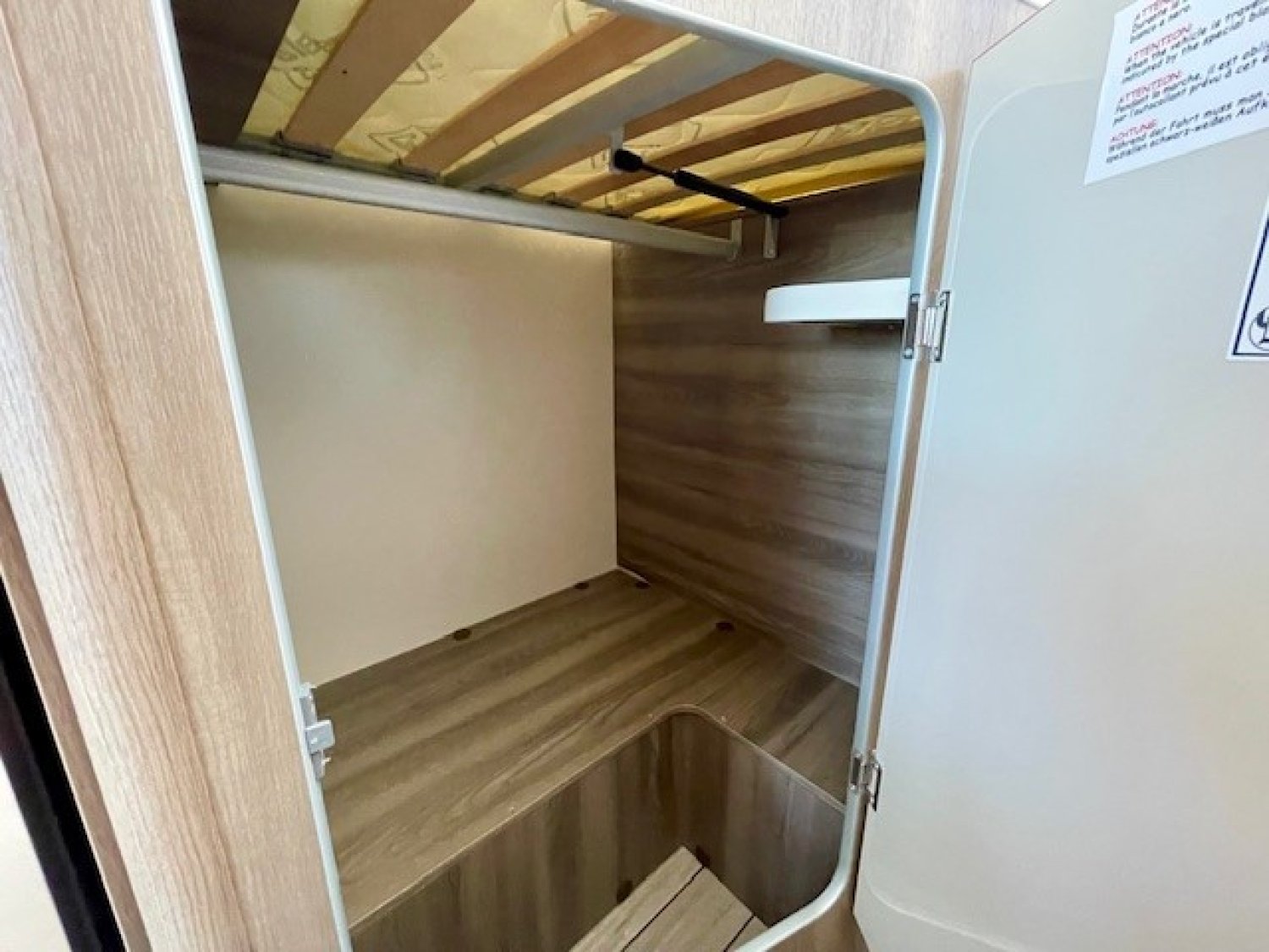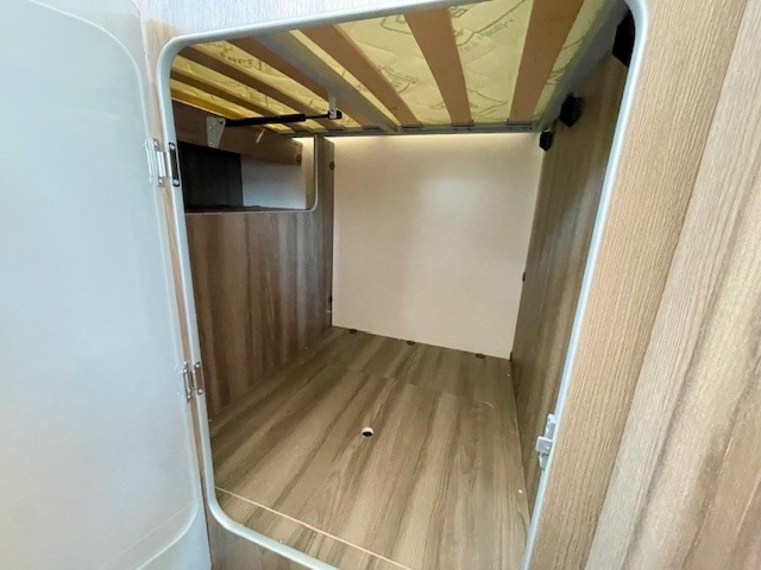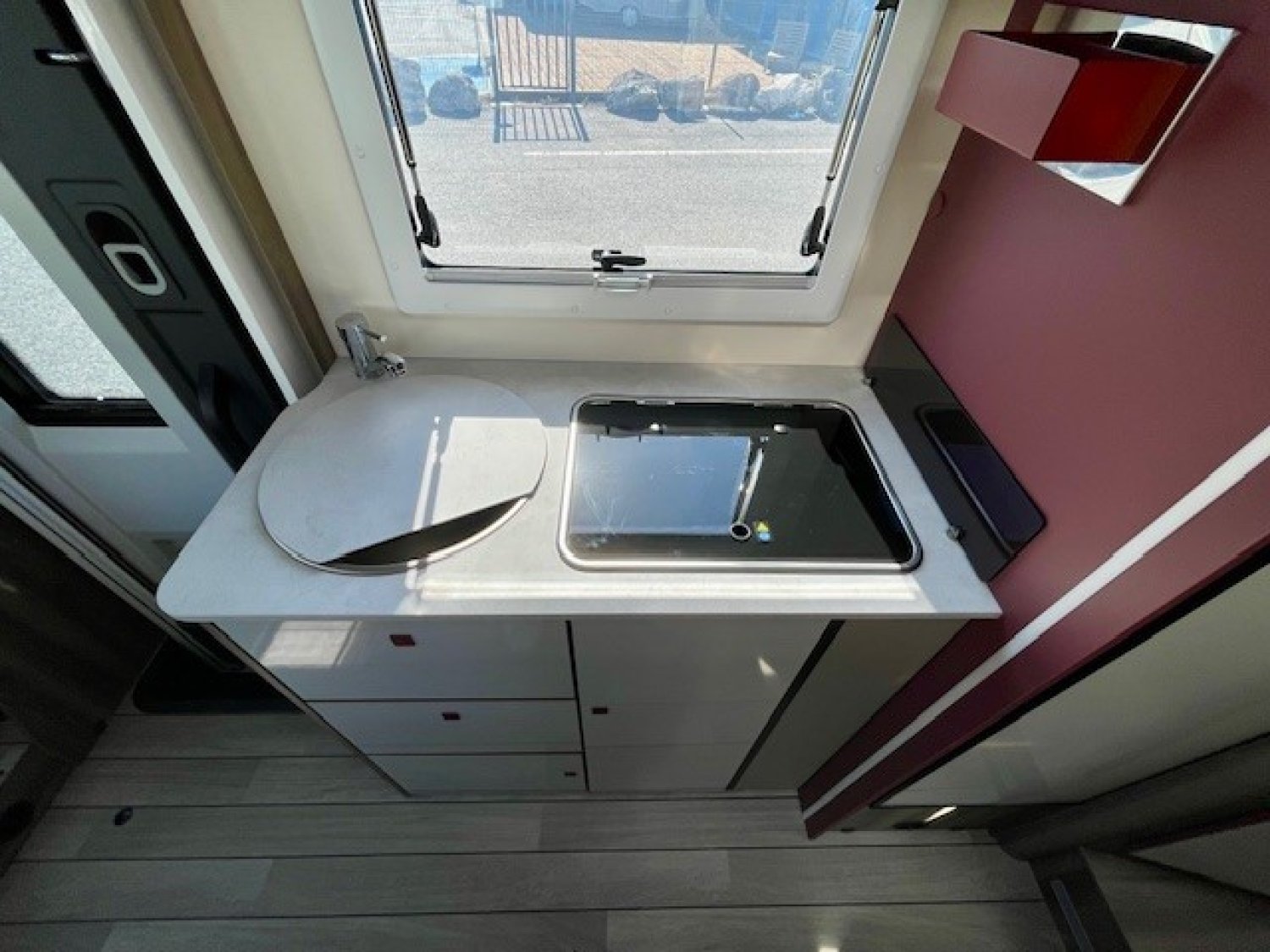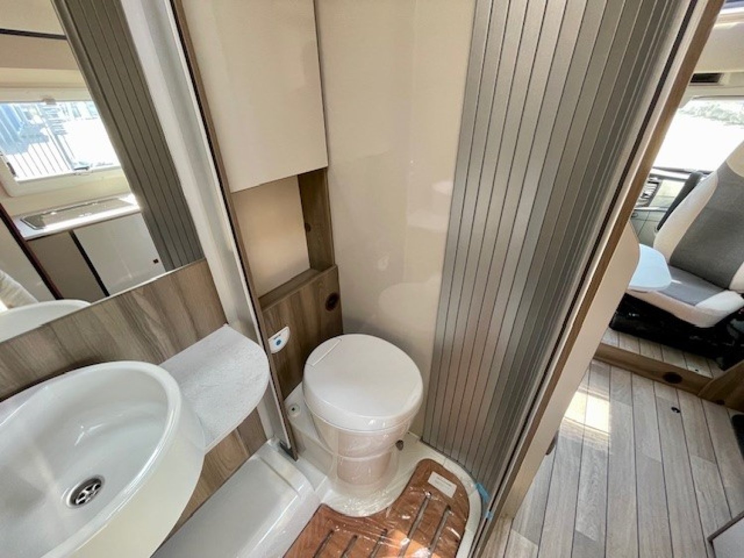 Rollerteam Kronos Fit 281TL, petit profilé compact de 2,15m de large avec lits jumeaux sur soute. Seulement 6,69m de long, un grand salon, salle de bain avec paroi pivotante, lits jumeaux sur grande soute et lit pavillon.