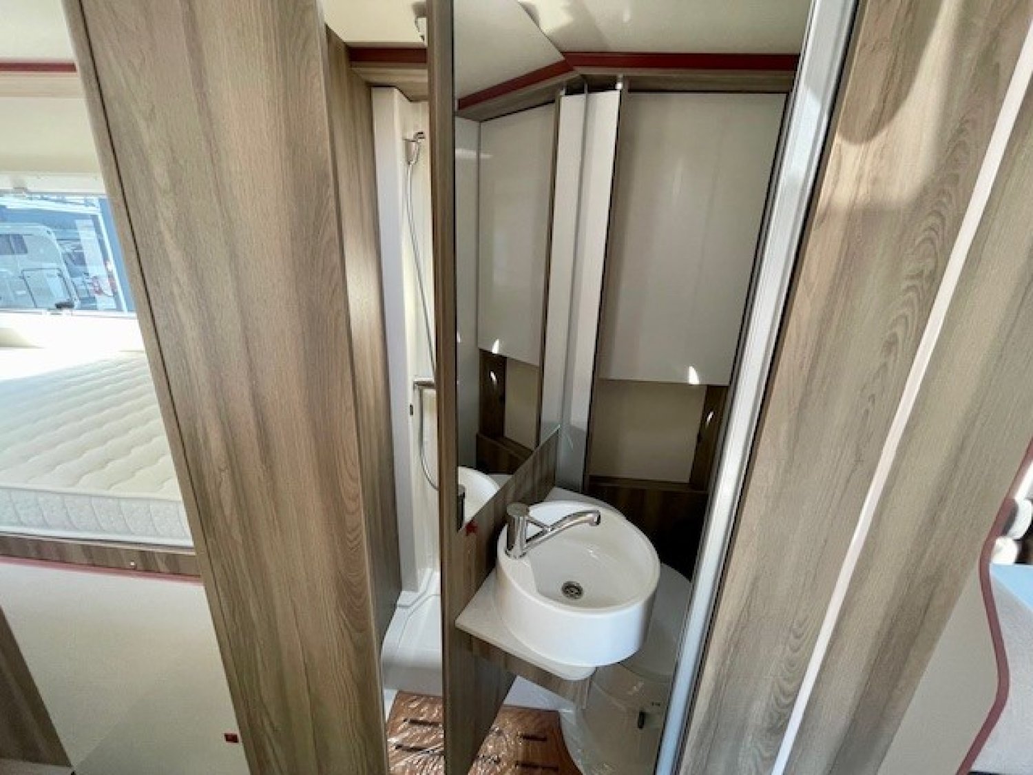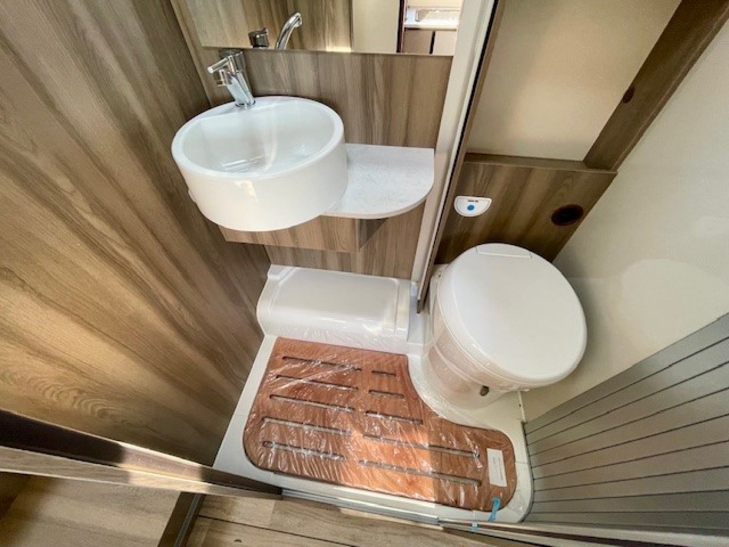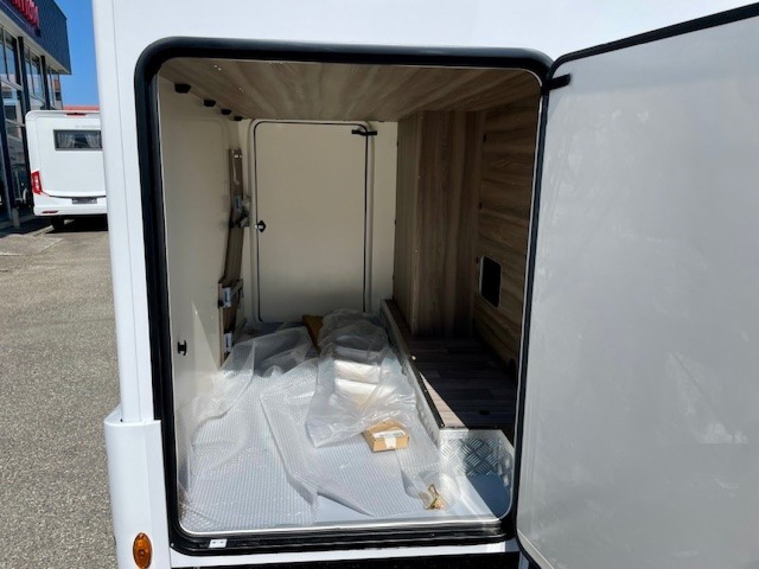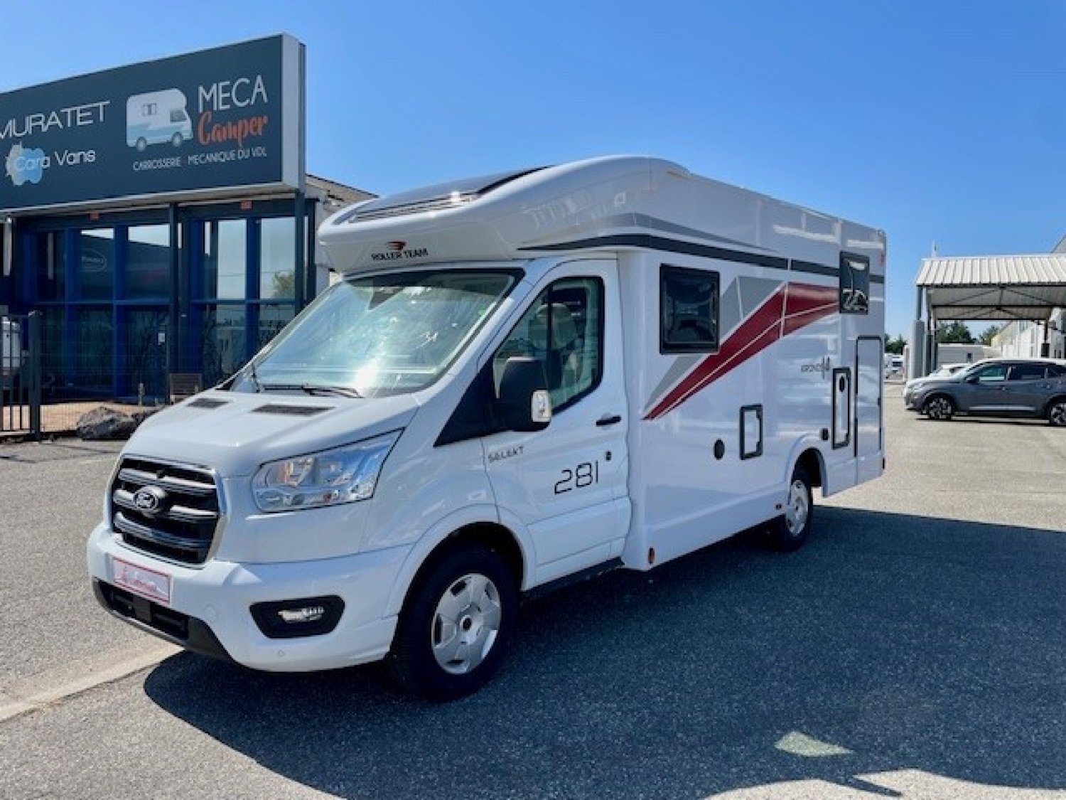 Rollerteam Kronos Fit 281TL, petit profilé compact de 2,15m de large avec lits jumeaux sur soute. Seulement 6,69m de long, un grand salon, salle de bain avec paroi pivotante, lits jumeaux sur grande soute et lit pavillon.