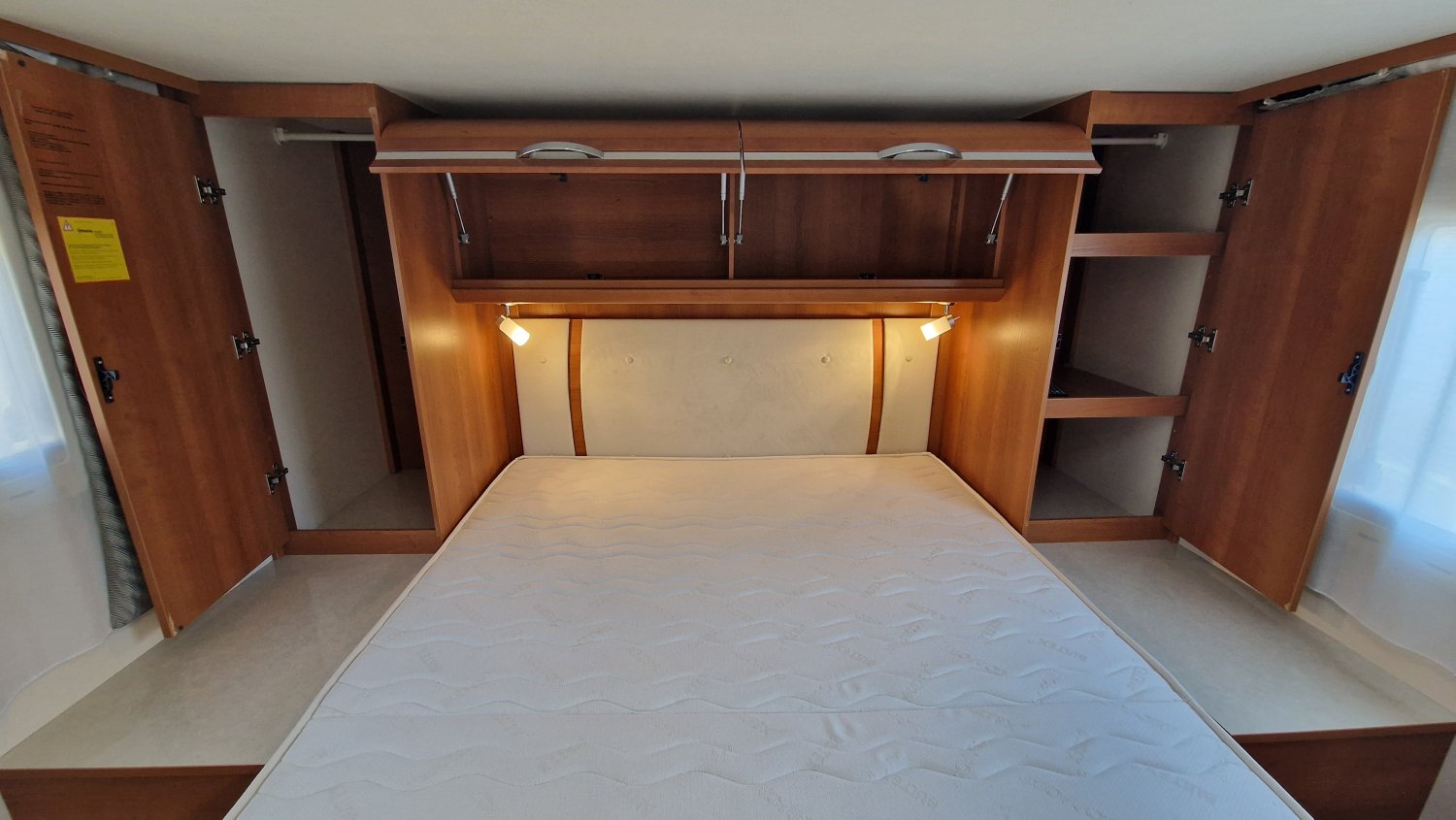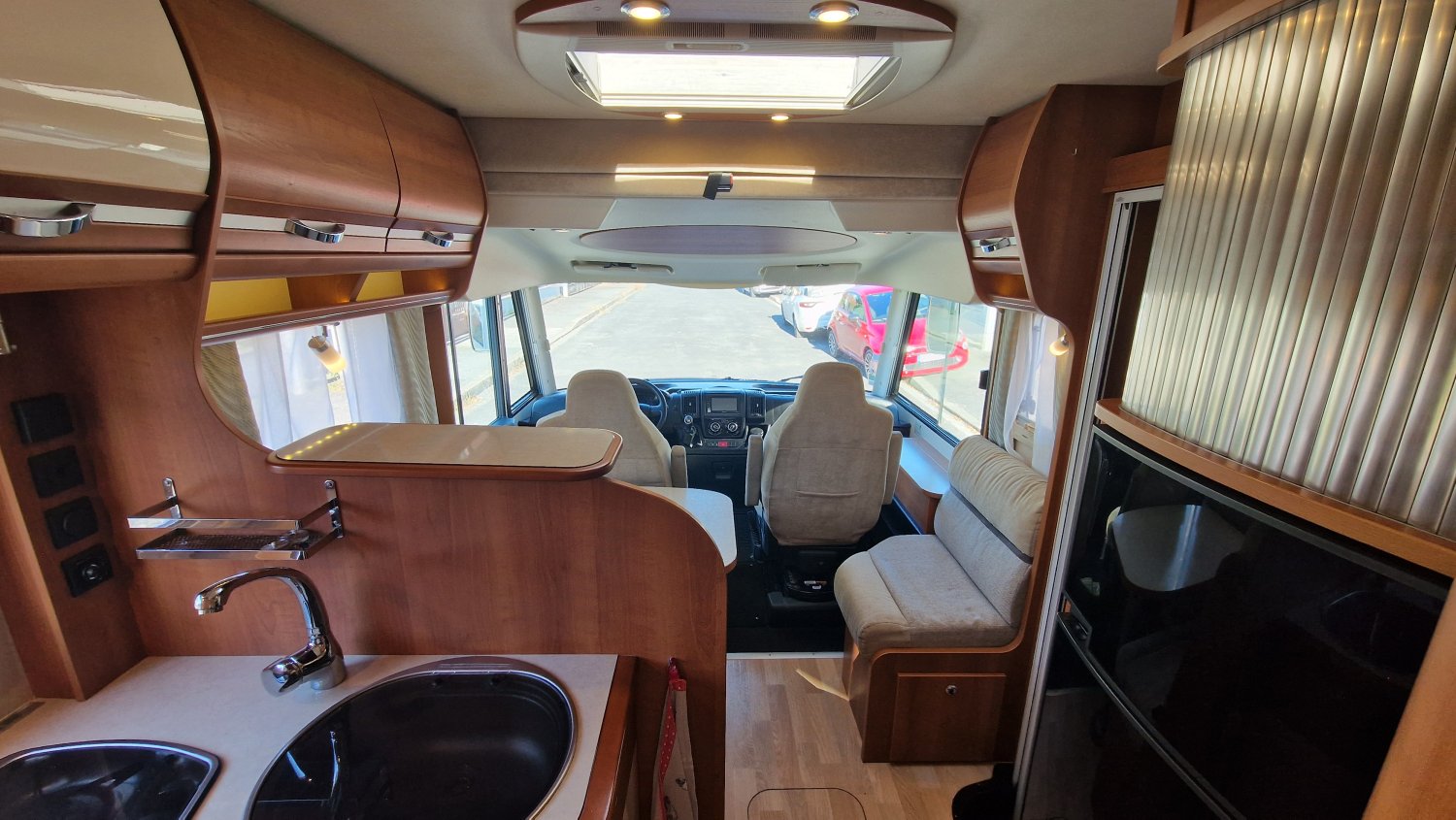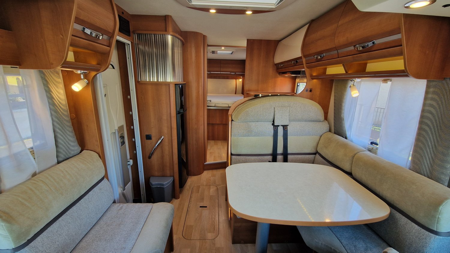 Implantation idéale pour voyager en duo ou plus à l’occasion : couchages douillets avec lit central réglable en hauteur + lit de pavillon, double cloison de séparation pour préserver votre intimité et salle d'eau lumineuse avec espace de douche et cabinet de toilette indépendants. Une cuisine fonctionnelle en L dotée d’un grand réfrigérateur et un salon spacieux avec vue panoramique vous permettront d’organiser la vie à bord en toute convivialité.