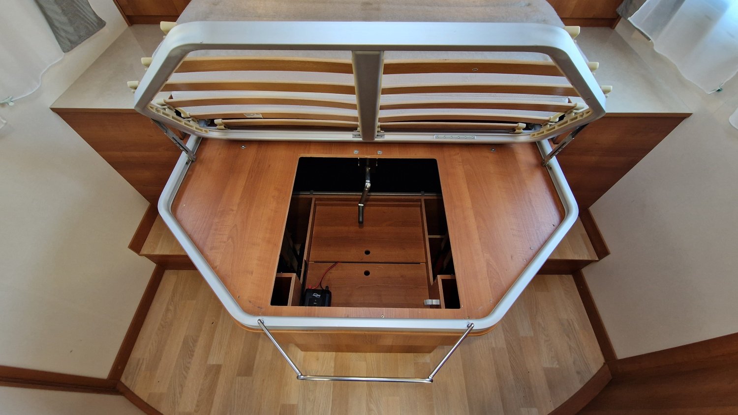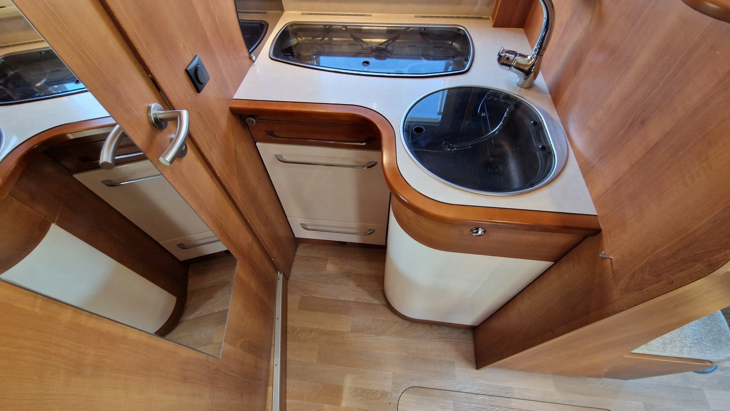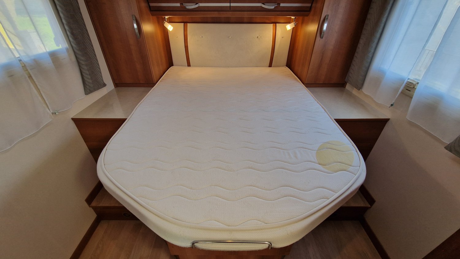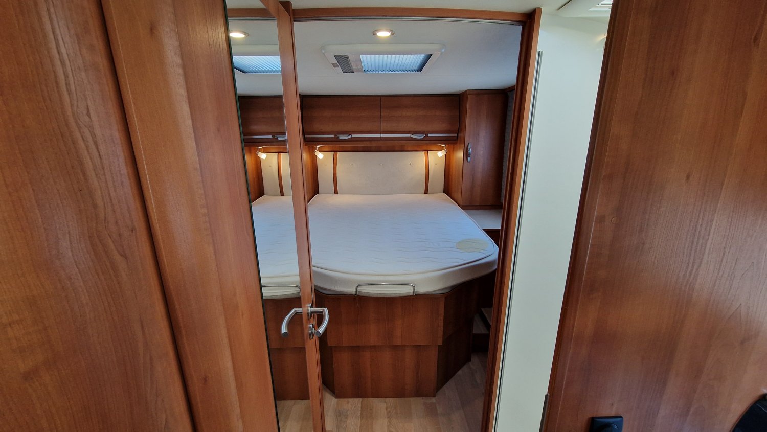 Implantation idéale pour voyager en duo ou plus à l’occasion : couchages douillets avec lit central réglable en hauteur + lit de pavillon, double cloison de séparation pour préserver votre intimité et salle d'eau lumineuse avec espace de douche et cabinet de toilette indépendants. Une cuisine fonctionnelle en L dotée d’un grand réfrigérateur et un salon spacieux avec vue panoramique vous permettront d’organiser la vie à bord en toute convivialité.