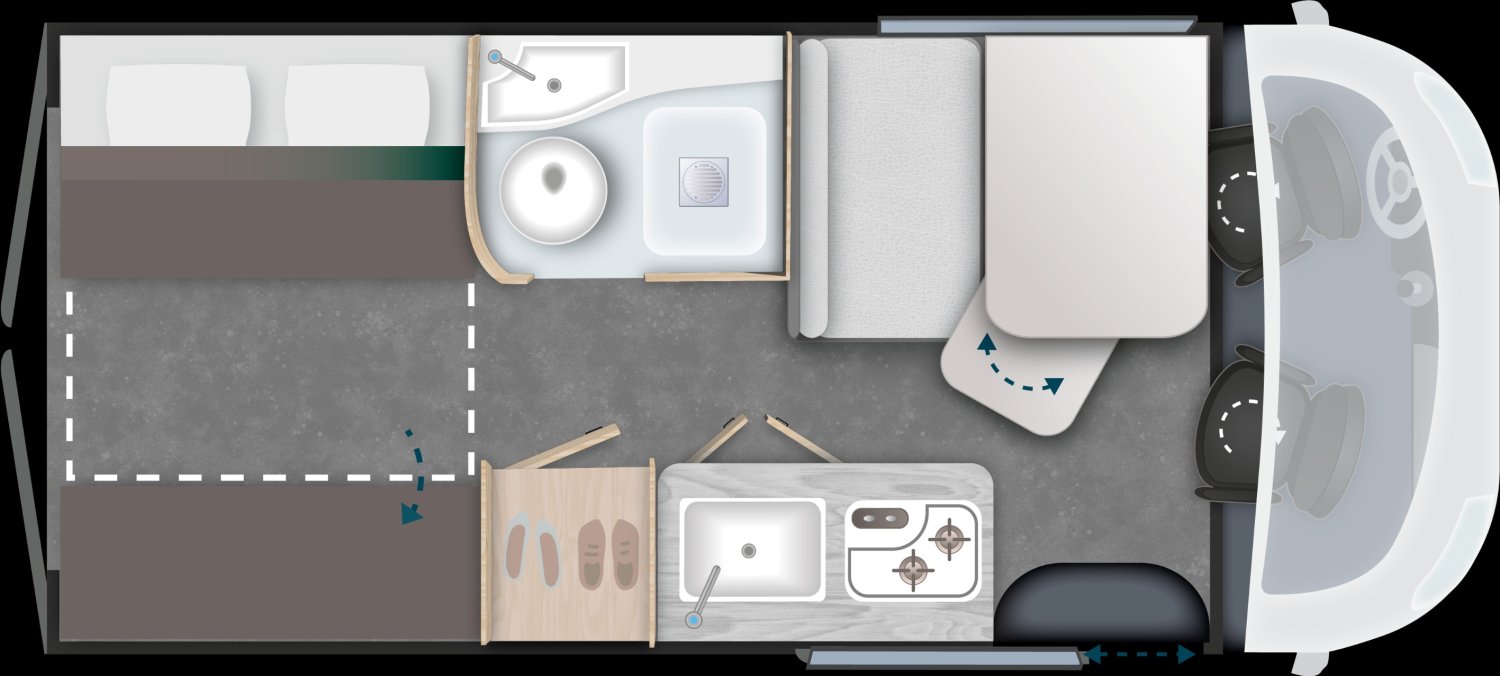 Jantes acier avec enjoliveurs 15'' gris, Pneus 4 saisons, Pré-équipement TV, Marchepied électrique, Prises USB/USB-C, Salle d'eau avec fenêtre, Climatisation manuelle de cabine, Régulateur / limiteur de vitesse, Rideaux d’isolation thermique des baies de cabine, Précâblage caméra de recul, Baies arrière ouvrantes, Chauffage au gaz, ESP, Eco pack FIAT, Lanterneau panoramique, Rétroviseurs électriques dégivrants, Fenêtres double-vitrage avec combiné stores moustiquaire