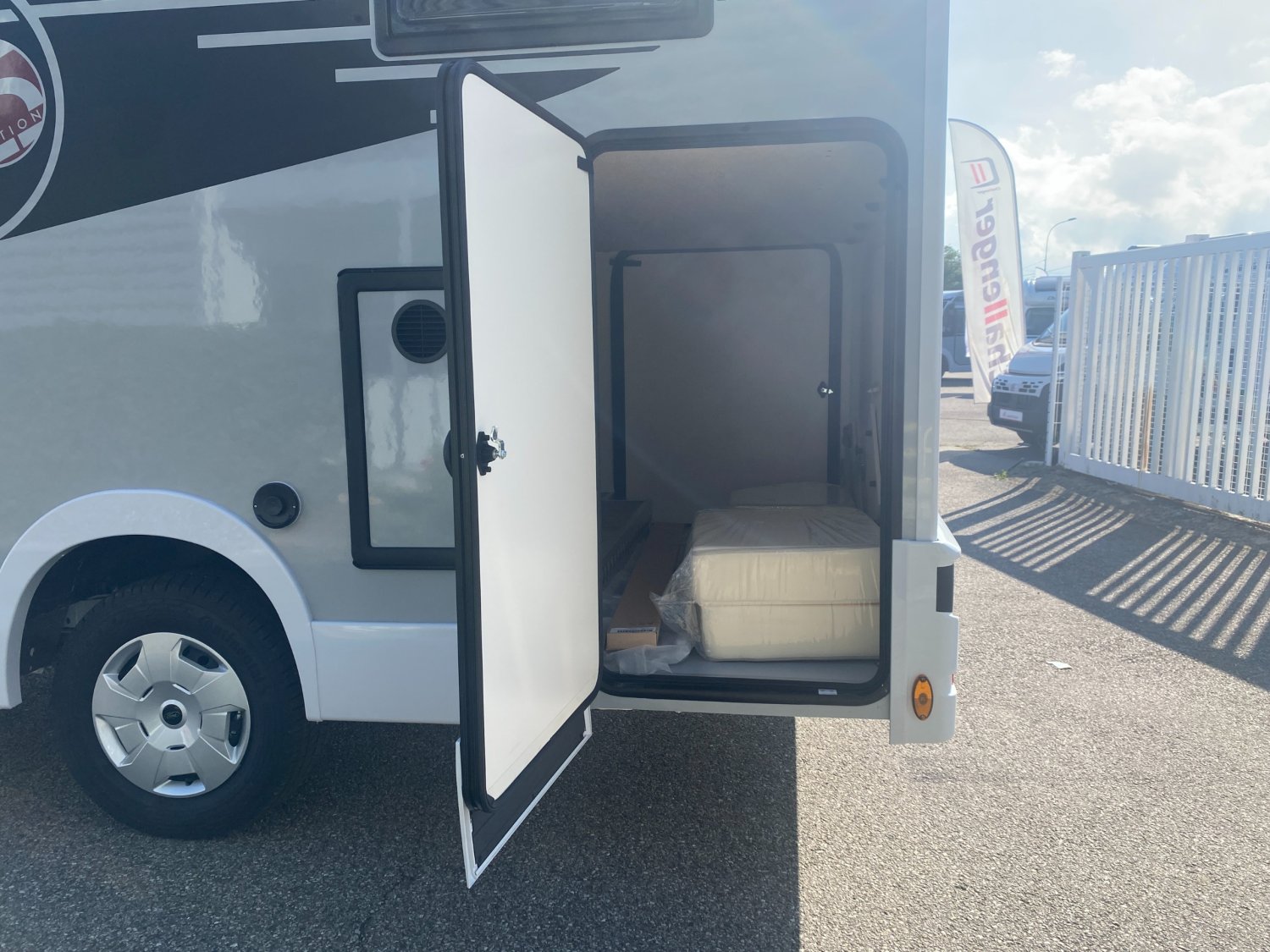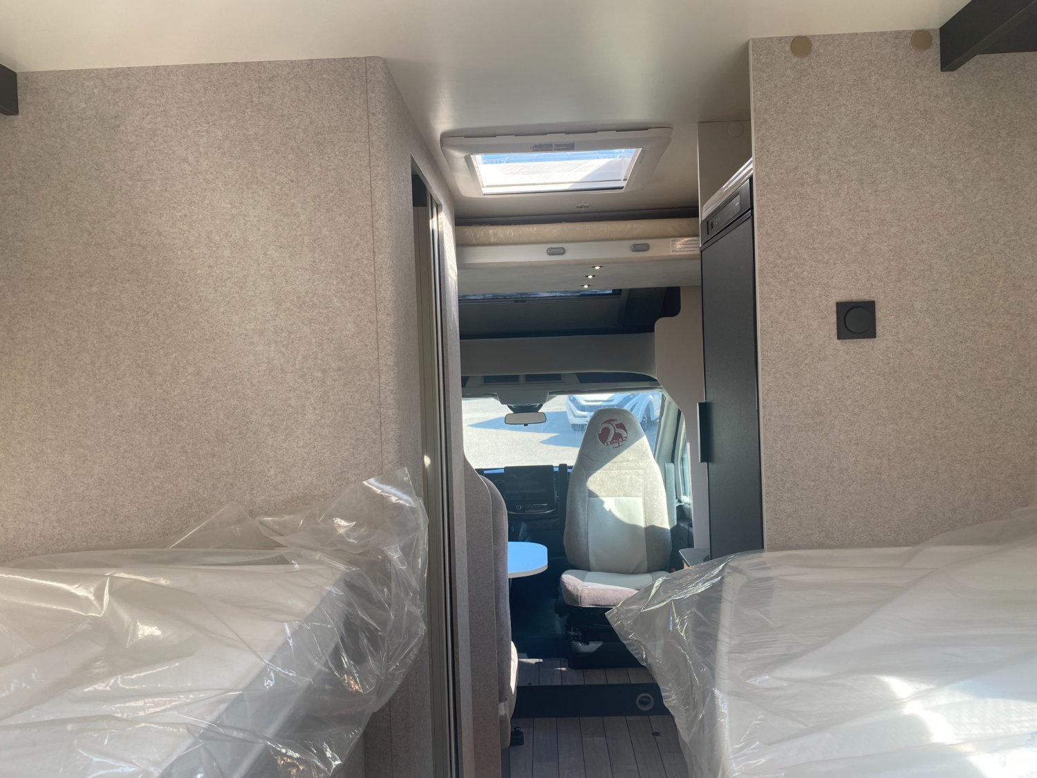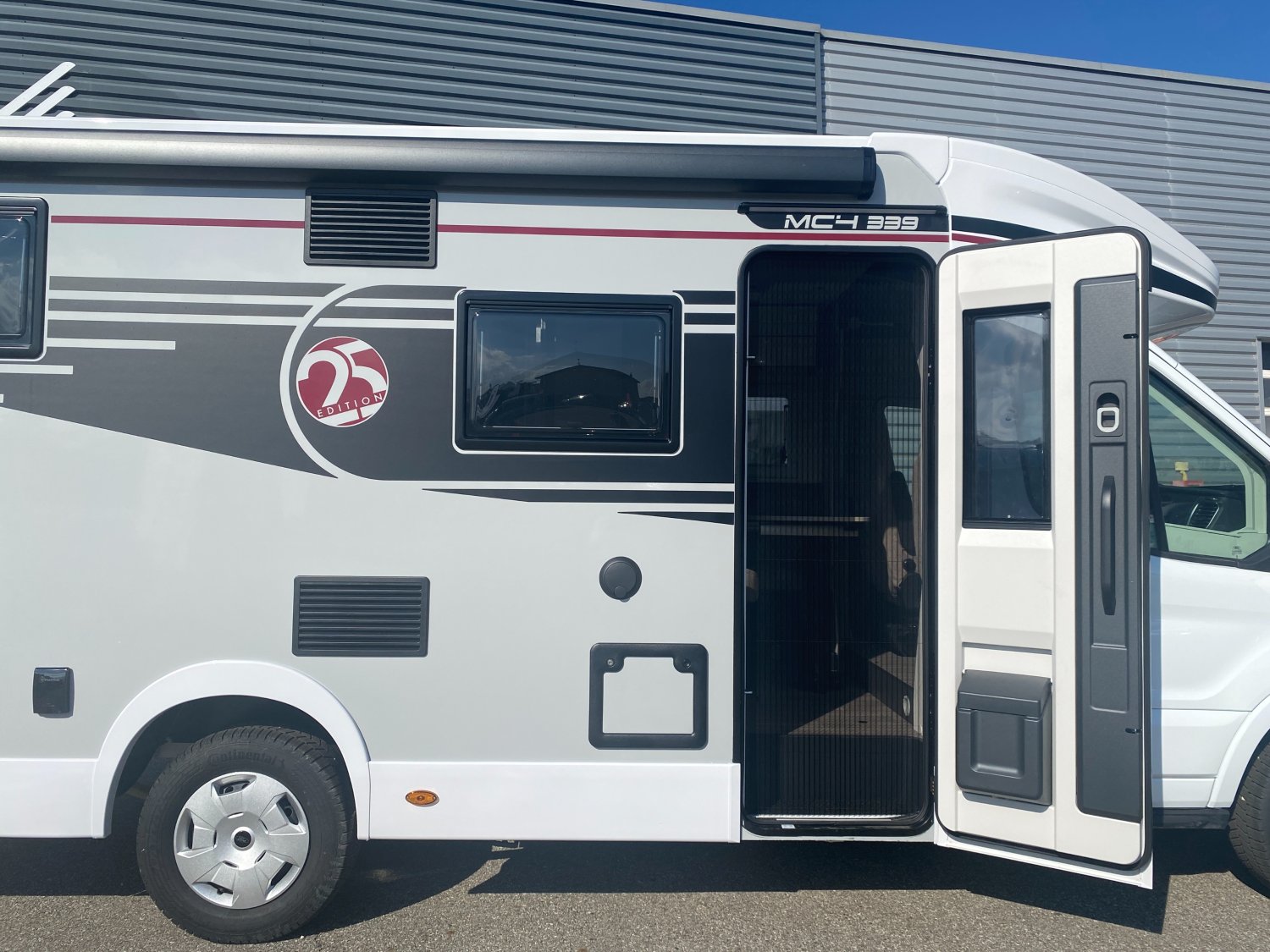 Le Slim 339 est un profilé avec une largeur réduite à 2.15m et une longueur de 6.69m. Il dispose d'une très grande soute garage avec des lits jumeaux, faciles d'accès. Sa salle de bain type Vario permet un gain de place à l'intérieur du véhicule. La version série limité 25eme Edition offre un niveau d'équipement important et une motorisation de 165 cv avec boite automatique.