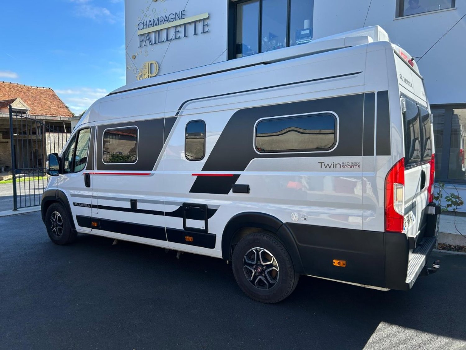 FOURGON ADRIA 640SGX TWIN SPORT. Fiat Ducato 2.2l 180chx Boite auto 9 vitesses. Attelage,Caméra de recul,Panneau solaire,Store, Marche pied électrique, Radar de recul, Douchette extérieure ( eau chaude et froide ) Toit panoramique, Régulateur , limiteur de vitesse, Jantes alu 16 pouces, combiné store et moustiquaire, Chauffage Webasto Diesel, Climatisation cabine manuelle, Réfrigérateur à compression 136 litres, chauffe eau gaz, Sièges avant avec accoudoirs. Lit arrière relevable sur soute 195x1900.Toit relevable avec lit 125x200,