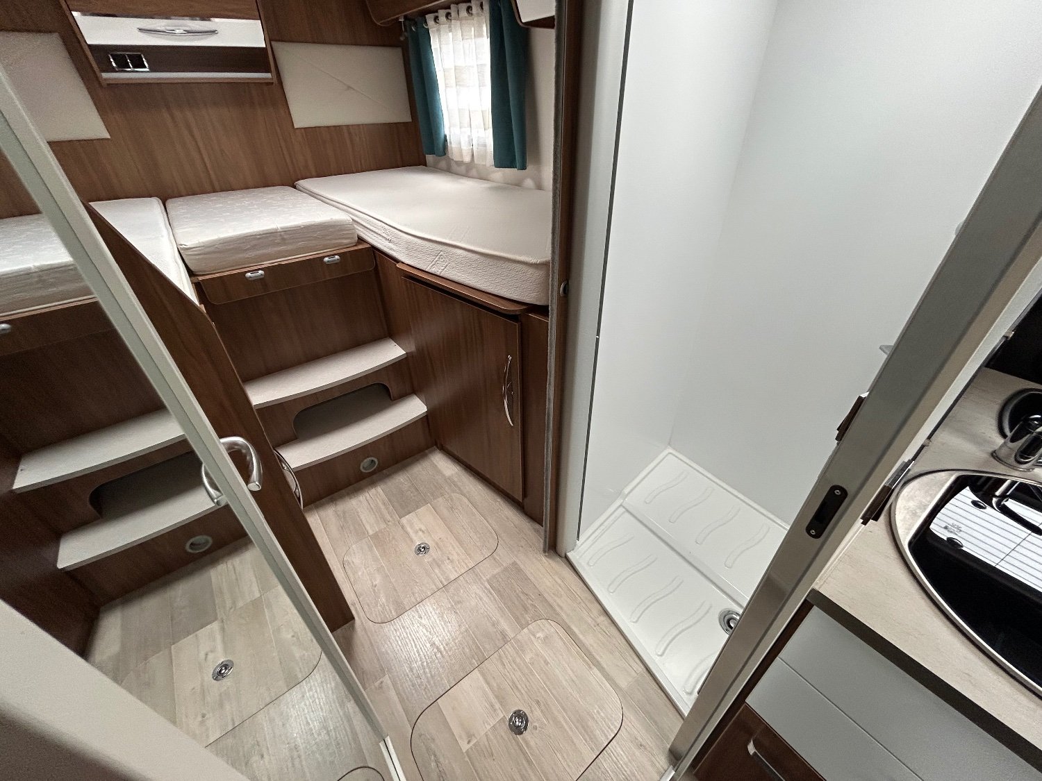 Ce véhicule vous offre , à l'arrière deux lits jumeaux sur soute , une douche et wc séparé , belle cuisine en L et grand réfrigérateur 170 l , à l'avant un beau et grand salon pour finir avec son lit escamotable 2 places au-dessous la partie conductrice .