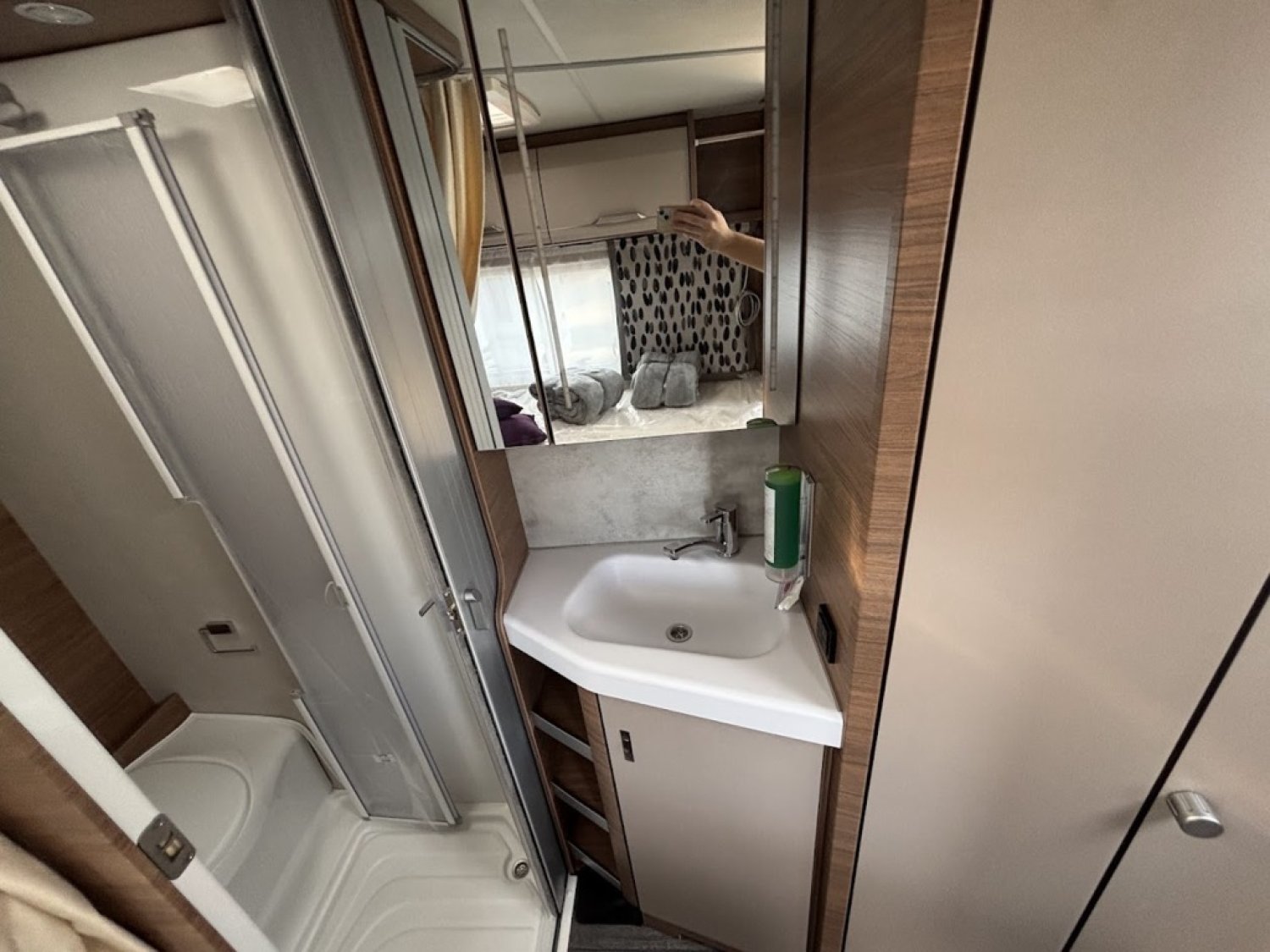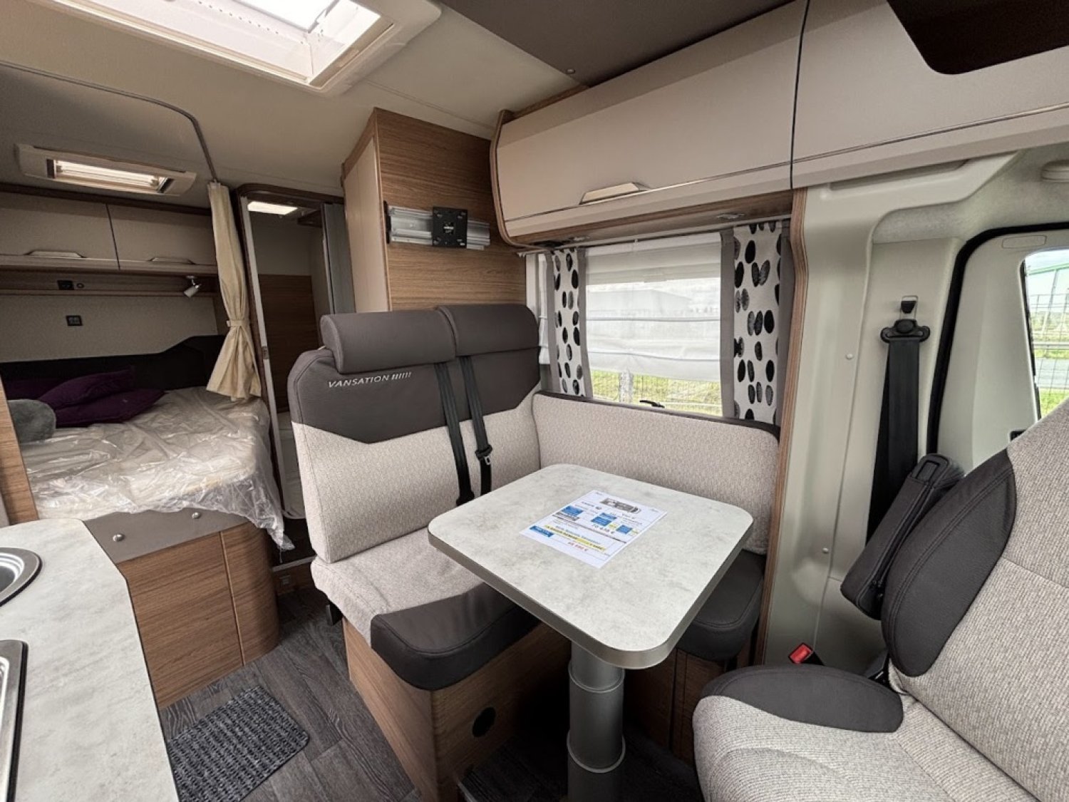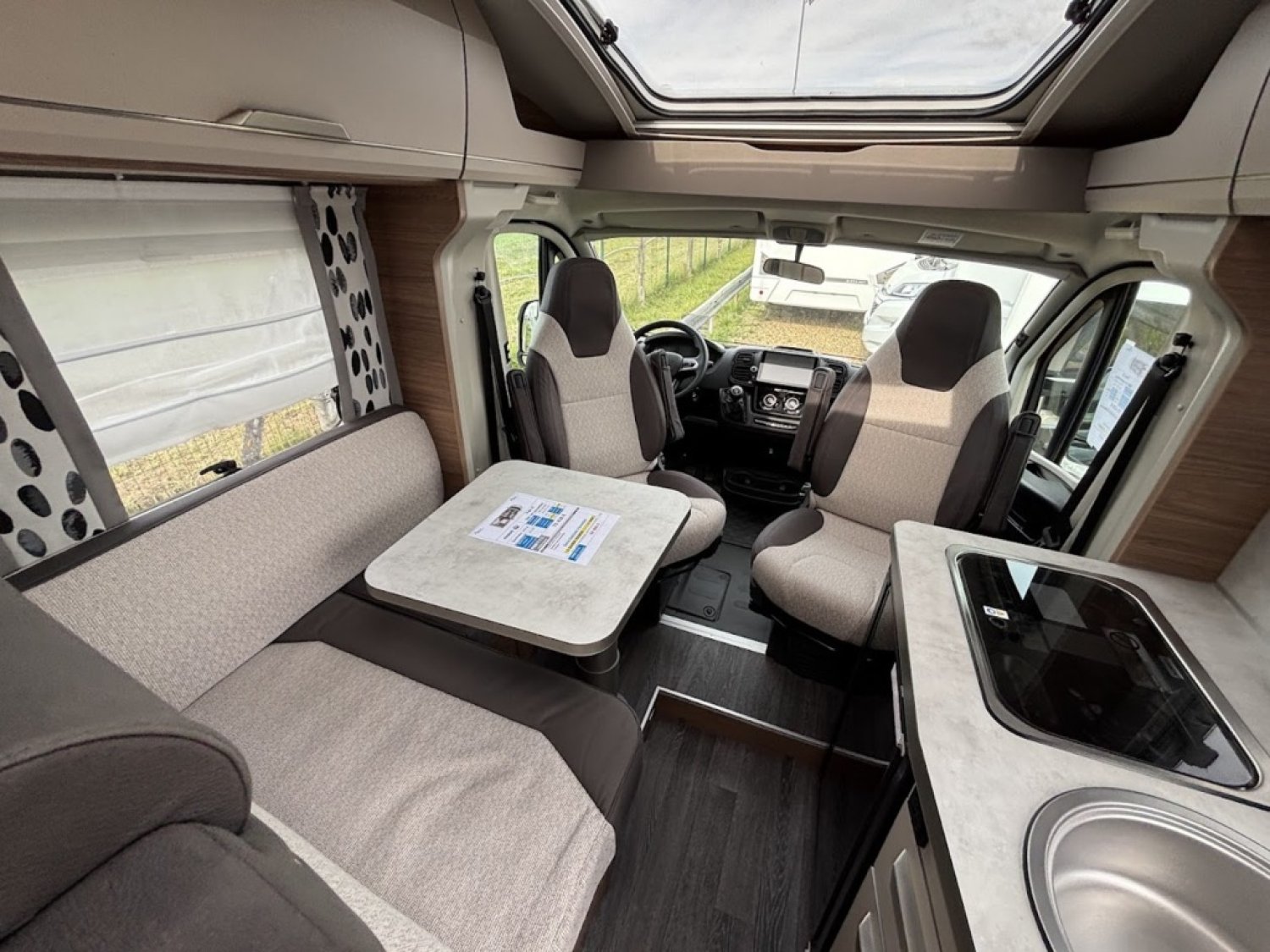 Bac de douche, Cuisine en long, Lit à la Française, Lit dînette avant, Salon avant sièges pivotants, Soute, WC Cassette.