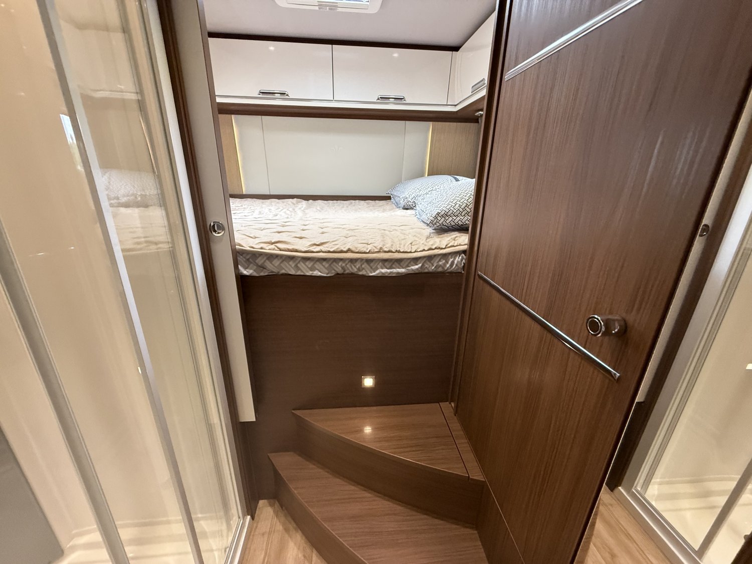 L’aménagement du Flair 840 L privilégie la fluidité et l’ergonomie. Le salon en L, convivial et lumineux, s’accompagne des sièges pivotants de cabine, permettant un espace de vie harmonieux et confortable. La cuisine haut de gamme dispose d’un four intégré, de grands tiroirs à fermeture amortie et de nombreux rangements astucieux. L’espace nuit, situé à l’arrière, abrite un lit transversal sur soute (220 × 150 cm), tandis qu’un lit de pavillon avant (195 × 140 cm) permet d’accueillir deux personnes supplémentaires. La salle d’eau indépendante offre une vaste douche et des finitions particulièrement soignées. L’ensemble profite de matériaux nobles, d’un éclairage LED indirect et d’une qualité d’assemblage exemplaire, reflet du savoir-faire Niesmann + Bischoff.