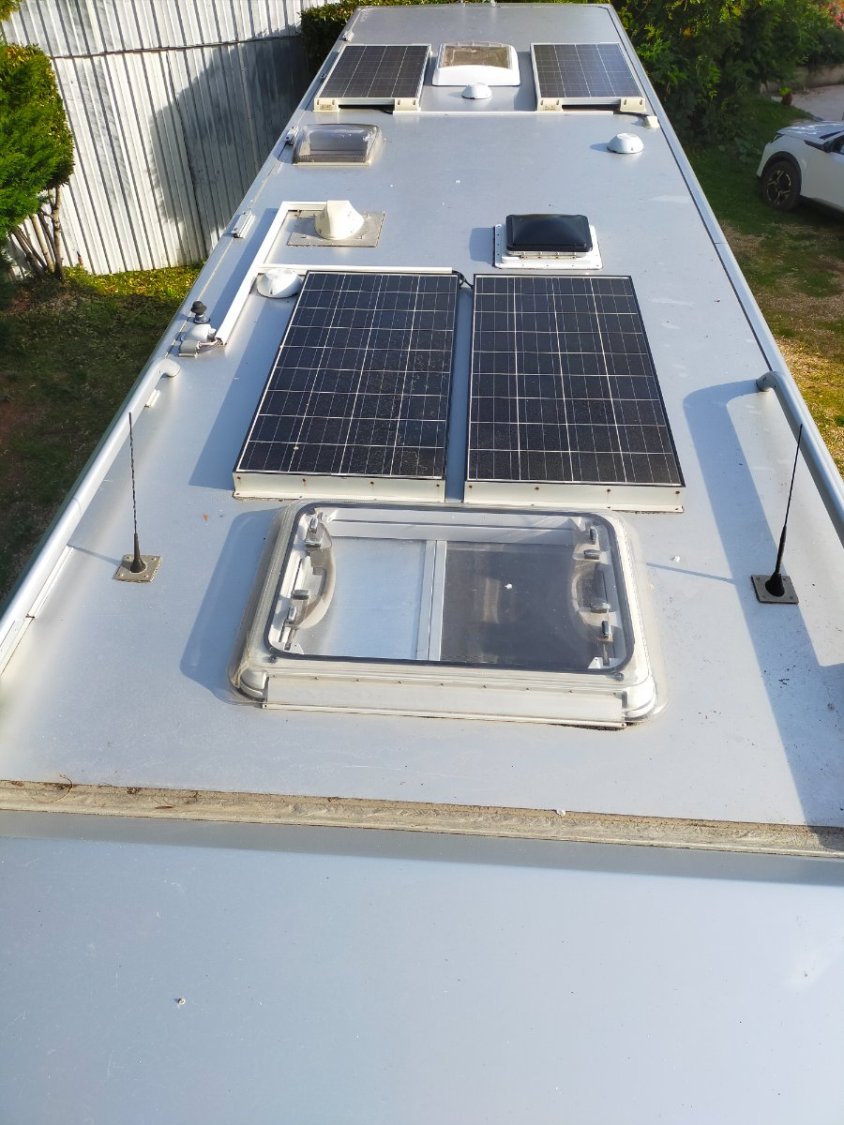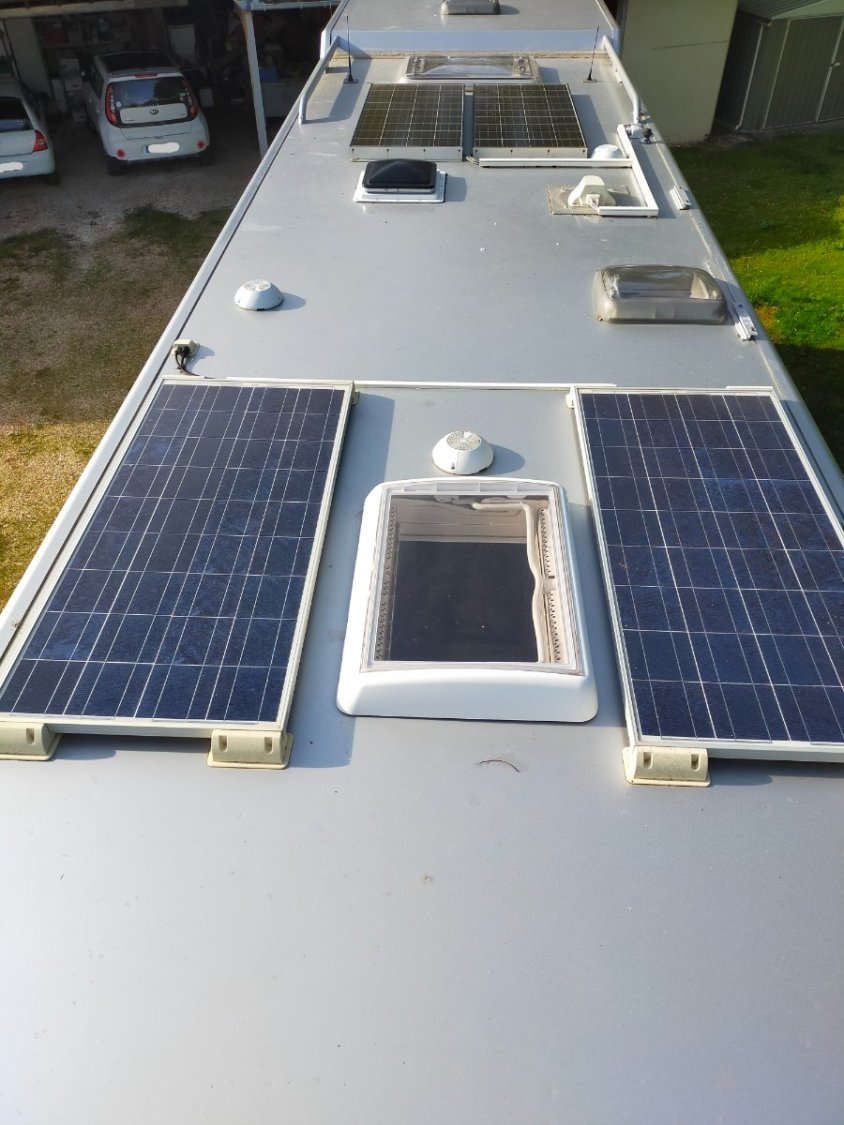 Batteries gel de 220 Ah, nombre 3 soit 660 Ah, 2 inverseurs 12 V/230 V Victron Énergie, 4 panneaux solaires