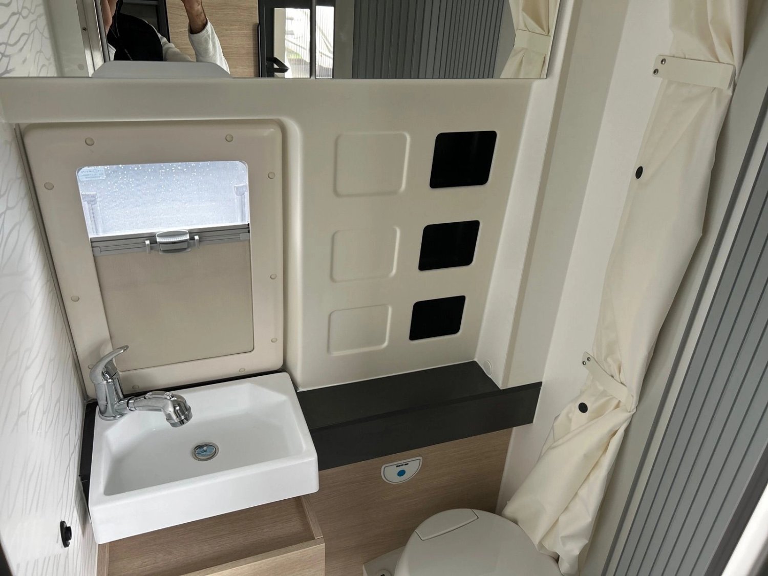 - Salle de bains fonctionnelle, avec revêtement parois protecteur, douche et WC à cassette