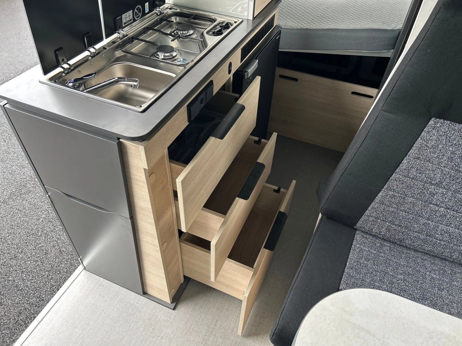 - Tiroirs avec coulisses à rappel et fermeture centralisée électrique avec alarme au démarrage moteur