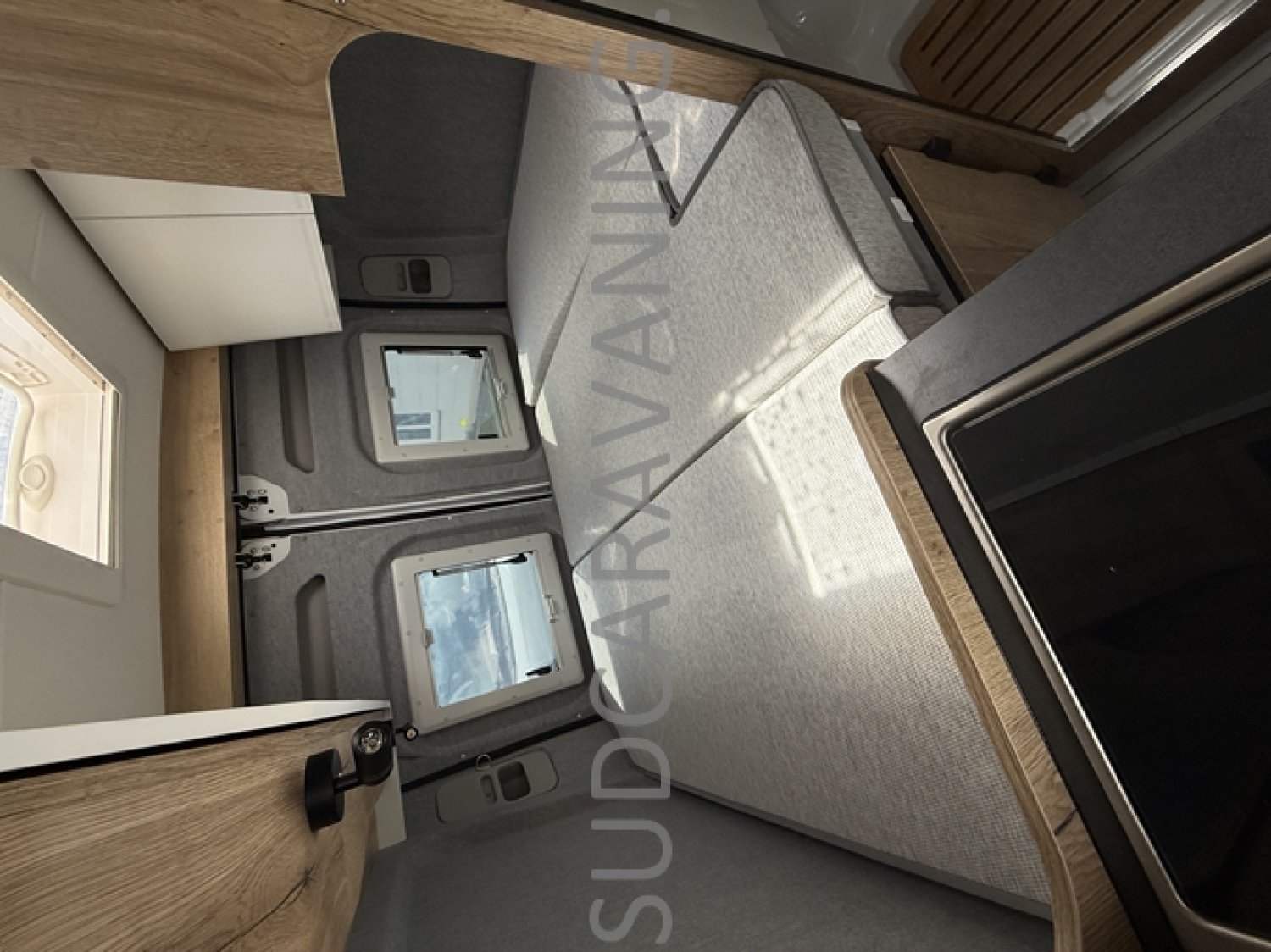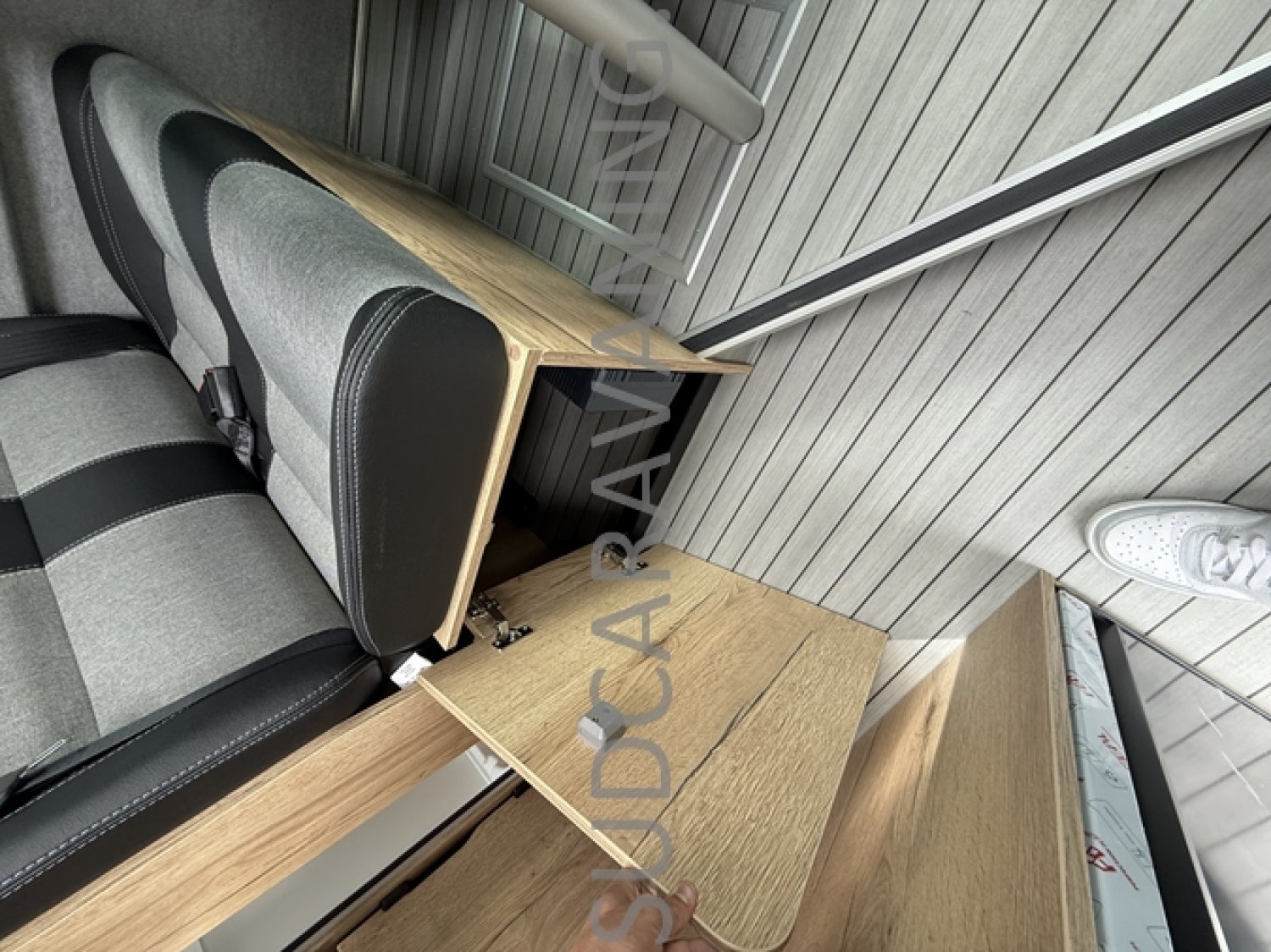 Ce magnifique fourgon de 5.40m avec sa maniabilité maximale, est équipé d’une dinette harmonieuse et lumineuse pour 4 personnes. Sa cuisine latérale fonctionnelle est dotée d’un réchaud 2 feux, d’un évier inox, de couvercles en verre, d’un réfrigérateur à double ouverture et d’un plan de travail haute résistance. En face, sa salle d’eau avec WC à cassette, lavabo escamotable, miroir et un caillebotis vous apportera une sensation de bien-être. A l’arrière, vous y retrouverez un lit transversal pour des nuits agréables et confortables. Sans oublier ses nombreux rangements astucieux.