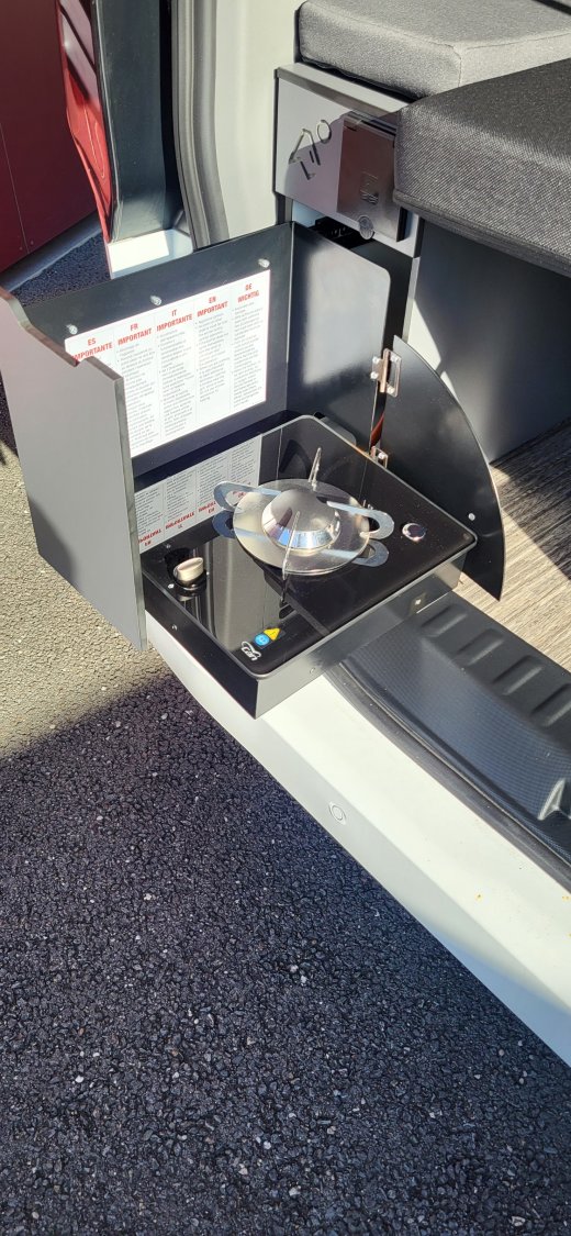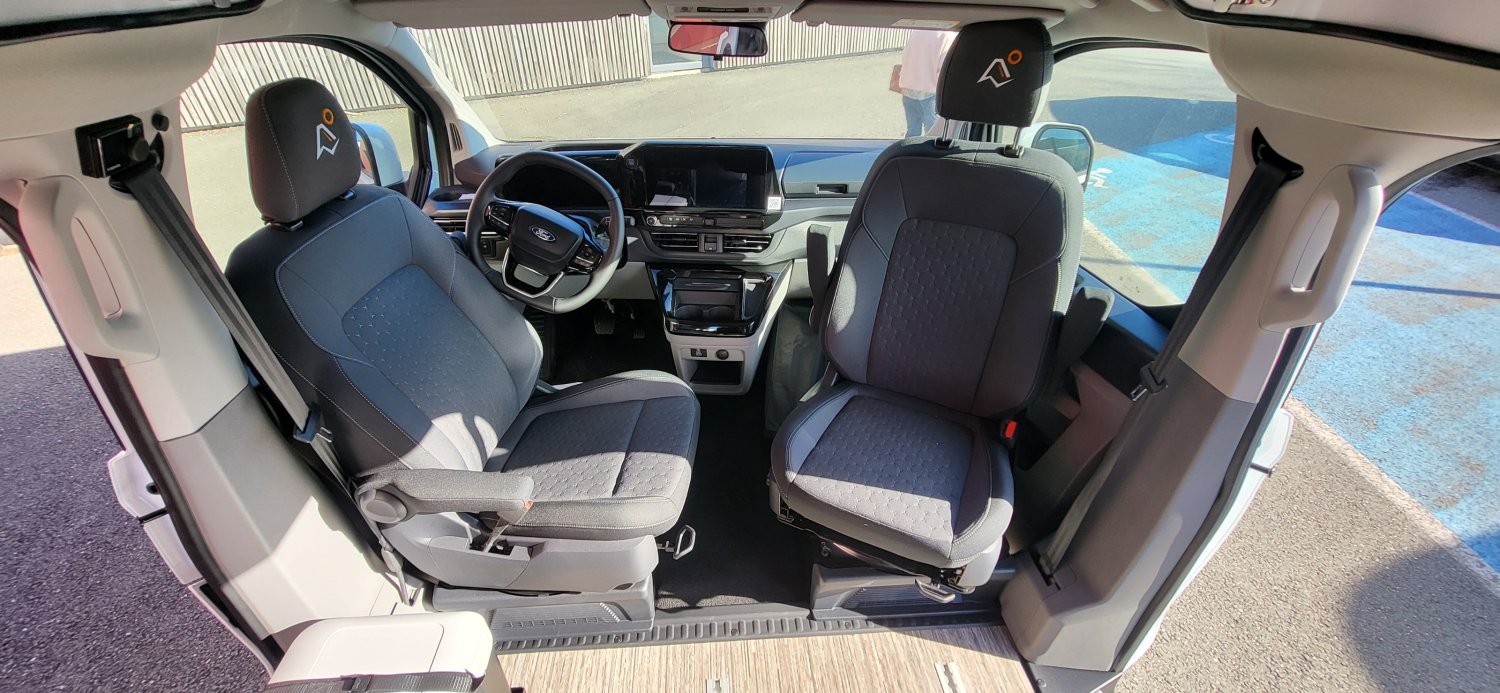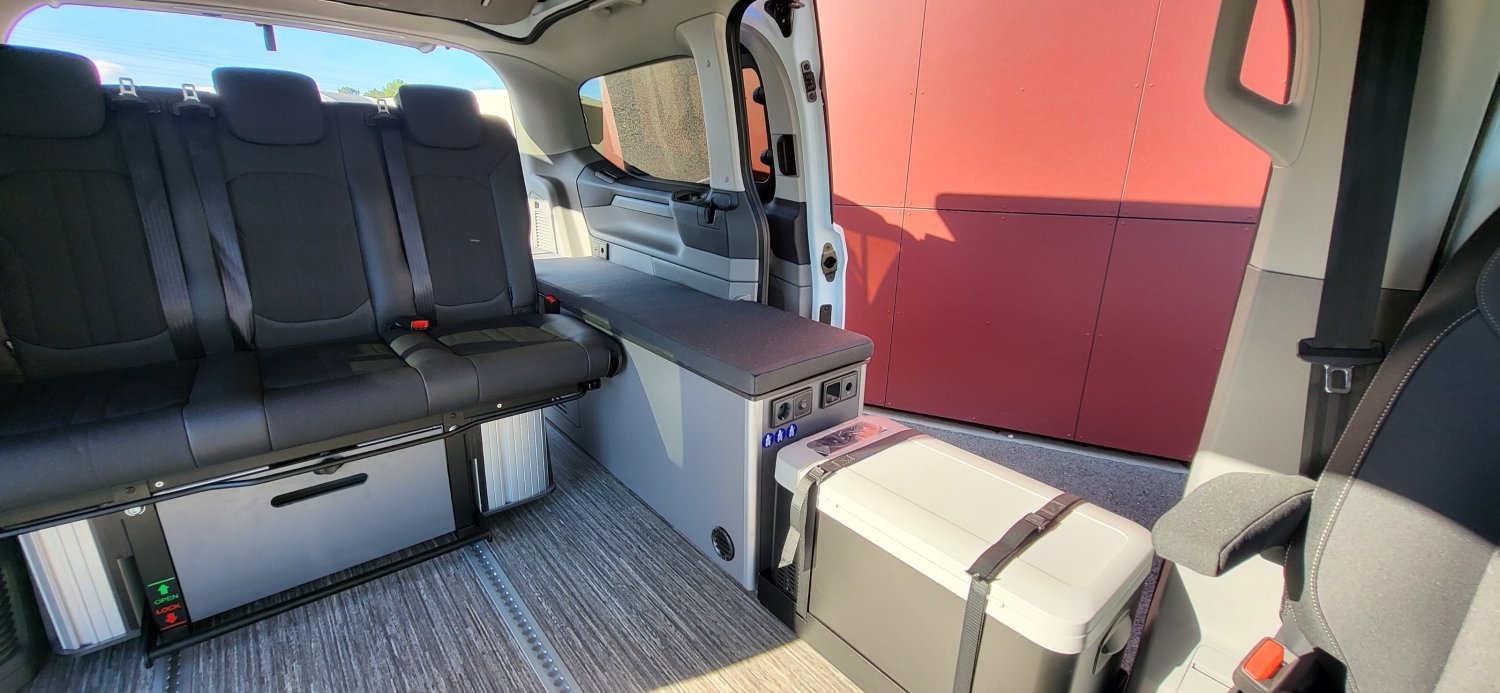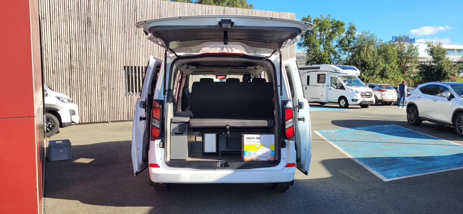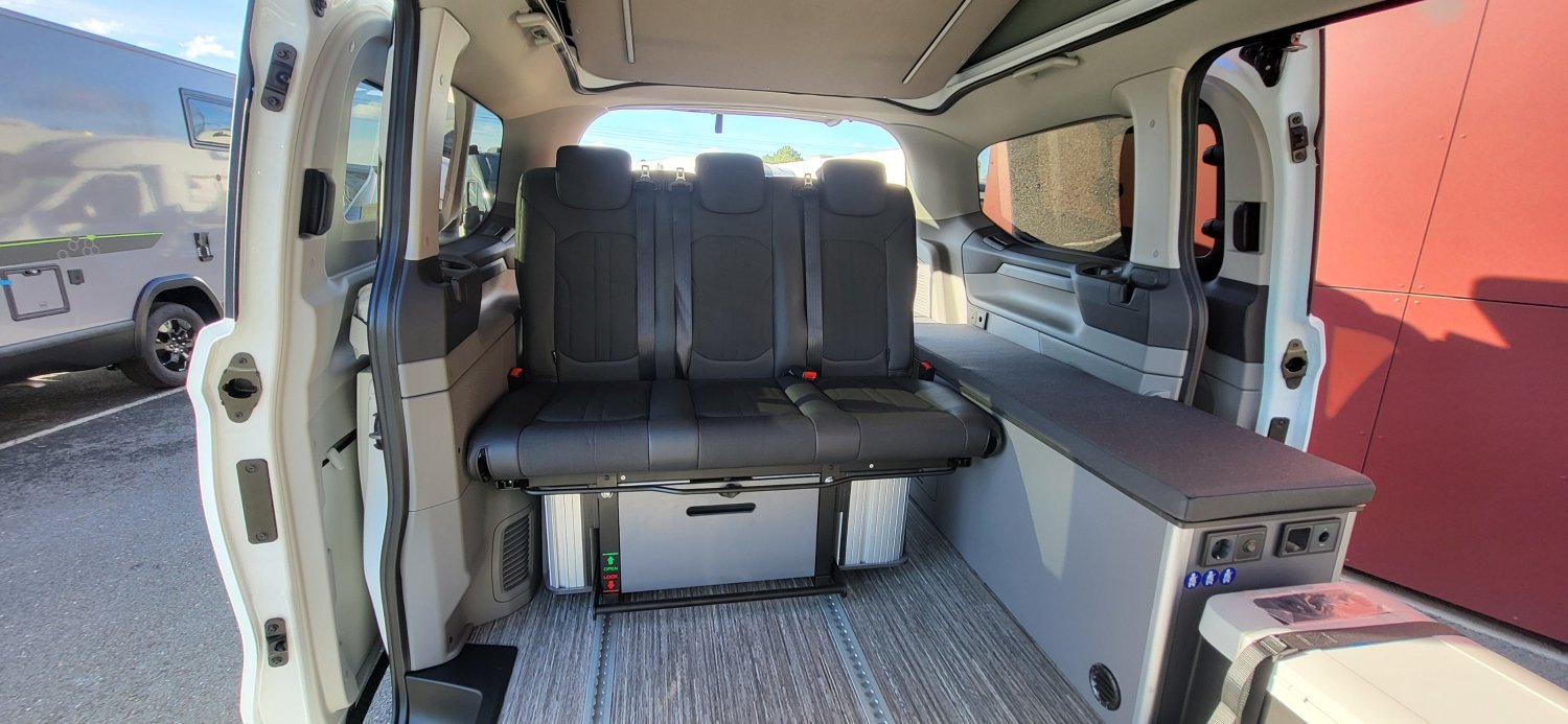 Son aménagement minimaliste offre une banquette coulissante convertible en lit (150×190 cm), une douchette extérieure avec réservoir d’eau de 10 L, et un coffre sans cloison fixe pour plus de modularité.